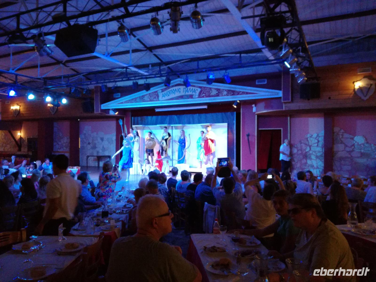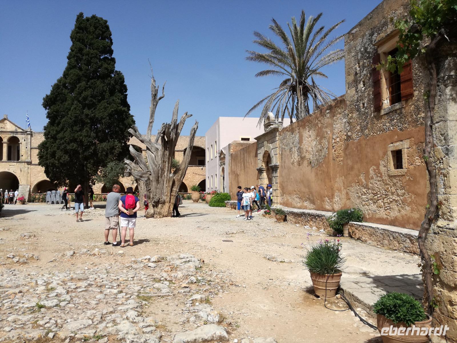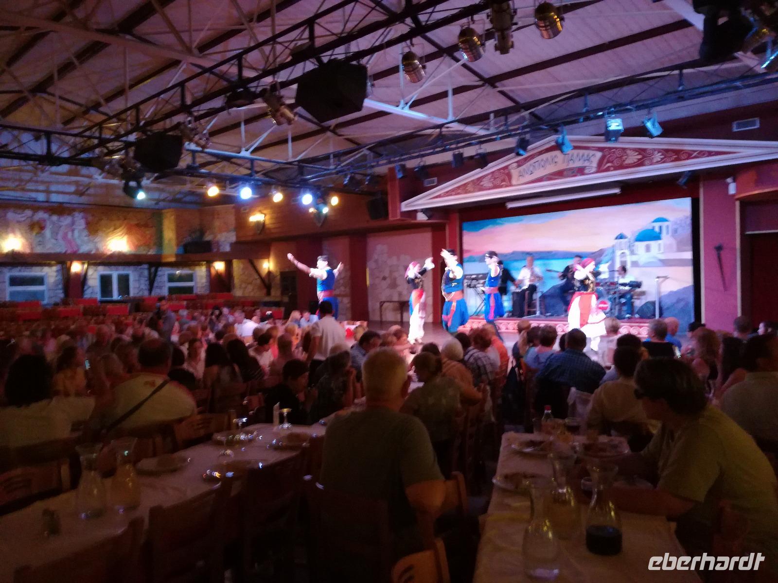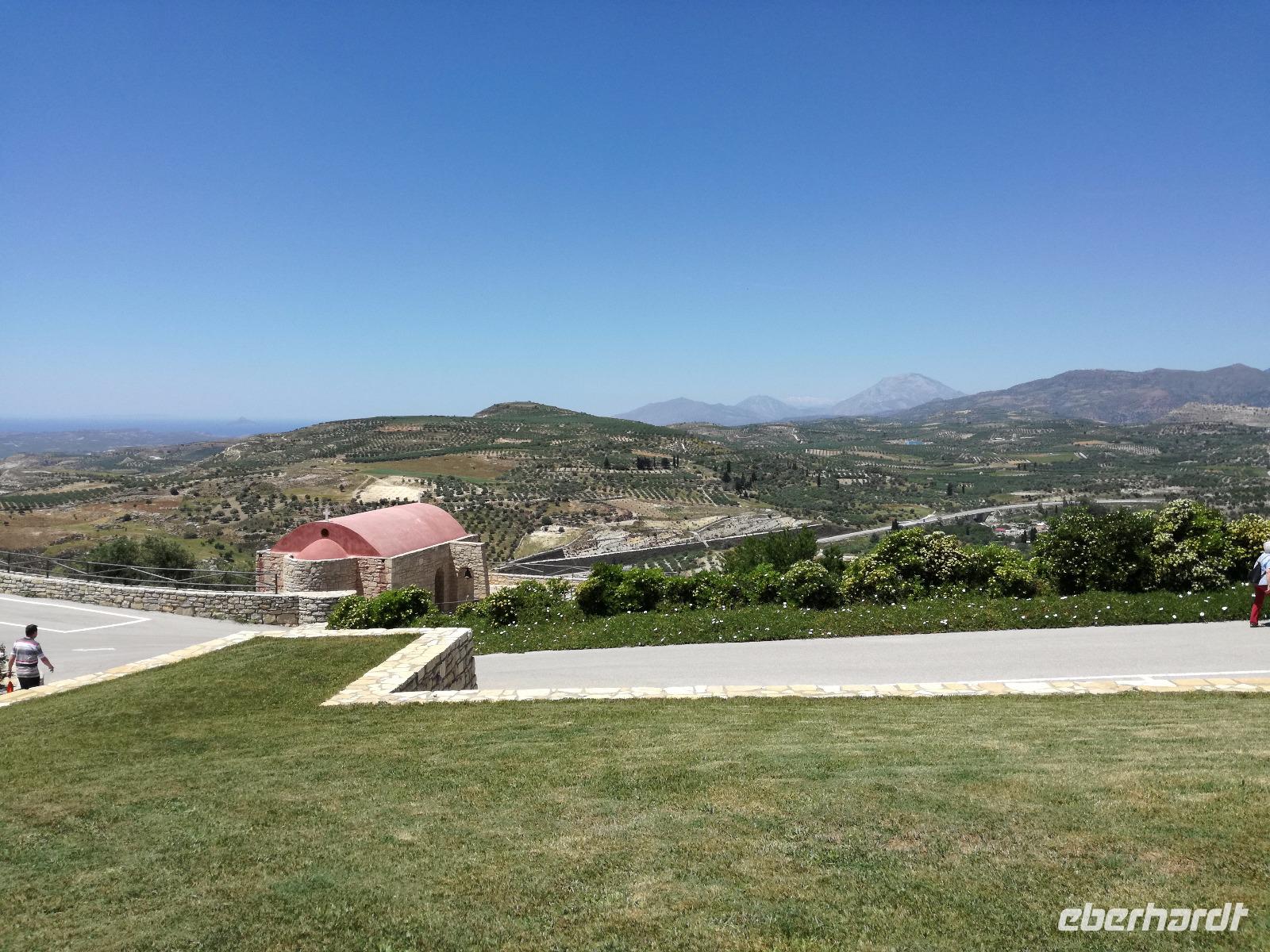 Wir sind gespannt auf den heutigen Ausflug der uns in die Lassithi-Hochebene führt. Das Kloster Panagia i Kardiotissa, das wir als erstes besuchen ist der Ikone der Gottesmutter Kardiotissa gewidmet. Laut Überlieferungen wurde die Ikone dreimal von den Türken gestohlen und wie durch ein Wunder immer wieder zum Kloster zurückgekehrt. Das dritte Mal ketteten sie die Entführer mit Ketten an eine Säule, die die Ikone aber auch mitnahm. Diese Säule können wir heute im Hof des Klosters begutachten. Rena zeigt uns in der kleinen Kapelle des Klosters, an den Wänden können wir farbige Fresken begutachten, die noch sehr gut erhalten sind. Auch die gesamte Klosteranlage ist ein wunderbares Fotomotiv, weshalb wir noch einige Minuten verweilen um dies zu nutzen. Die Weiterfahrt führt uns zu der Höhle des Zeus, auch diktäische Höhle genannt. Darf man den mythischen Geschichten Glauben schenken ist hier der Göttervater Zeus geboren. Dieser sollte von seinem Vater Kronos getötet werden, da dieser befürchtete von seinem unsterblichen Sohn vom Thron gestoßen zu werden, was dann letztendlich auch geschah. Wir begeben uns auf Spurensuche und steigen hinauf, auf 1200m Höhe. Oben angekommen geht es auch schon wieder bergab in die Untiefen der Höhle, diese ist mit Scheinwerfer ausgeleuchtet und somit können wir die spektakulären Stalaktiten und bewundern. Damit haben wir uns auch einen kühlen Orangensaft verdient, den wir uns genehmigen bevor wir wieder hinunter zum Parkplatz wandern, wo die restlichen Gäste auf uns warten. Die Mittagspause verbringen wir in einem kleinen Dorf auf der Hochebene, bevor wir weiter fahren um die älteste Plantane mit 20m Umfang zu besichtigen, diese ist ungefähr 2000 Jahre alt. Den Nachmittag können wir frei gestalten und uns bereit machen für einen Abend mit griechischer Musik und lokalem Essen. Dieser beginnt natürlich gemäß griechischer Tradition mit einem Schnaps, den typischen Raki. Wir trinken auf die Dame, die heute Geburtstag hat und wünschen ihr alles Gute. Die Abendshow überrascht uns mit jungen Tänzern in traditionellen Trachten und einer Showeinlage dieser, die die griechischen Götterfiguren verkörpern. Wir werden zum Tanz aufgefordert und spüren das kretische Lebensgefühl in uns. Wir tanzen und trinken bis in die Nacht hinein, bis die Veranstaltung endet.