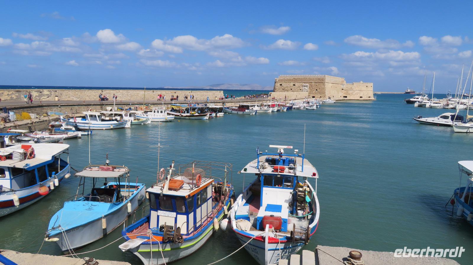Am Nachmittag besichtigen wir nach einer kleinen Busrundfahrt Heraklion. Maria zeigt uns die wichtigsten Sehenswürdigkeiten, und in der Mittagspause bummeln wir durch die Stadt, entdecken den Morosini-Brunnen, auch Löwenbrunnen genannt, die Venezianische Loggia, Kirchen oder bummeln zum Venezianischen Hafen mit der imposanten Festung.