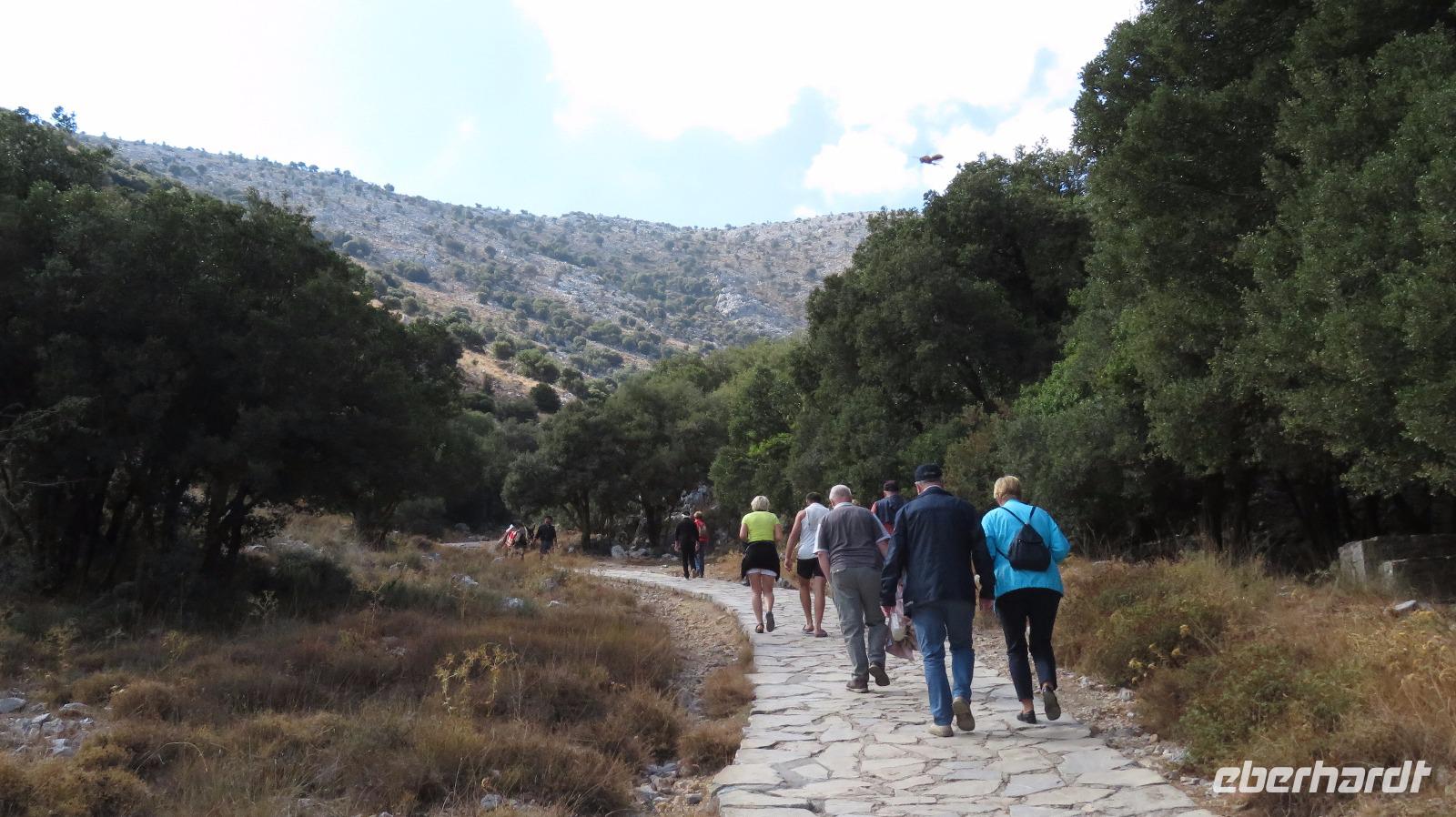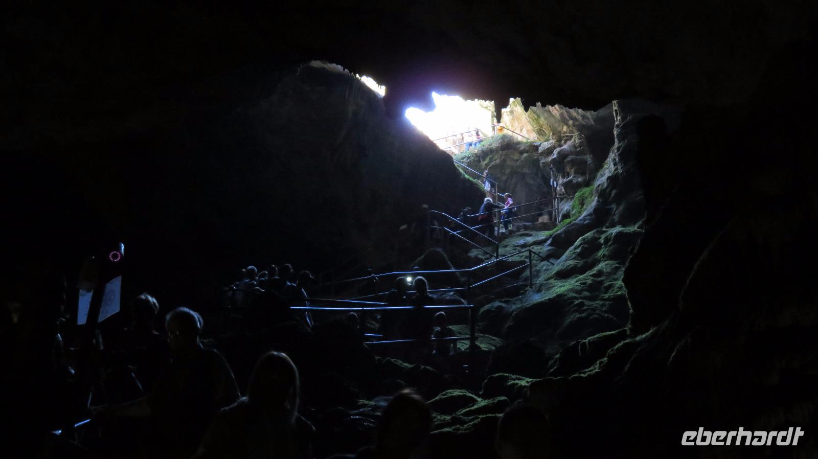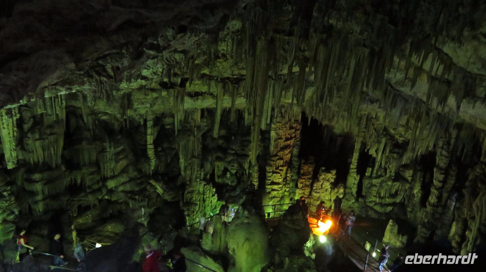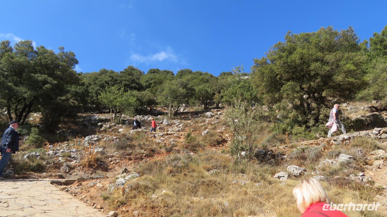 Maria hat uns im Bus über die Geschichte von Göttervater Zeus berichtet, und nun wollen wir seinen Geburtstort sehen. In einer guten Stunde sind wir vom Busparkplatz zum Höhleneingang hinauf gewandert und dann die 200 Stufen in die Höhle Dikteon Andron hinabgestiegen, haben die magische Stätte mit ihren Stalaktiden und Stalakmiten und dem kleinen See, wo Zeus getauft worden sein soll, ehrfurchtsvoll betrachtet und sind wieder zum Bus zurückgelaufen.