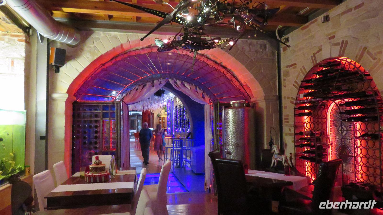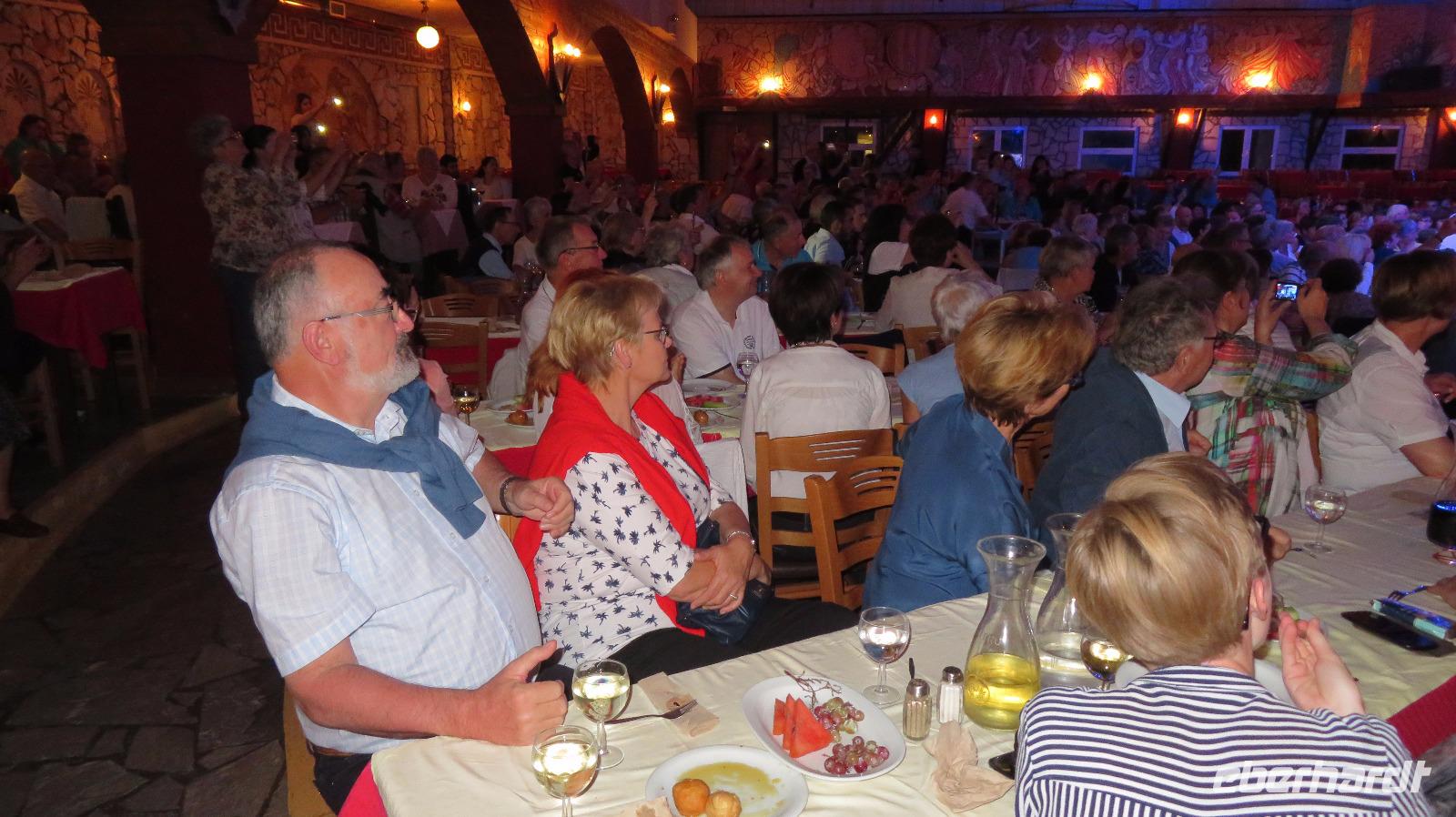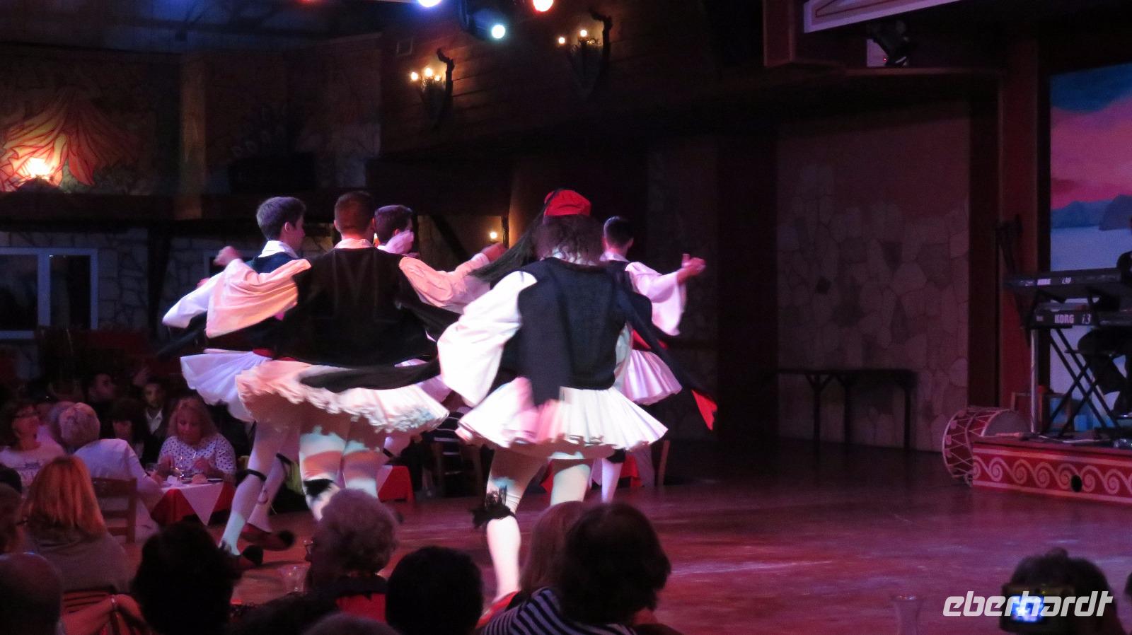 Landestypische Speisen werden uns serviert, Rot- oder Weißwein kann selbst an großen Fässern gezapft werden, und ein Programm mit griechischem Tanz sorgt für unsere Unterhaltung.