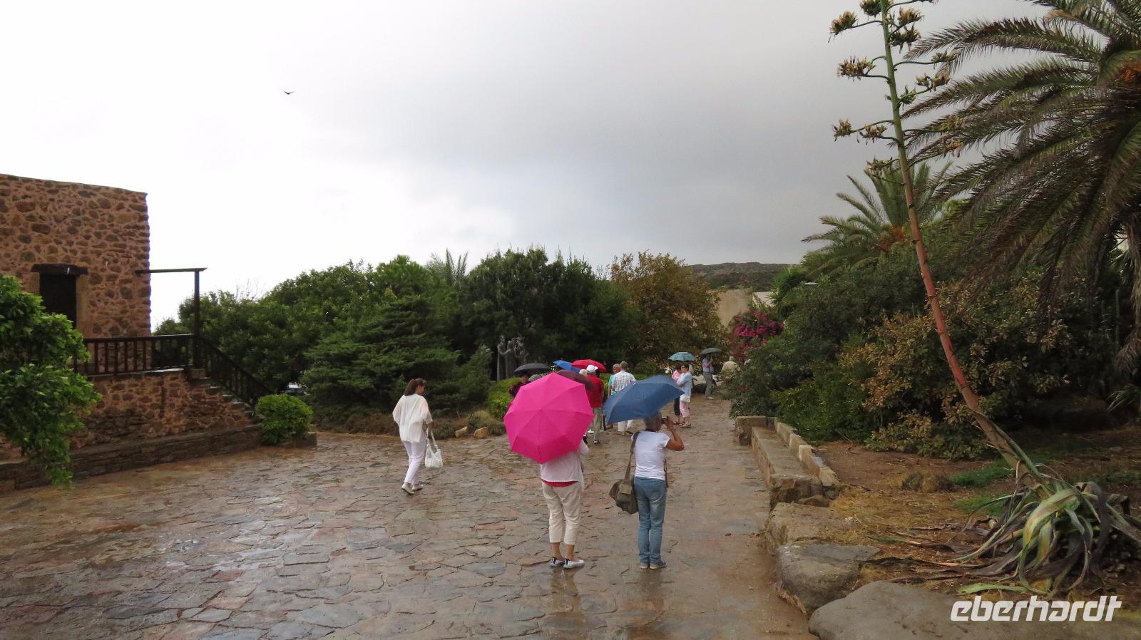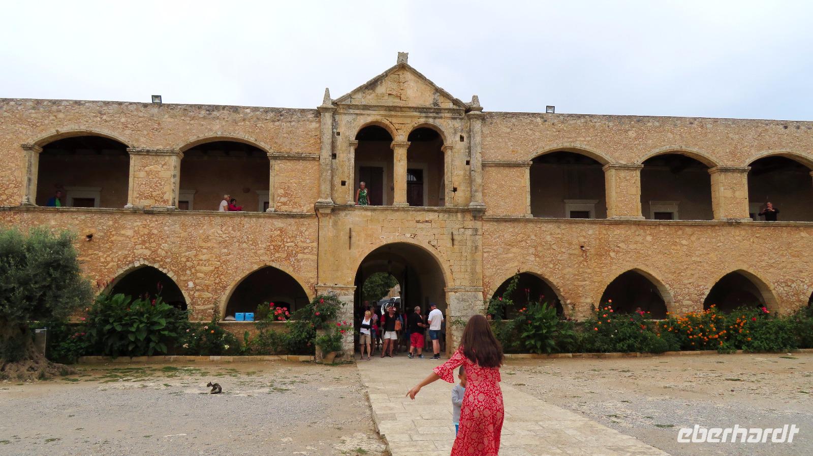 Das Arkadi-Kloster ist heute unser erstes Reiseziel. Wir fahren westlich bis Rethymnon und dann zum bekanntesten Kloster der Insel in den Hügeln. Maria erläutert uns die ganze Geschichte des Klosters. Da es etwas nieselt, opfern wir anschließend zwei Flaschen Wein an Gottesvater Zeus, die Petra gestern im Weingut für uns gekauft hat, und wir bitten um besseres Wetter.