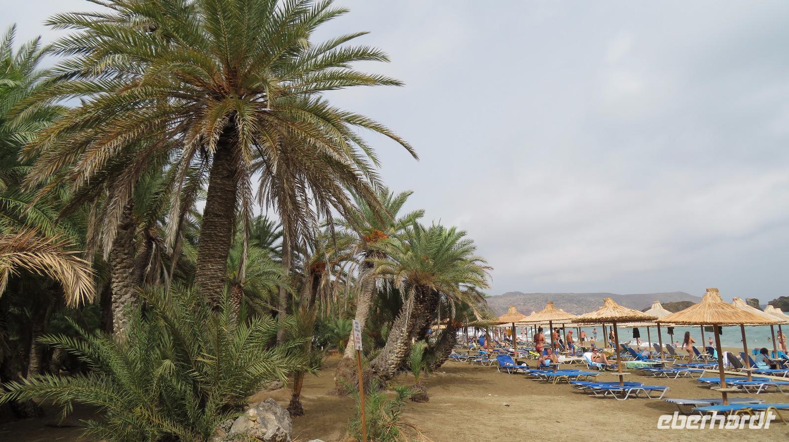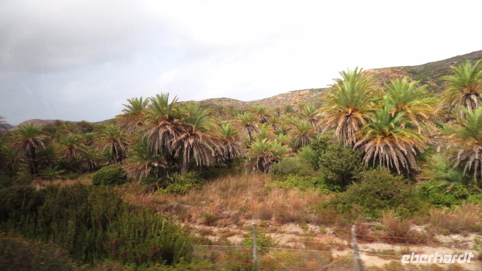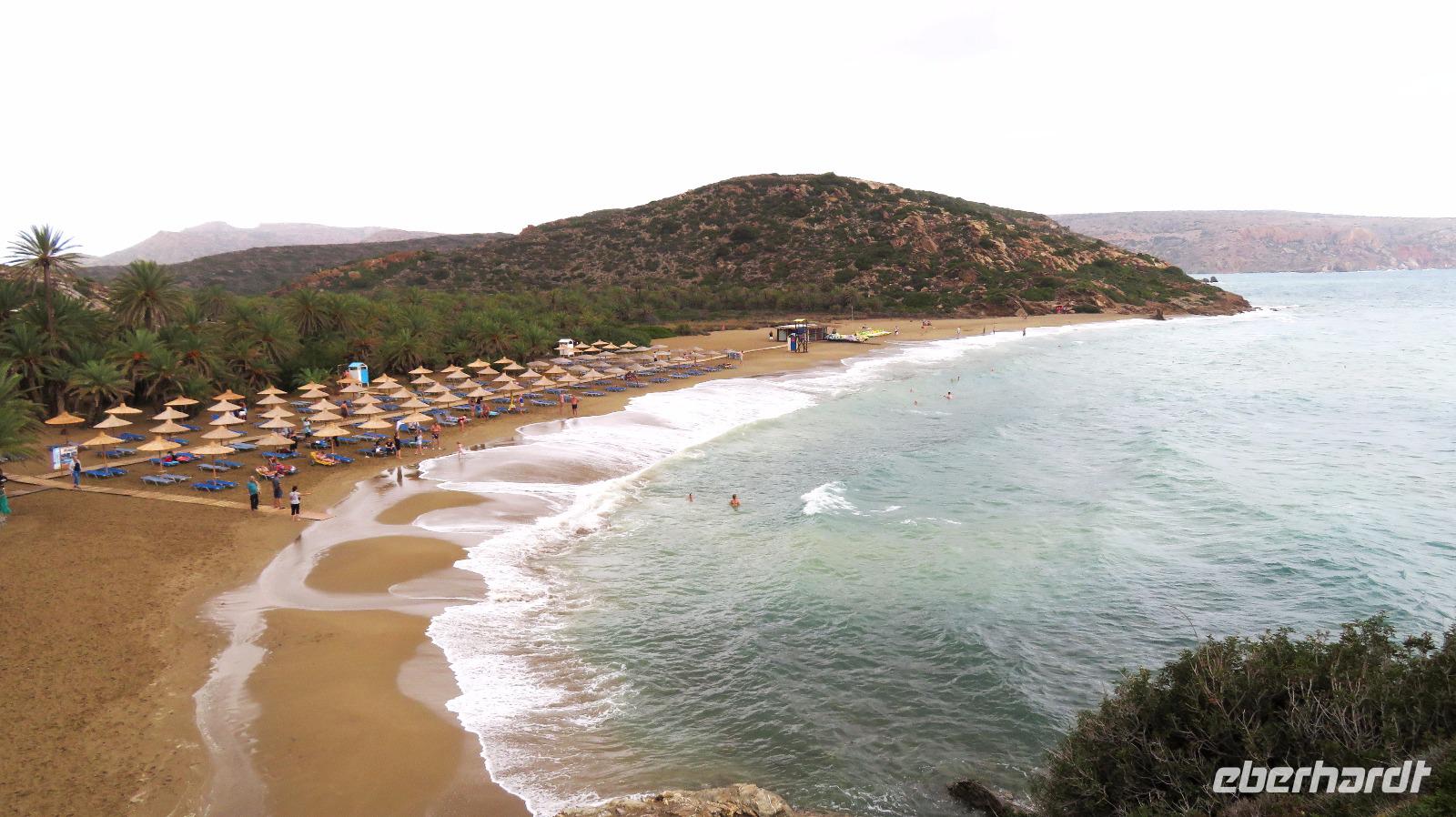 Weiter fahren wir nach Vaj, dem berühmtesten Strand von Kreta. Es ist einer der wenigen echten Palmenstrände in Europa. Die Palmenart von Vai ist sehr selten, sie kommt nur noch an wenigen Stränden in Kreta in geringer Anzahl vor.