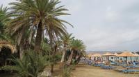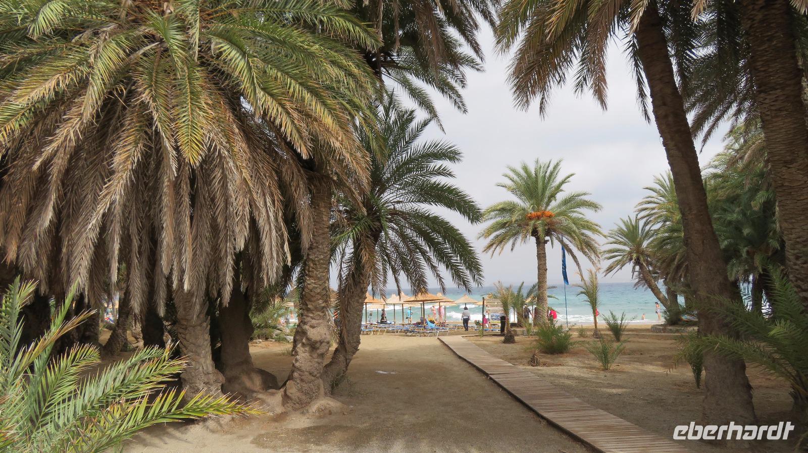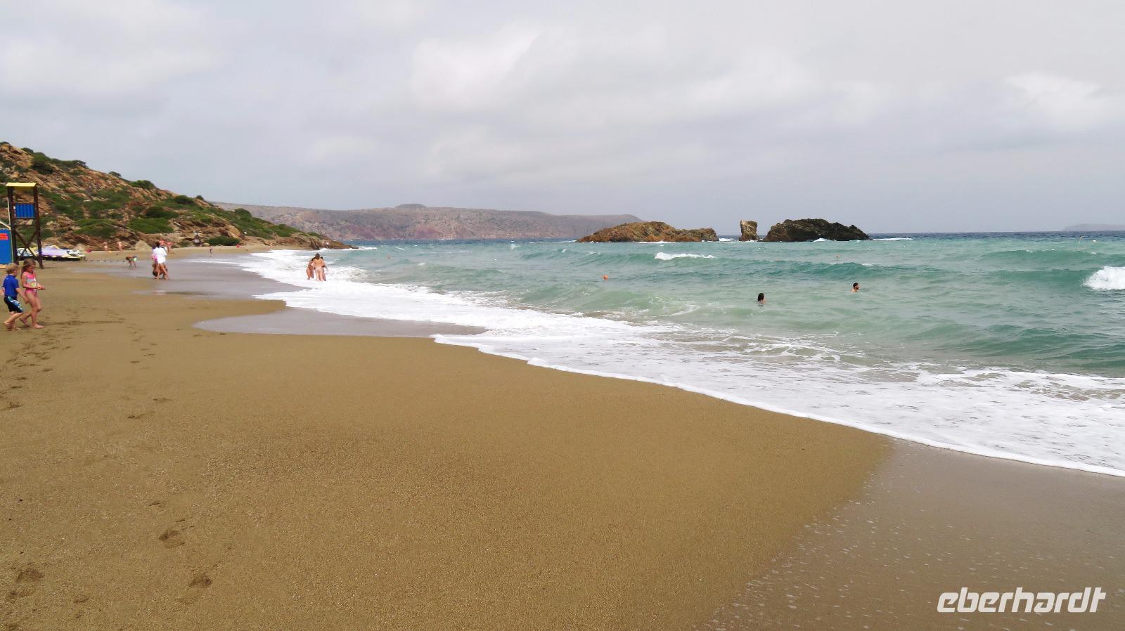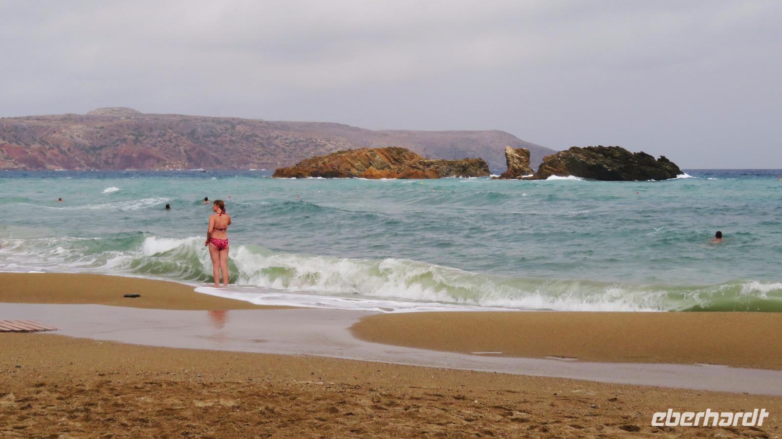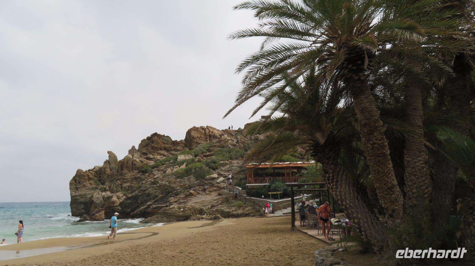 Geplant ist ein Badenachmittag unter Palmen! Bei dem trüben Wetter nicht für alle reizvoll! Aber auch da macht ein Sprung ins Meer Spaß, zumal das Wasser angenehm warm ist und es ziemlich hohe Wellen gibt. Wer nicht mag, kann ein Stück spazieren oder die Zeit in der Taverne verbringen. Dann kommt sogar noch die Sonne hervor.