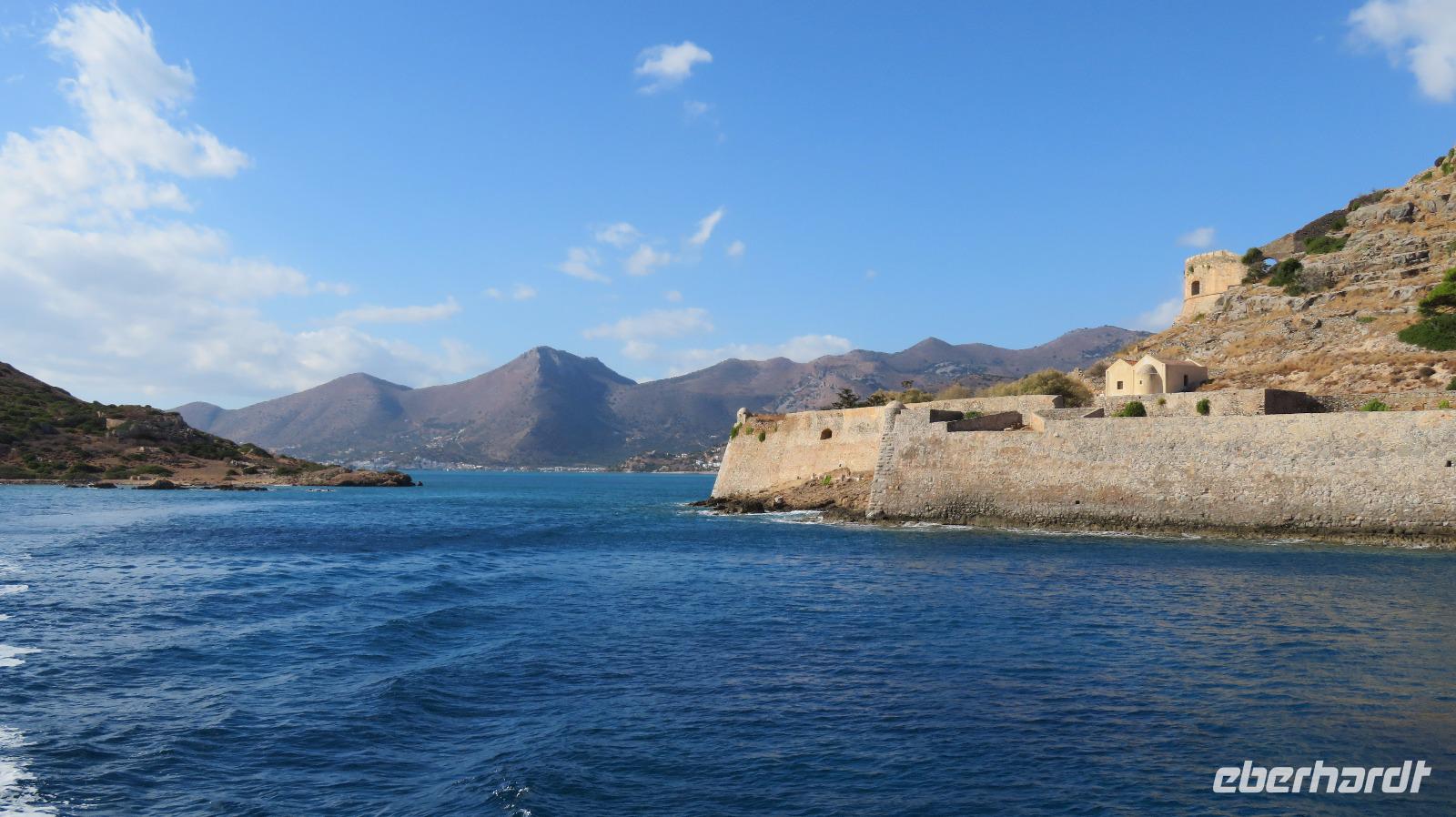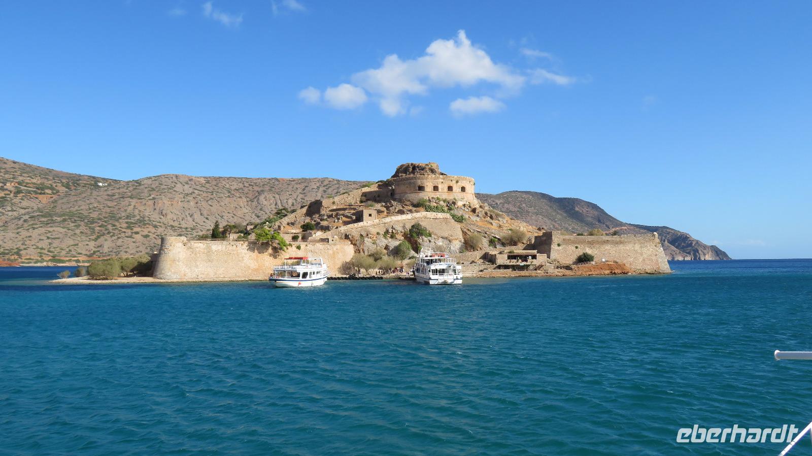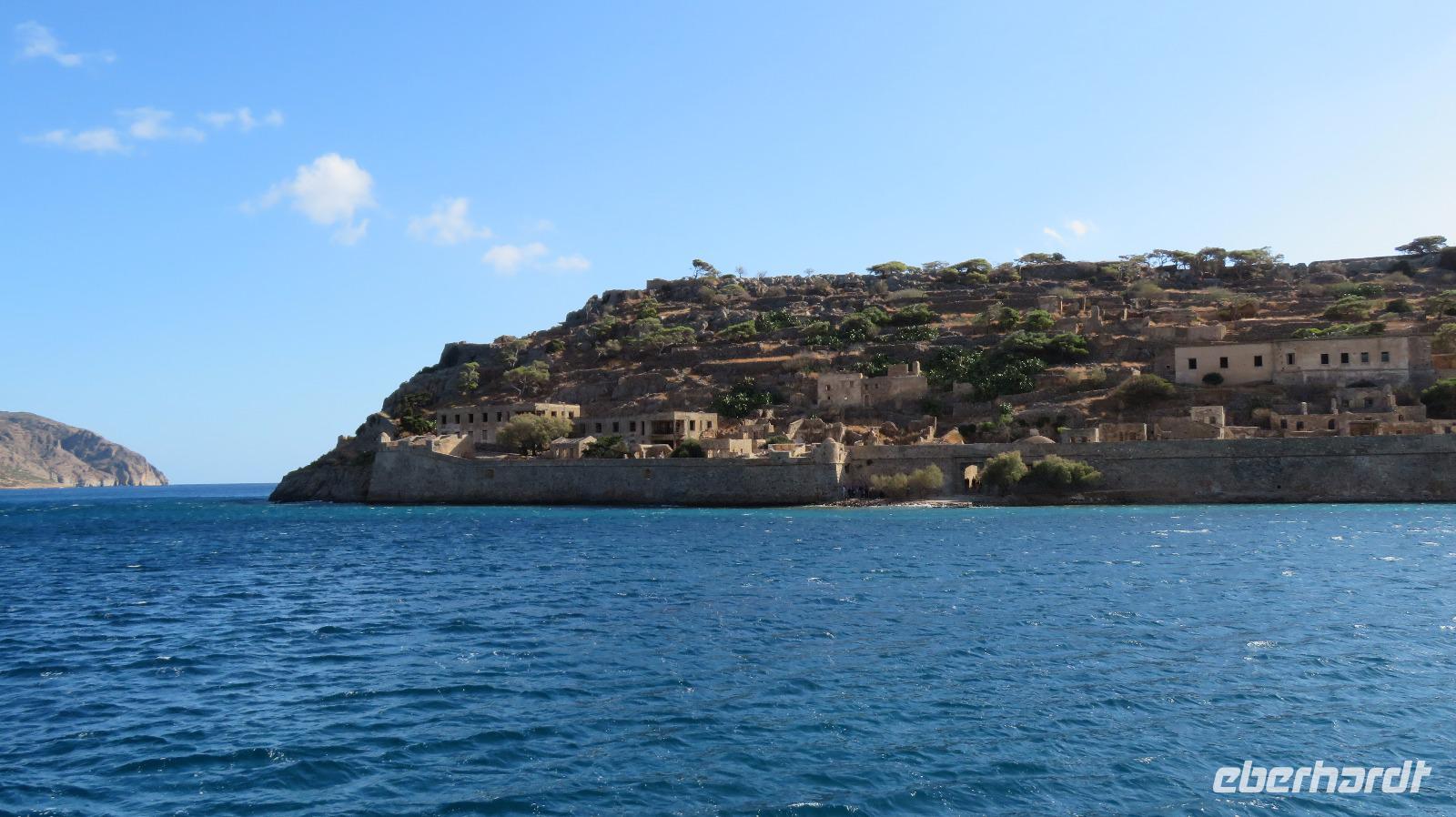 Im 15. Jahrhundert errichteten hier die Venezianer eine mächtige Burg bzw. ein riesiges Fort. Im 17. Jahrhundert eroberten die Türken Kreta und türkische Siedler nutzten die Anlage als Wohnraum. Als 1903 die kretische Regierung beschloss, die Insel als Quarantäneort für die kretischen Leprakranken einzurichten, verließen die Türken fluchtartig das Land. Glücklicherweise wurde dann ein Mittel gegen diese heimtückische Krankheit erfunden, und heute kommen viele Tagestouristen, um sich die gewaltige Anlage anzuschauen, die wir zuerst mit dem Schiff umrunden. Dann führt uns Maria mit ihren ausführlichen Informationen