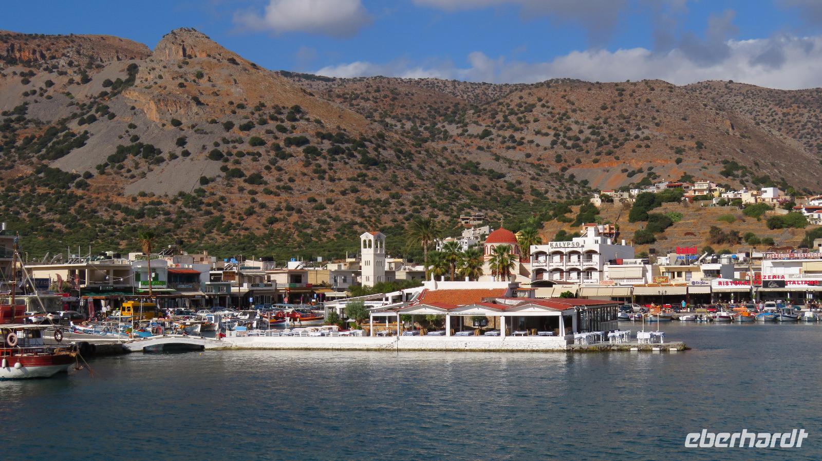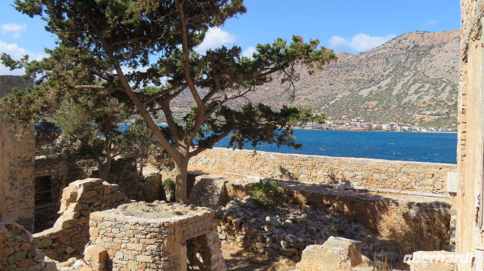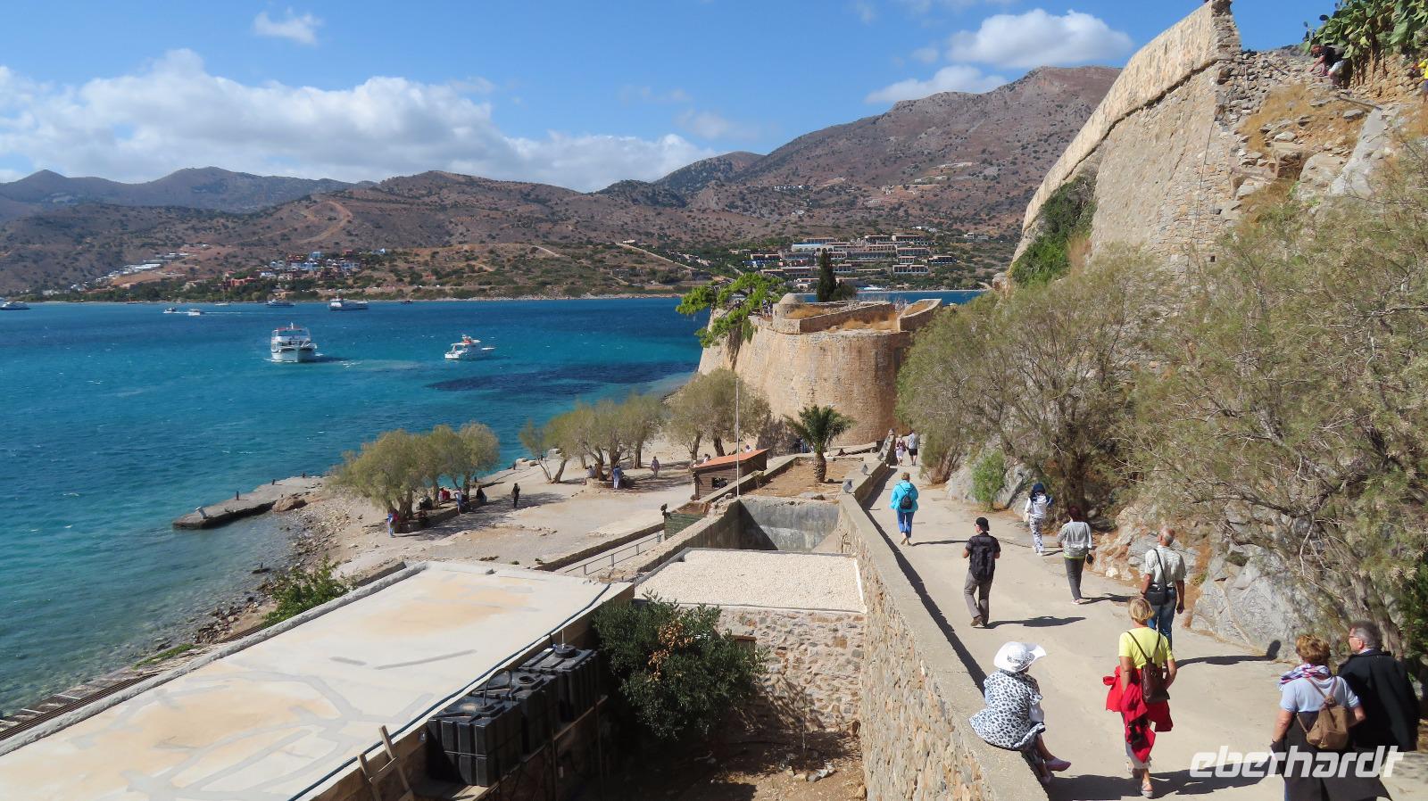 Im 15. Jahrhundert errichteten hier die Venezianer eine mächtige Burg bzw. ein riesiges Fort. Im 17. Jahrhundert eroberten die Türken Kreta und türkische Siedler nutzten die Anlage als Wohnraum. Als 1903 die kretische Regierung beschloss, die Insel als Quarantäneort für die kretischen Leprakranken einzurichten, verließen die Türken fluchtartig das Land. Glücklicherweise wurde dann ein Mittel gegen diese heimtückische Krankheit erfunden, und heute kommen viele Tagestouristen, um sich die gewaltige Anlage anzuschauen, die wir zuerst mit dem Schiff umrunden. Dann führt uns Maria mit ihren ausführlichen Informationen