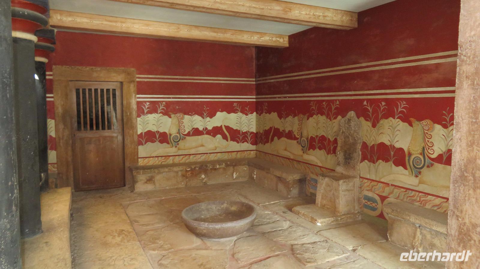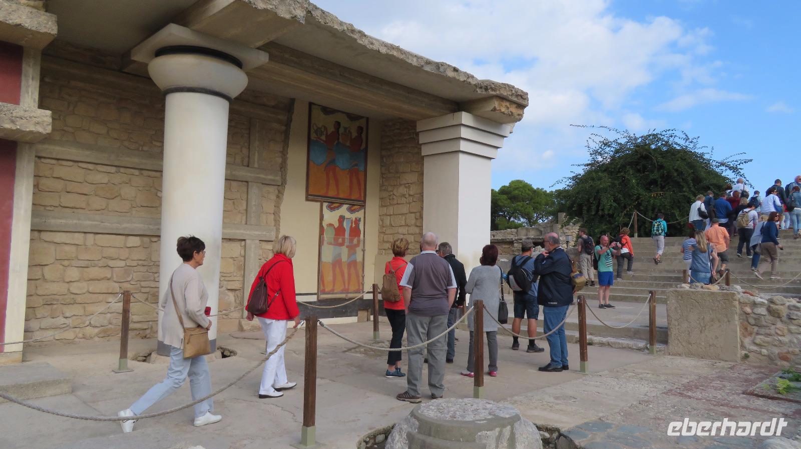 Heute ist unsere kleine Reisegruppe mit 16 Personen vollständig. Wir werden von unserem Bus mit Reiseleiterin Maria abgeholt, die uns die nächsten sechs Tage über die Insel führen wird. Wir starten Richtung Heraklion und dann geht es Richtung Berge. Unweit befindet sich Knossos, die wichtigste archäologische Ausgrabungsstätte auf der Insel. Maria zeigt und erzählt uns alles Wissenswerte über die minoische Kultur und über diese weltbekannte Ausgrabungsstätte, den über 3.000 Jahre alten Palast des Königs Minos, Sohn von Zeus.