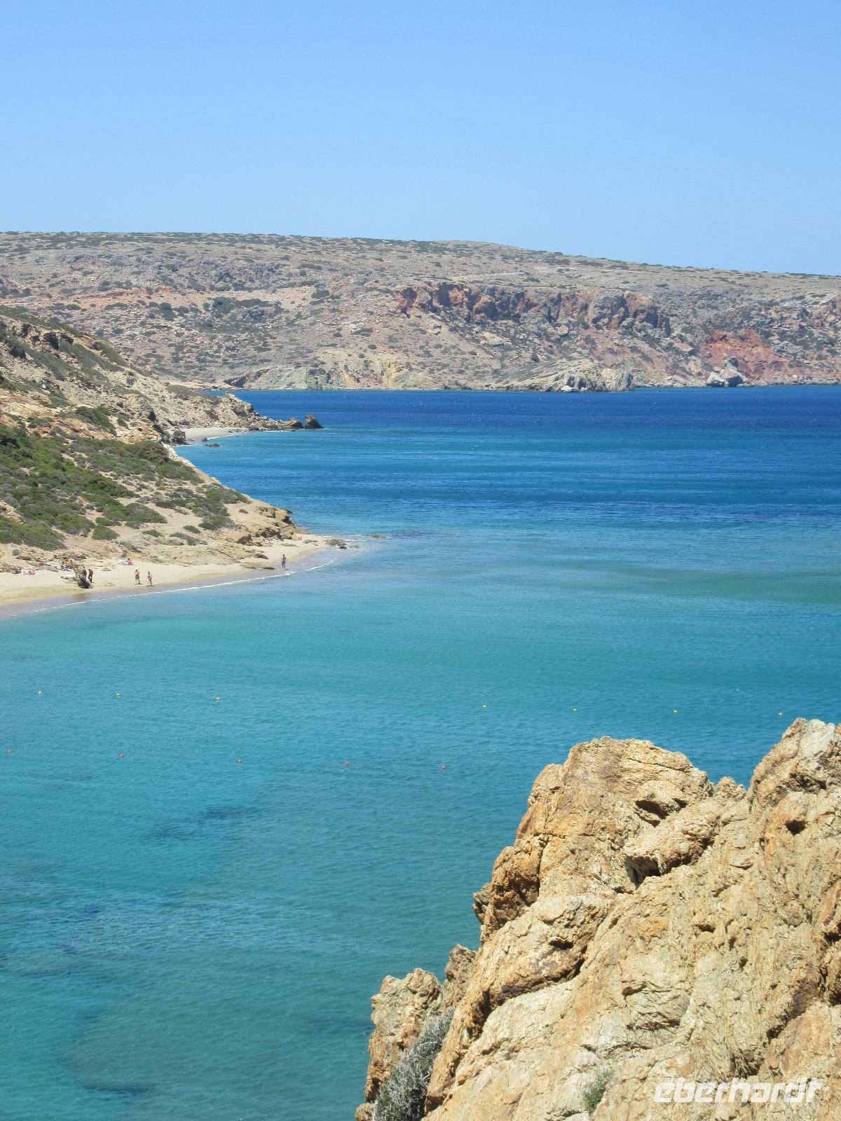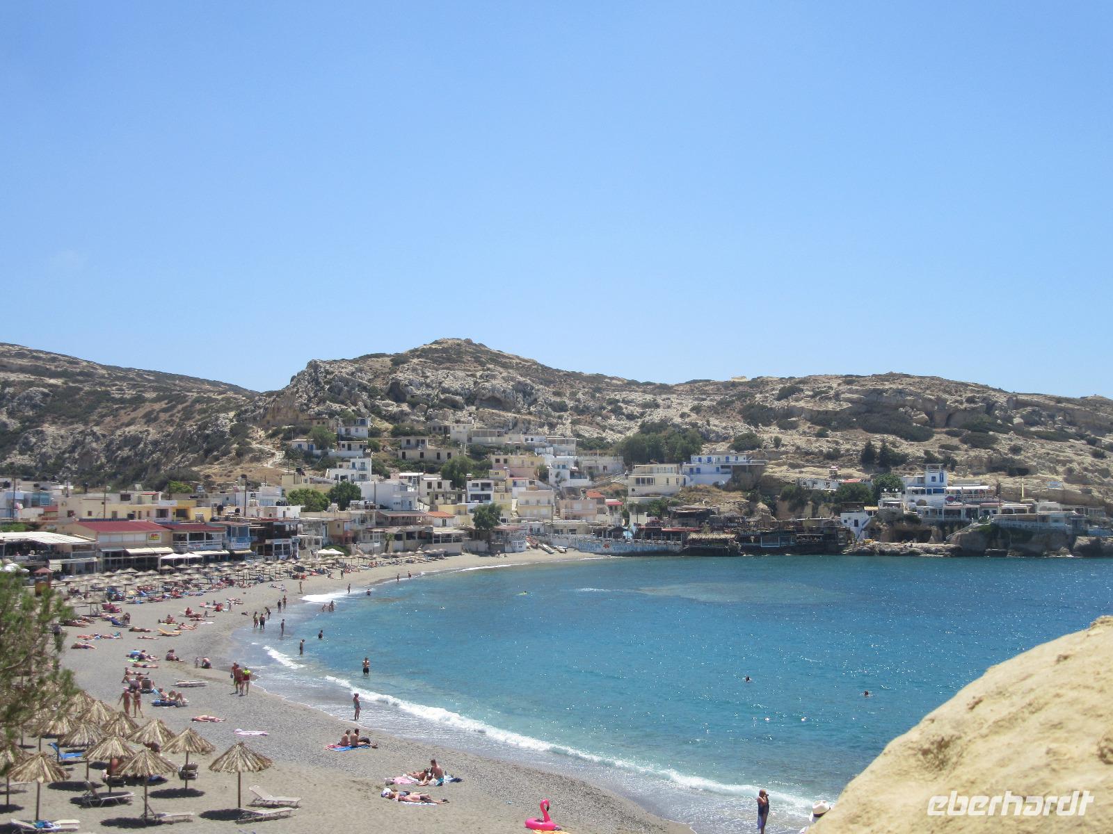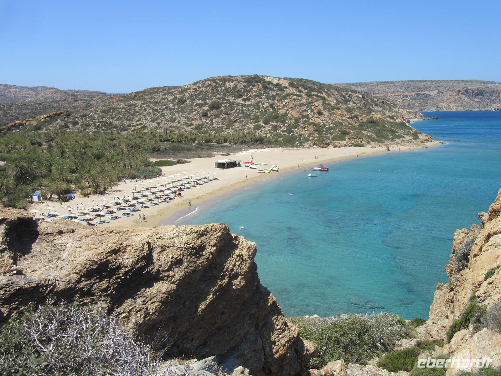 Auf in den Osten! Bereits 8.30 Uhr holte uns Rena und unser Buschauffeur am Hotel ab und wir fuhren durch Malia. Ein junger Ort, der gerade bei Engländern sehr beliebt ist. Wir verließen den Bezirk Heraklion und fuhren in den Bezirk Lassithi. Auf unserer Fahrt stoppten wir an der Ausgrabungsstätte von Gournia. In der minoischen Zeit existierte hier eine große Siedlung. Wir passierten auf unserem Weg zum Kloster Toplou die schmalste Stelle Kretas und warfen einen Blick auf die unendliche Küstenlandschaft Kretas. Nach einer Fahrzeit von knapp zwei Stunden erreichten wir das Kloster, welches berühmt für seine wertvollen Ikonen ist. Kunstwerke der orthodox griechischen Kirche konnten wir im Inneren bestaunen. Unser heutiges Ziel, der Palmenstrand von Vai lag unmittelbar vor uns und wir waren beeindruckt...es war, wie ein Abstecher nach Afrika oder die Karibik. Die Dattelpalmen von Vai sind einzigartig und es gibt nur noch wenige Strände und Buchten auf Kreta, wo diese Palmenart zu finden ist. Die Sonne schien und das Mittelmeer schimmert Türkis...ideales Badewetter??? Ja, wir nutzten die Gelegenheit und gingen kurzerhand im Mittelmeer baden...eine herrliche Erfrischung. Wir genossen die Ruhe des heutigen Tages und den wunderbaren Flair des Palmenstrandes bei einem Kaffee bevor es Abschied nehmen hieß. Für die Rückfahrt statteten wir uns mit Bananen aus! Lecker, diese köstliche Frucht! Nach knapp zwei Stunden Fahrt durch die kurvenreiche Region erreichten wir unser Hotel und nutzten die Gelegenheit für Spaziergänge oder für ein Bad im Pool. Den Abend ließen wir gemütlich ausklingen...Das war Etappe zwei unserer Weltreise - karibisches Flair und fabelhafte Natur!