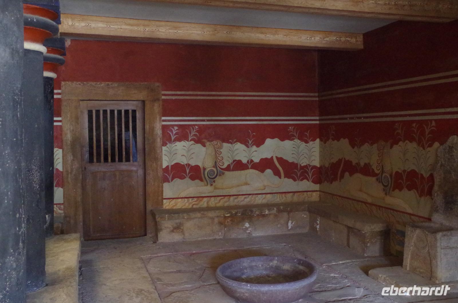 Nach dem Frühstück traf nun heute die gesamte Gruppe aufeinander, auch Rena, unsere örtliche Reiseleiterin lernten wir kennen. Wir machten uns zunächst auf den Weg zum Palast von Knosses, eine sehr große und beeindruckende Anlage. Während einer ausgiebigen Führung durch Rena lernten wir die ca. 21.000 m² große Anlage kennen und erhielten zahlreiche Informationen. In dem Palast von Knossos lebten einst die Minoer, welche vor rund 4.000 Jahren die führende Zivilisation Europas waren. Wir starteten am Westhof und unserer Führung endete auch dort. So sahen wir eine Vielzahl noch unglaublich gut erhaltener Räume, welche von einem zentralen Hof ausgehen. Archäologen fanden heraus, dass der Palast aus bis zu fünf Stockwerken bestanden haben muss.