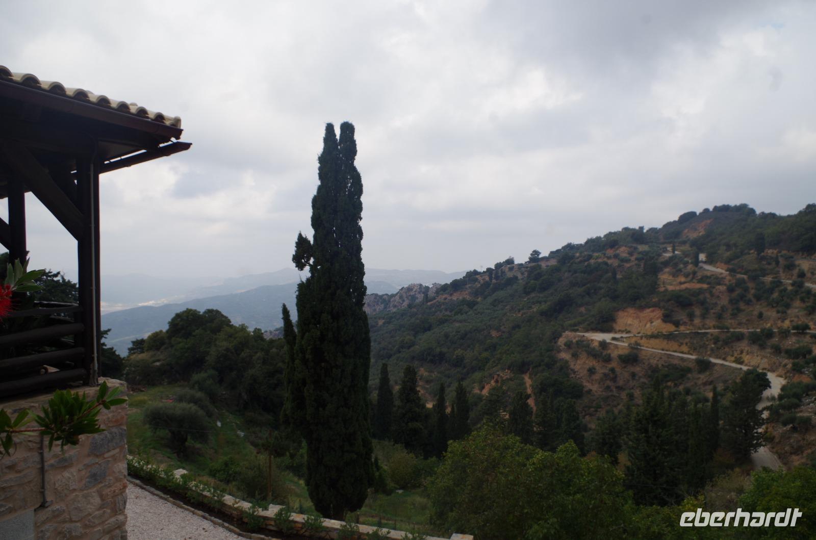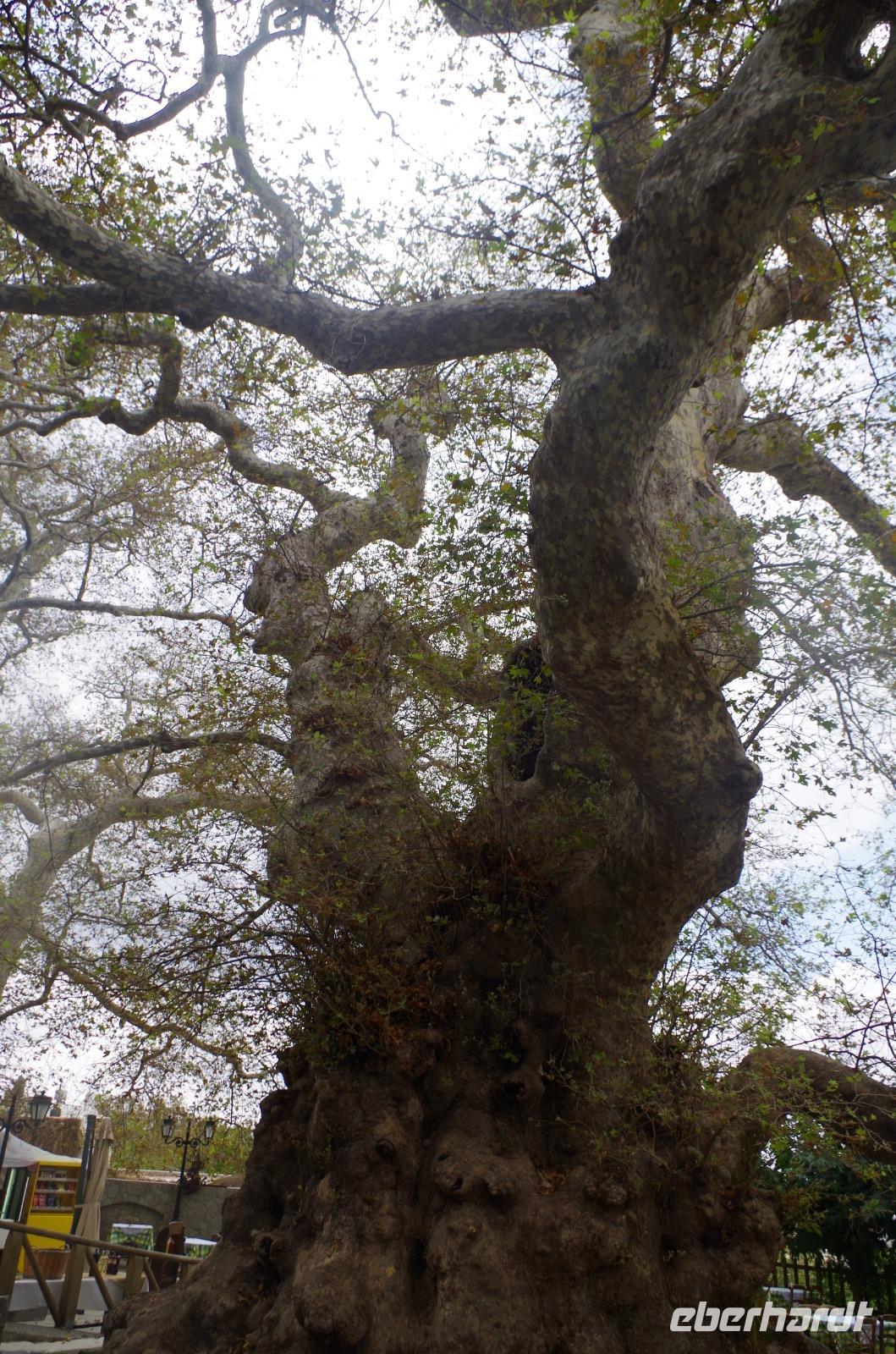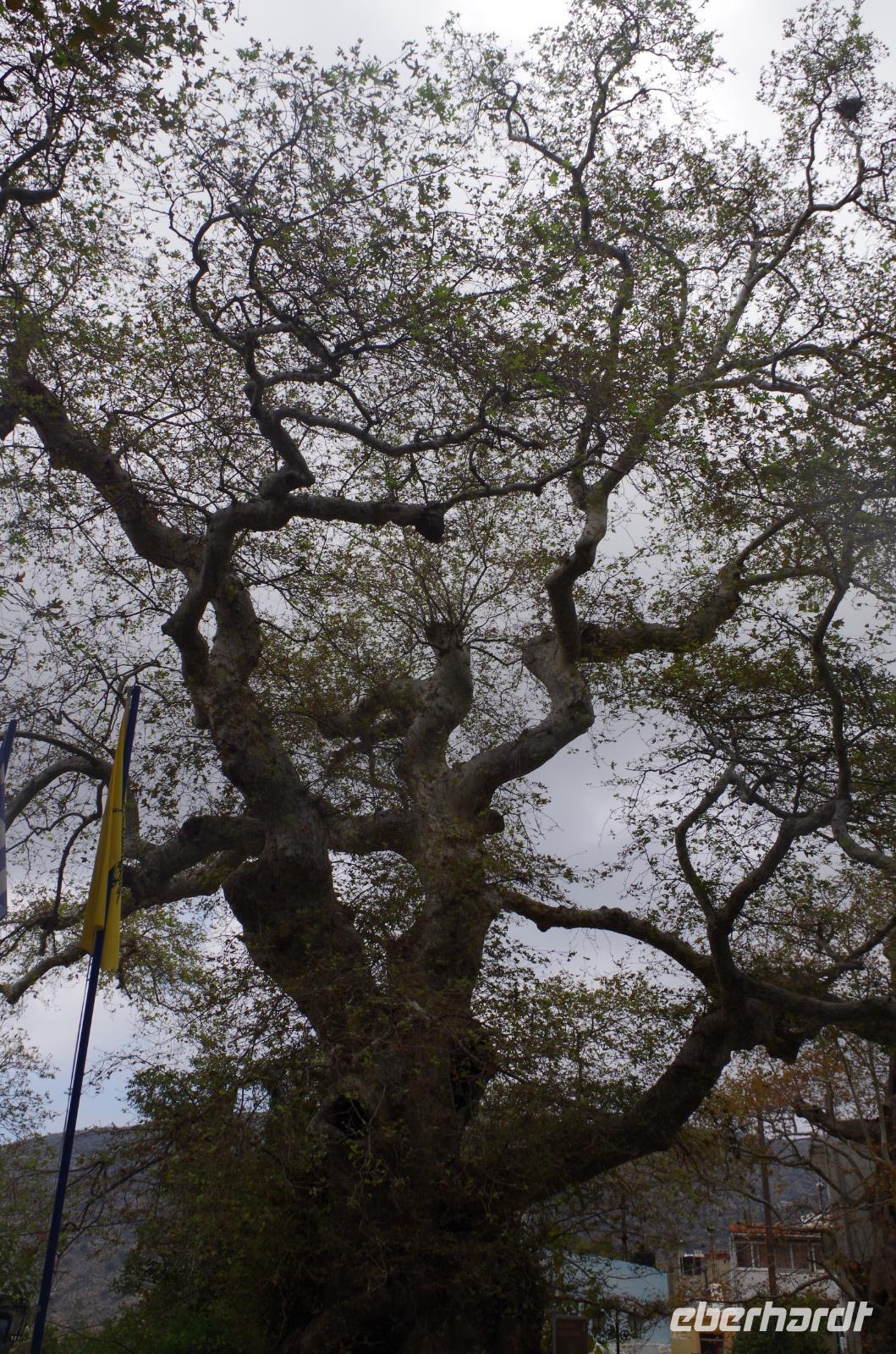 Weiter ging es dann in ein sehr kleines Kloster, das Kloster Panagia Vidiani, durch das Rena uns führte. Anschließend fuhren wir zur Höhle von Psichro, wo Zeus geboren wurde. Leider streikten heute die Wächter, sodass wir nicht in das Innere der Höhle konnten, dennoch war es möglich hinauf zur Höhle zu wandern. Von dort aus hatte man einen wunderbaren Blick auf die Lassithi-Hochebene. Es gab auch einige Tavernen, um die Mittagspause zu verbringen. Danach führte uns unsere Weiterfahrt zum Dorf Krasi, wo wir die größte und älteste Platane Kretas sehen konnten. Diese ist schätzungsweise ca. 2.000 Jahre alt.