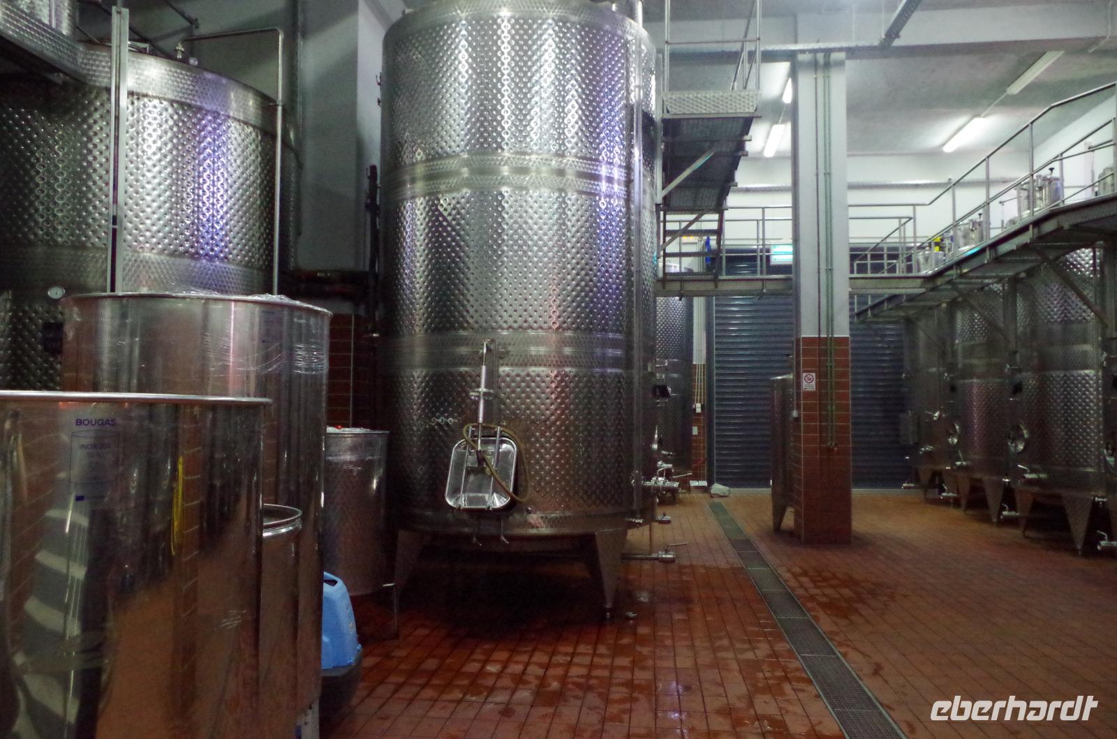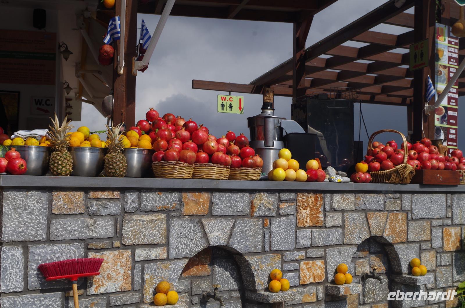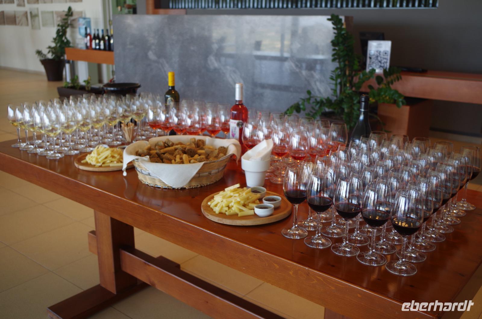 Anschließend fuhren wir nach oben zum Weingut Zachriaoudakis, wo wir die andere Eberhardt Gruppe trafen. Gemeinsam erhielten wir eine Führung. Die Anlage ist 20 Hektar groß, alle Produkte sind Handarbeit und produziert wird dort bereits seit mehreren Genrationen. Es durfte natürlich auch eine Kostprobe nicht fehlen. Wir genossen den fantastischen Ausblick und probierten 3 Sorten Wein, dazu wurden kleine Snacks gereicht.