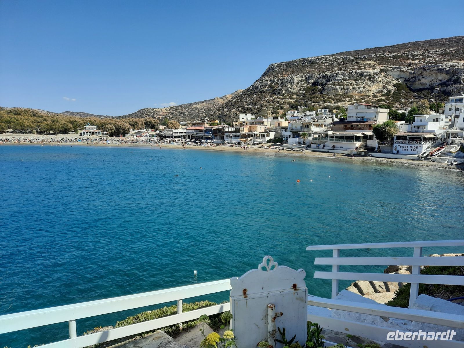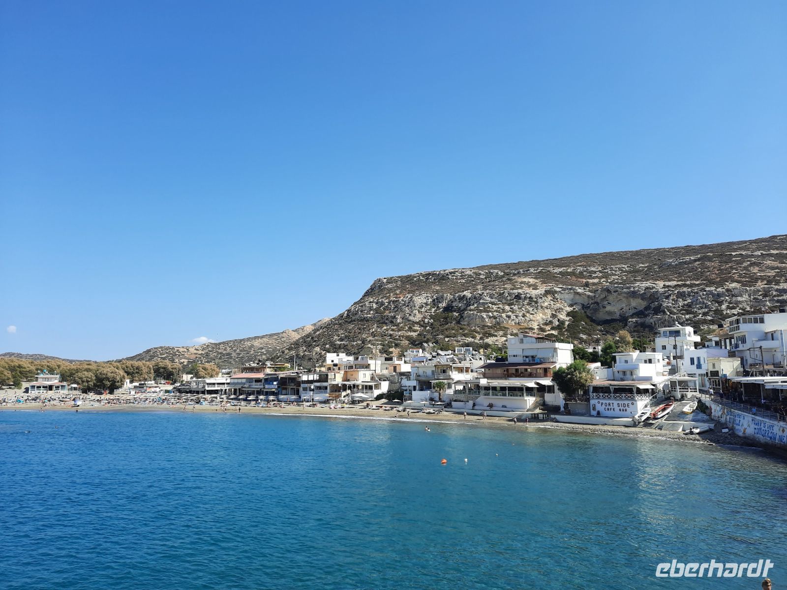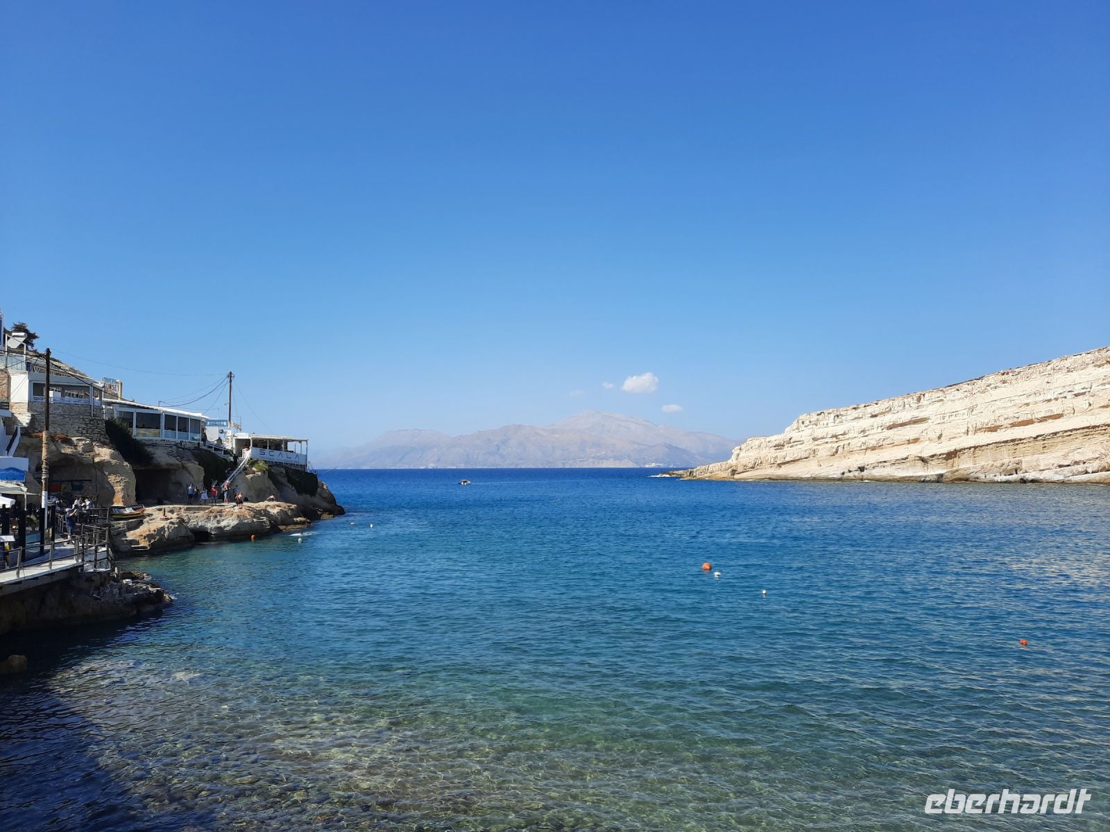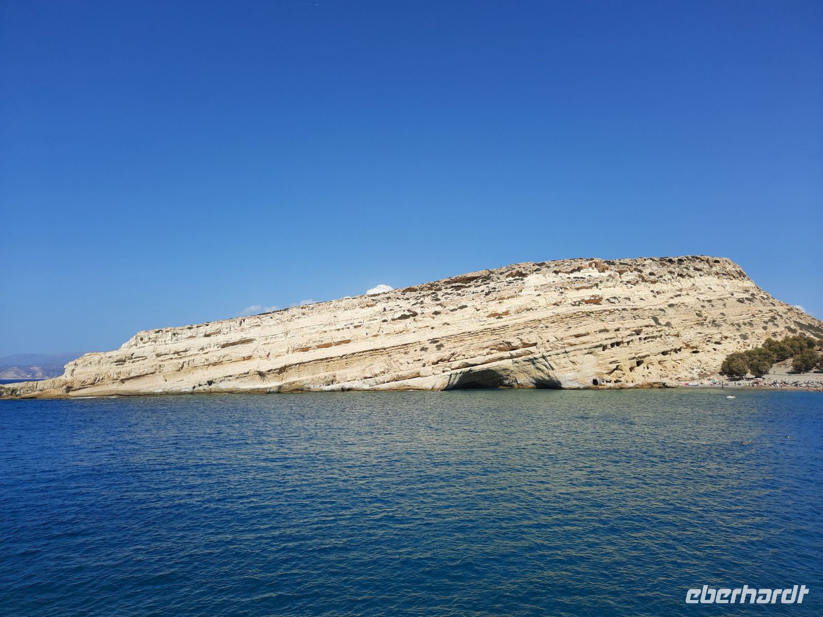 Immer die imposanten Gipfel des Ida-Gebirges und den schlafenden Zeus im Blick, fuhren wir heute in Richtung Süden. Am Dorf Agia Varvara, der Heiligen Barbara vorbei, passierten wir gleichzeitig auch den Mittelpunkt Kretas. Es ist auch das längste Dorf der Insel und für den Kirschanbau bekannt. Die sich anschließende Messara-Ebene liegt zwischen Ida- und Asterousia-Gebirge und wird hauptsächlich für den Getreide- und Gemüseanbau genutzt. In dieser fruchtbaren Tiefebene liegt auch die antike Stadt Gortys, einst kretische Hauptstadt in der Römerzeit. Im römisch-hellenistischen Odeon ist der älteste Gesetzeskodex Europas zu sehen. Imposant auch die Titus-Basilika, des ersten Bischofs von Kreta. Nach dieser eindrucksvollen Besichtigung fuhren wir zum nur wenige Kilometer entfernten hochmodernen Weingut "Zacharioudakis", welches sich seit dem Jahr 2000 auf dem 500 Meter hohen Hügel des Orthi Petra befindet. Genau hier an dieser Stelle, so erfuhren wir, werden die rein kretischen Rebsorten wie die rote Rebe "Kotsifali“ und die weißen Reben "Vidianó", "Vilana" und "Malvazia di Candia" angebaut. Die Weine reifen in einer hohen Qualität und dazu trägt in erster Linie auch das wunderbare kretische Klima mit vielen Sonnenstunden und wenig Regen bei. Bei einer kleinen Weinverkostung konnten wir uns von der wunderbaren Qualität überzeugen. Ein kleines Stück weiter liegt auf einem kleinen Plateau der Ort Festos. Die Minoer waren sehr kluge Leute, denn über der ausgedehnten Messara-Ebene, die damals wie heute Kornkammer Kretas war, bauten sie auf einem alles überblickenden Hügel ihr zentrales Heiligtum und den Palast ihres Herrschers. Der Mythos nennt übrigens Rhadamanthys, einen Bruder des Minos, als ersten Herrscher über Festos. Erste Siedlungsspuren stammen bereits aus dem 4. Jahrtausend v. Chr. Eine erste Palaststadt entstand dann um 1900 v. Chr. und nach deren Zerstörung wurde wie in Knossos ein neuer Palast erbaut. Bis ins 2. Jahrhundert hinein wohnten noch Menschen in Festos, bevor die Siedlung schließlich durch Krieger aus dem aufstrebenden, benachbarten Stadtstaat Gortys endgültig zerstört wurde. Immer wieder entzückte uns zudem ein wundervoller Panoramablick in das von Gebirgen umschlossene Tal und die Messara-Ebene. Bei einem Ausflug an die Südküste Kretas durfte natürlich auch ein Besuch des kleinen Dorfes Matala nicht fehlen und somit gelangten wir am Nachmittag in das sogenannte "Hippie-Dorf" der Insel. Hier suchten in den zahlreichen das Dorf umgebenen Höhlen Aussteiger und Hippies vor allem in den 1960-er Jahren nach den Genüssen des einfachen Lebens. Die Höhlen boten selbstverständlich keinen großen Komfort, von Elektrizität und fließendem Wasser ganz zu schweigen. Doch das einfache Leben war für die Hippies der gesuchte Kontrast zum normalen Leben und Matala war einfach perfekt, um auszubrechen und allen Verpflichtungen zu entfliehen. Neben den weltbekannten Hippiehöhlen fanden wir hier auch einen wunderschönen Strand, der den ein oder anderen zum Baden einlud. Außerdem konnten wir es uns in den zahlreichen typisch griechische Tavernen so richtig gut gehen lassen...