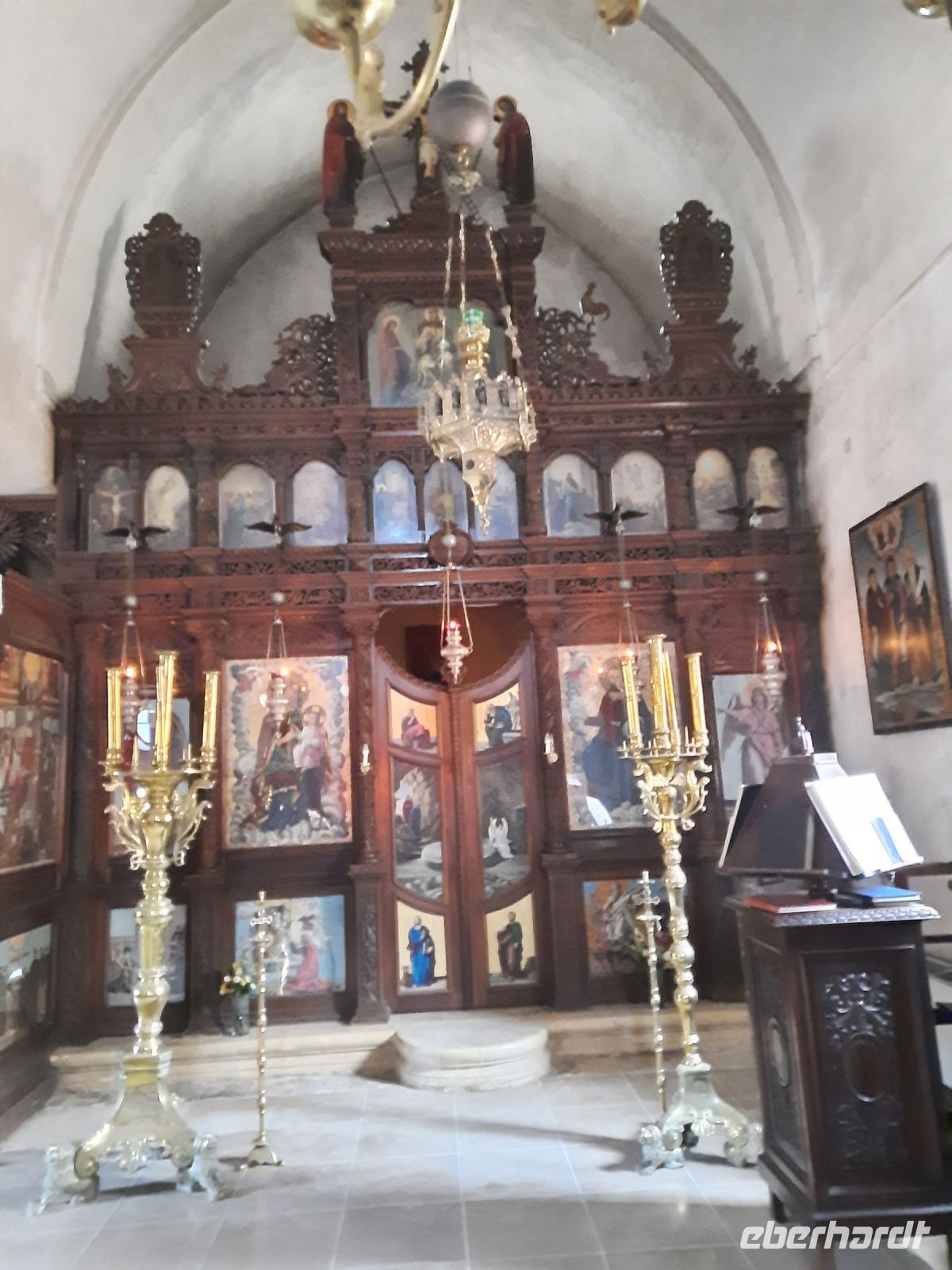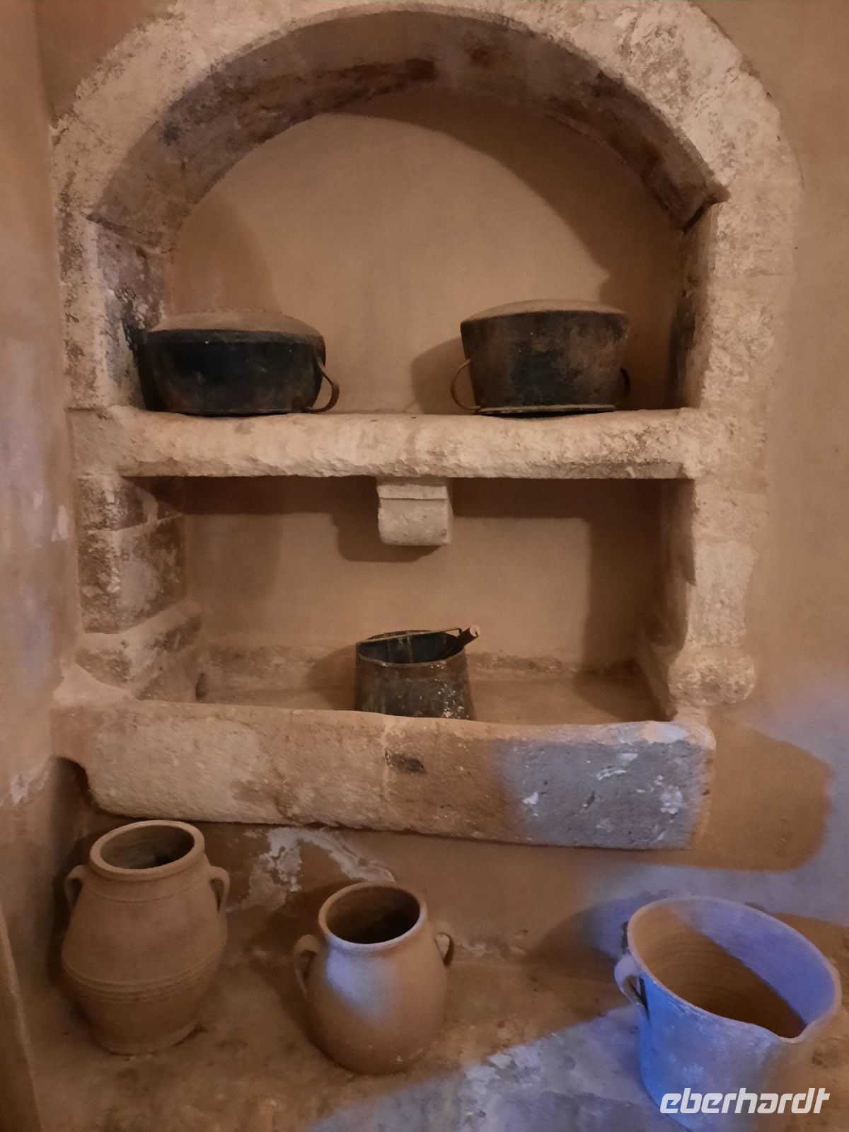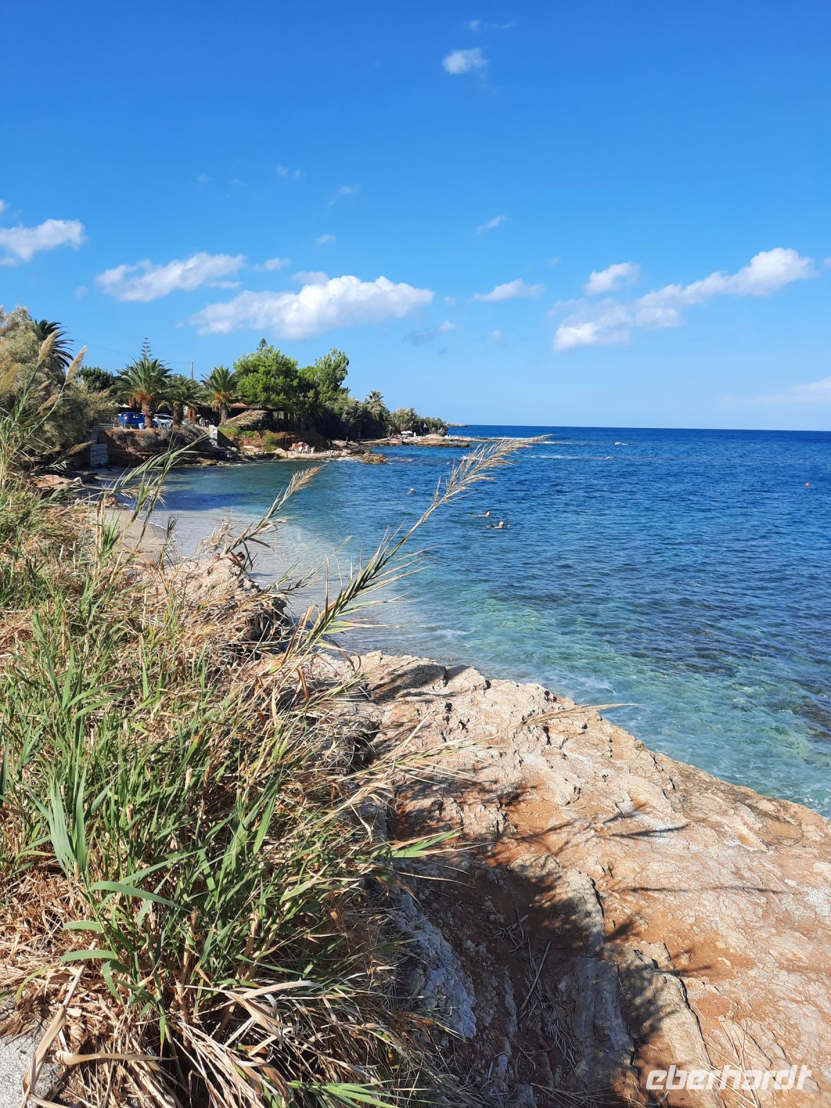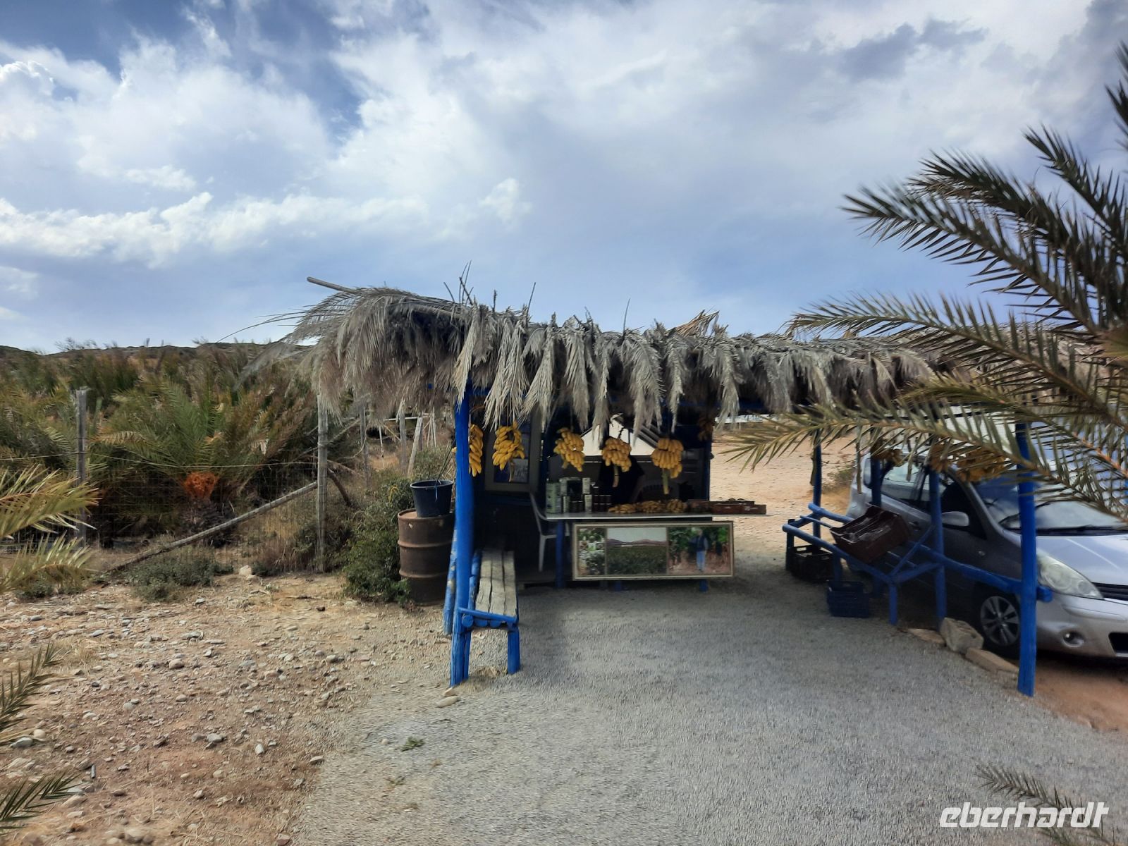 Unsere Ausflugsziele lagen heute im Osten der Insel. An Malia und an der Schlucht des Heiligen Georg vorbei, verließen wir zunächst die Küste, um in den waldlosen und eher karg wirkenden Osten Kretas zu gelangen. An der Hafenstadt Gournia legten wird einen kurzen Fotostopp ein. Hier in den Hügeln sind immerhin die Reste der antiken Hafenstadt aus minoischer Zeit zu sehen. Weiter fuhren wir durch wundervolle Gebirgslandschaften und wenig später an schier endlosen Mandel-und Olivenhainen vorbei. Vereinzelt waren sogar noch venezianische Getreidemühlen zu sehen. In der Nähe von Platanos hielten wir an einem kleinen Café mit tollen Ausblicken auf die Nordostküste Kretas. Vorbei an Sitia ging es über eine Serpentinenstraße ins trockene, felsige Bergland hinein. Schon von weitem konnten wir den Glockenturm des Klosters Toplou erkennen. Diese festungsähnliche Anlage gehört immerhin noch heute zu den reichsten Klöstern Kretas. Unsere Augen erfreuten sich an der Ikonensammlung und der schönen Innenhof-Gestaltung. Am Nachmittag zog es uns dann bei herrlichen Temperaturen um die 27 Grad ans Meer. Wir hatten dementsprechend ein Ziel und wollten den berühmten Palmenstrand von Vai genießen. Wir fühlten uns übrigens wie an der Südsee und träumen vor uns hin... Zurück fuhren wir später die gleiche Strecke, allerdings nicht ohne einen Halt bei einer Bananen-Händlerin, wo wir typisch kretische Früchte und andere Produkte kaufen konnten.