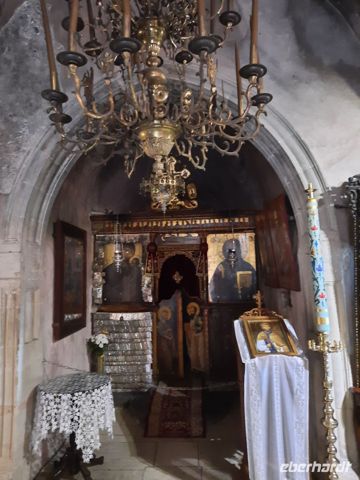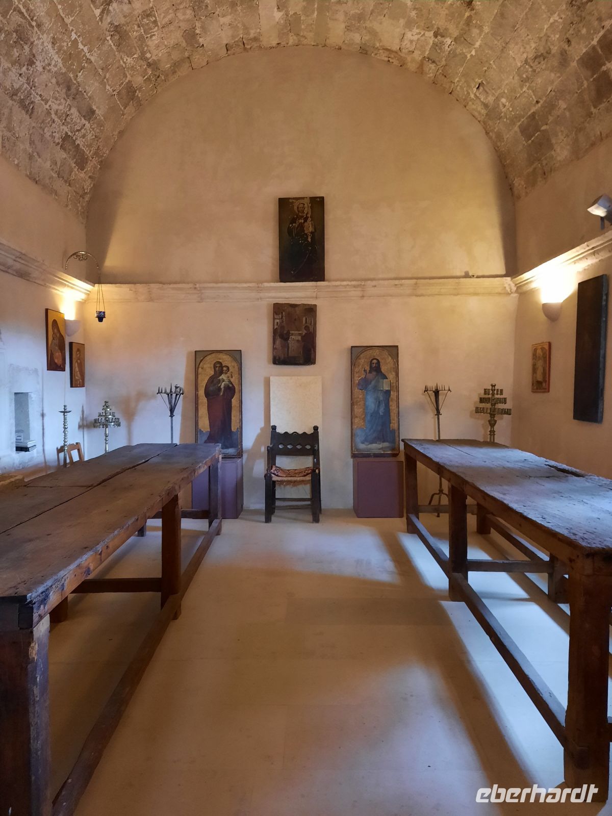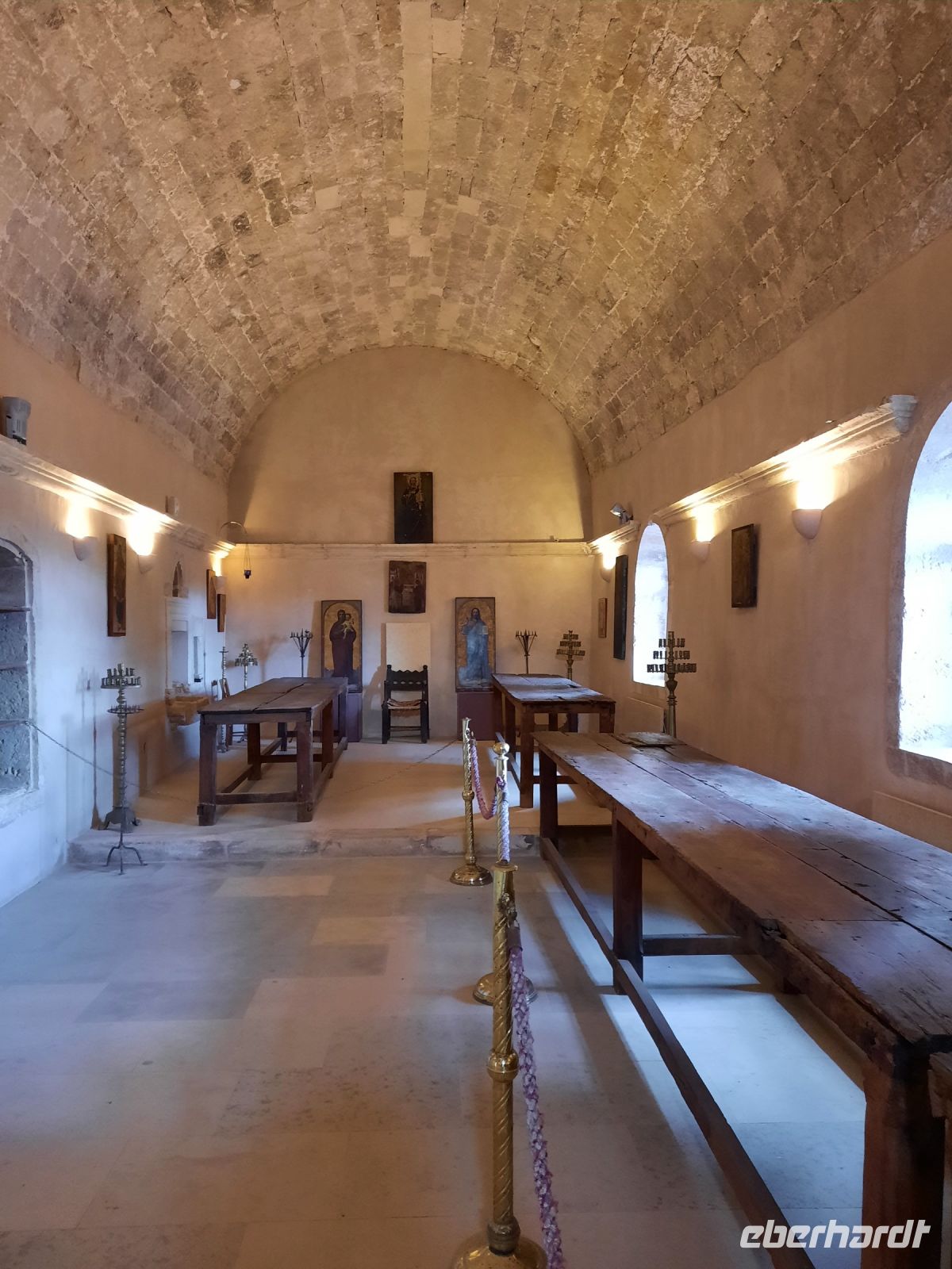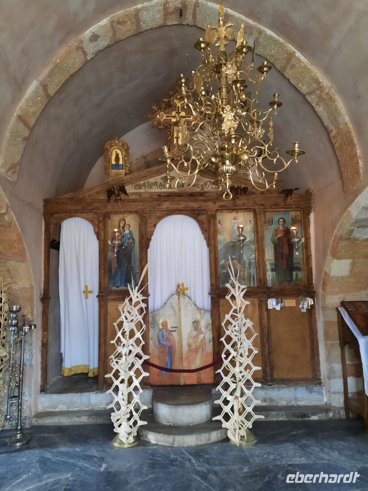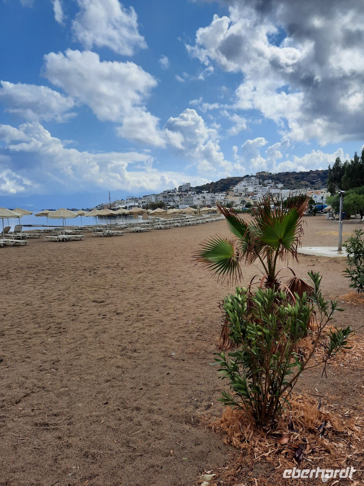 Unsere Ausflugsziele lagen heute im Osten der Insel. An Malia und an der Schlucht des Heiligen Georg vorbei, verließen wir zunächst die Küste, um in den waldlosen und eher karg wirkenden Osten Kretas zu gelangen. An der Hafenstadt Gournia legten wird einen kurzen Fotostopp ein. Hier in den Hügeln sind immerhin die Reste der antiken Hafenstadt aus minoischer Zeit zu sehen. Weiter fuhren wir durch wundervolle Gebirgslandschaften und wenig später an schier endlosen Mandel-und Olivenhainen vorbei. Vereinzelt waren sogar noch venezianische Getreidemühlen zu sehen. In der Nähe von Platanos hielten wir an einem kleinen Café mit tollen Ausblicken auf die Nordostküste Kretas. Vorbei an Sitia ging es über eine Serpentinenstraße ins trockene, felsige Bergland hinein. Schon von weitem konnten wir den Glockenturm des Klosters Toplou erkennen. Diese festungsähnliche Anlage gehört immerhin noch heute zu den reichsten Klöstern Kretas. Unsere Augen erfreuten sich an der Ikonensammlung und der schönen Innenhof-Gestaltung. Am Nachmittag zog es uns dann bei herrlichen Temperaturen um die 27 Grad ans Meer. Wir hatten dementsprechend ein Ziel und wollten den berühmten Palmenstrand von Vai genießen. Wir fühlten uns übrigens wie an der Südsee und träumen vor uns hin... Zurück fuhren wir später die gleiche Strecke, allerdings nicht ohne einen Halt bei einer Bananen-Händlerin, wo wir typisch kretische Früchte und andere Produkte kaufen konnten.