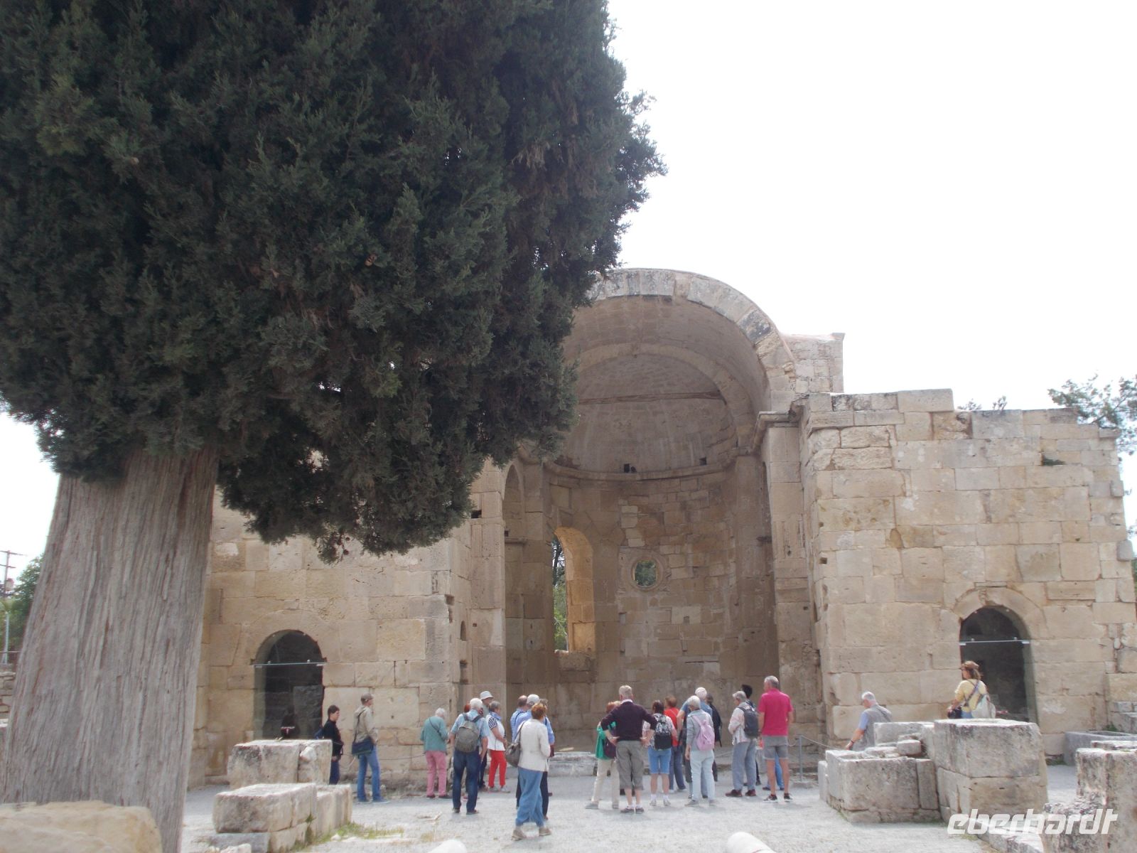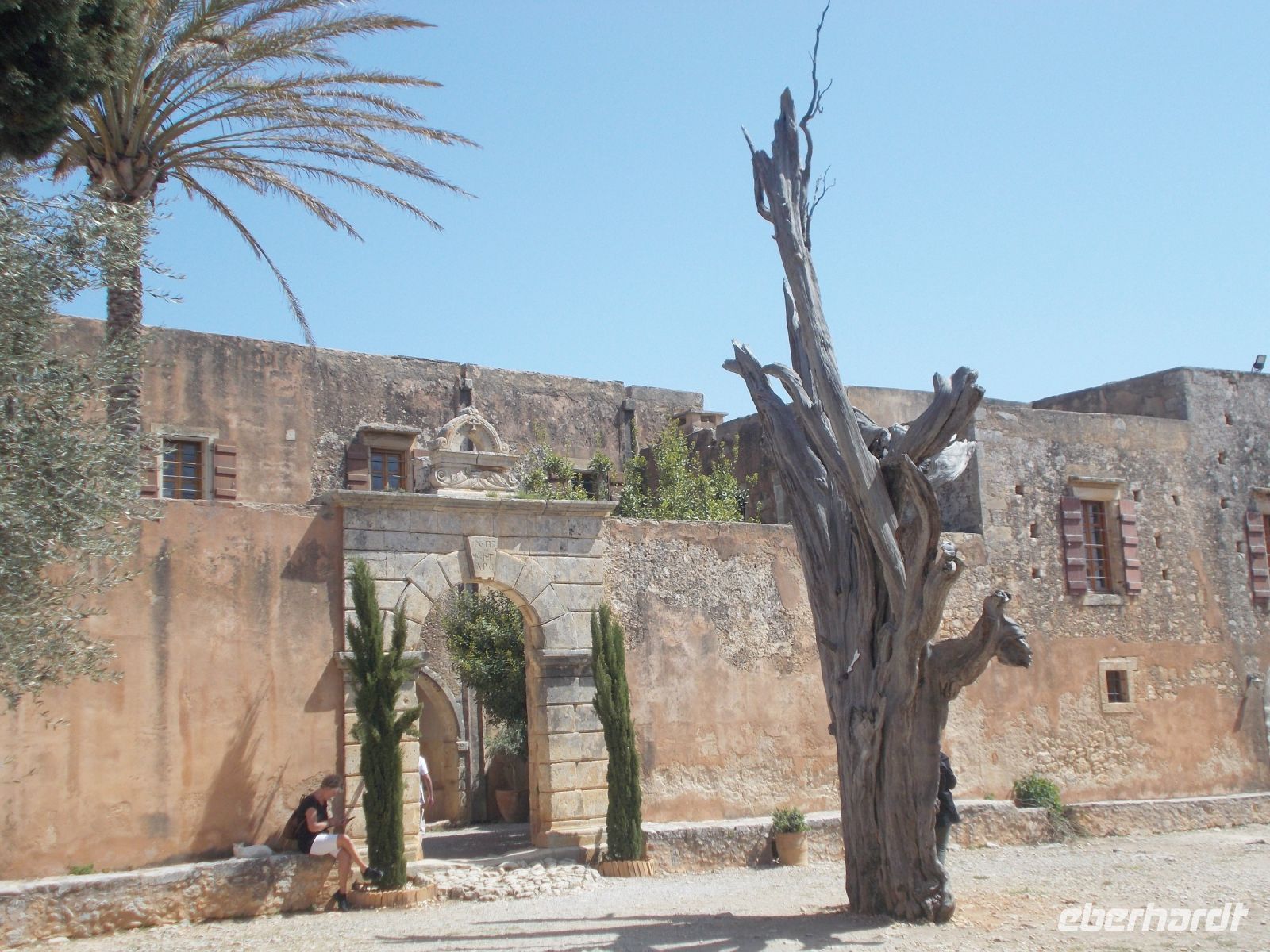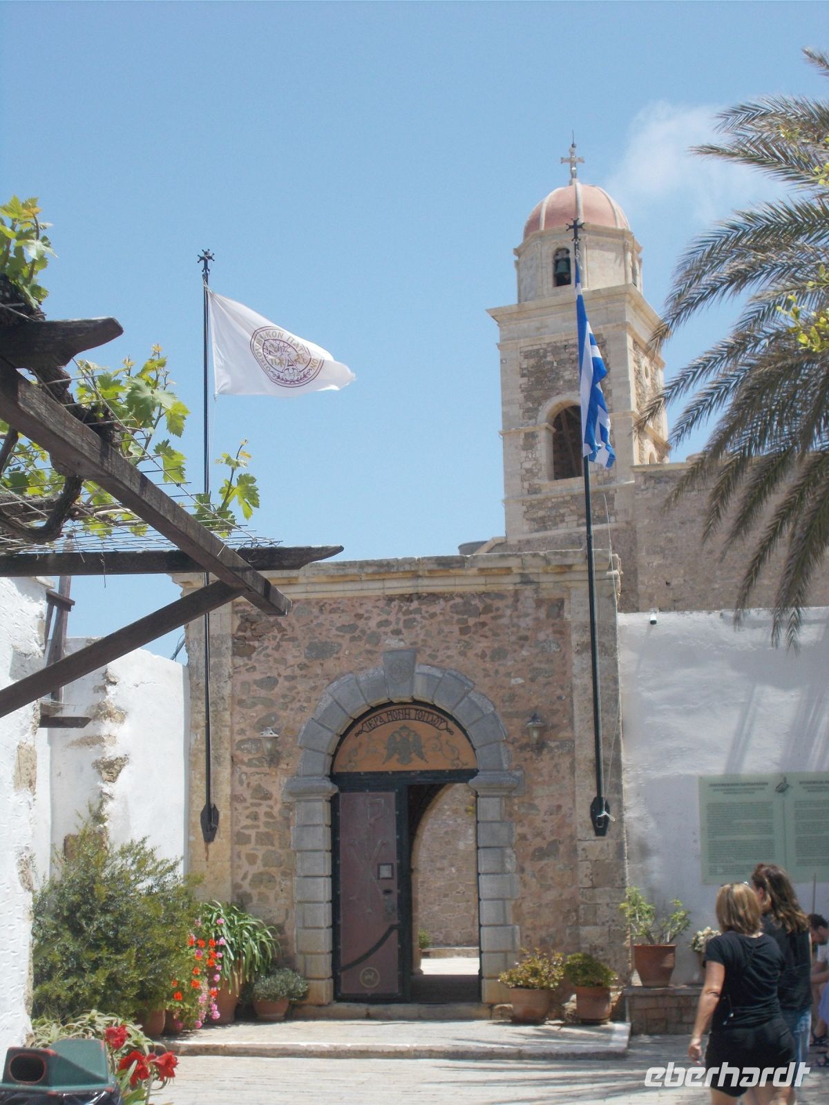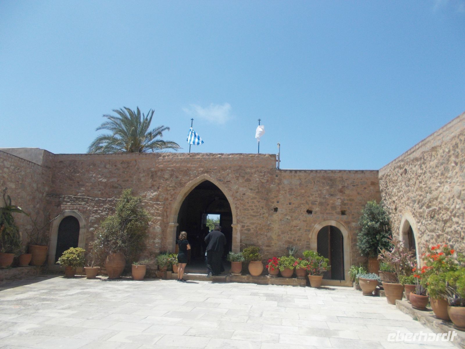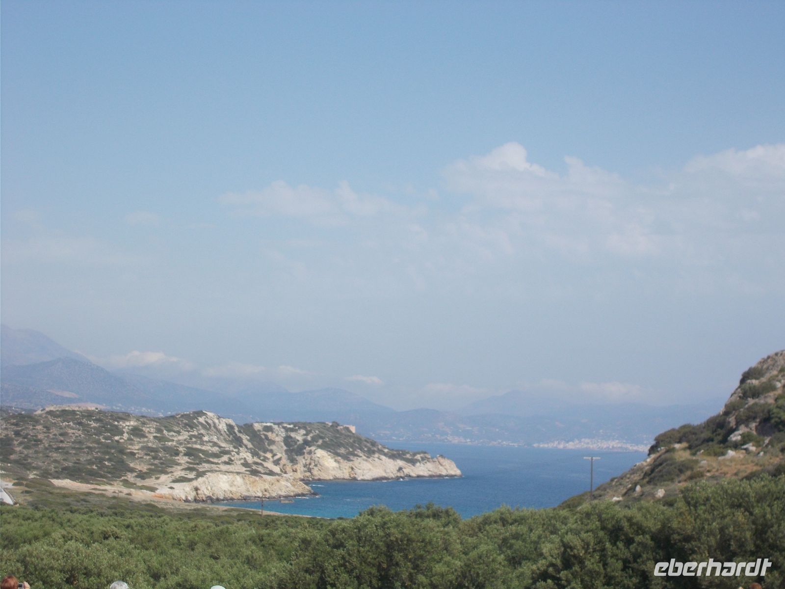 Von der Nordküste bis zum östlichsten Kap sollte unsere Reise heute gehen. Den ersten Stopp machten wir bei Gournia, der antiken Hafenstadt aus minorischer Zeit. Die Ausgrabungen wurden eingerahmt von der blühenden Mittelmeer-Fauna. Der Blick zur Laus- Insel ließ uns schon wieder die Fotoapparate zücken.Wir fuhren durch die ständig wechselnde Landschaft des Diktigebirges und hatten immer wieder mal einen tollen Blick aufs Meer. In Sitia unternahmen wir einen Bummel entlang der Strand- Promenade. Jetzt wussten wir warum sie „weiße Stadt am Meer“ genannt wird. Weiter hoch in die Berge führte unser Weg zu einem der reichsten und schönsten Klöster Kretas. Das Kloster Toplou, welches wie eine Festung gebaut wurde, faszinierte uns mit seiner Ikonen Sammlung. Hier gibt es auch ein vorzügliches Olivenöl zu kaufen. Irini unterrichtete uns, auf der Fahrt dorthin, zur Qualität und Herstellung des flüssigen Goldes. Untermalt wurde dies auch mit der dazugehörigen Göttersage, zum heiligen Olivenbaum und dem Musikinstrument Lyra. Selbst der Palmenstrand von Vai ,soll zum Kloster Toplou gehören und den besuchten wir im Anschluss. Hier genossen wir ein kühles Bad und fühlten uns wie in der Südsee. Auf der Heimfahrt lauschten wir griechischen Klängen und ließen den schönen Tag Revue passieren.