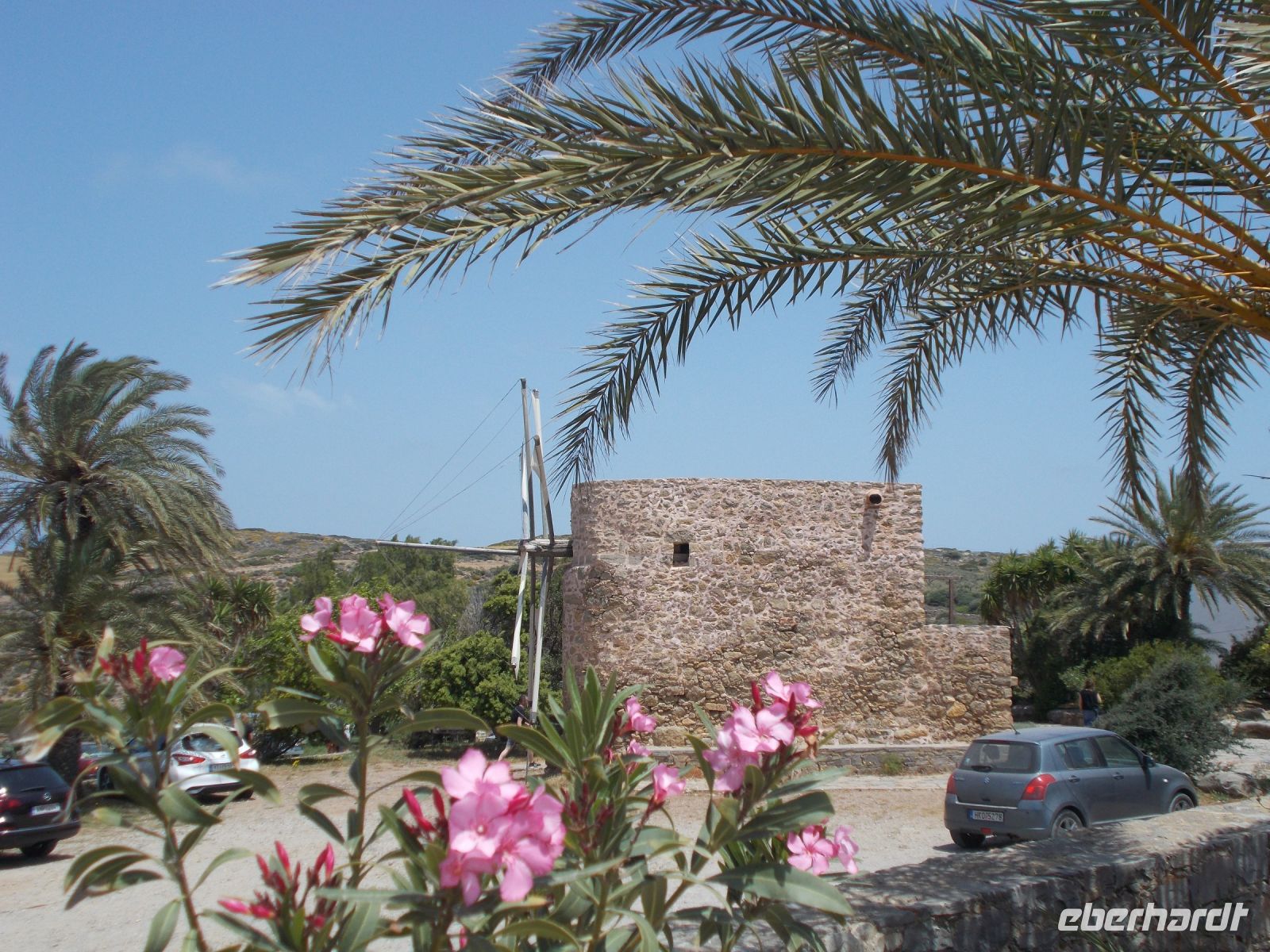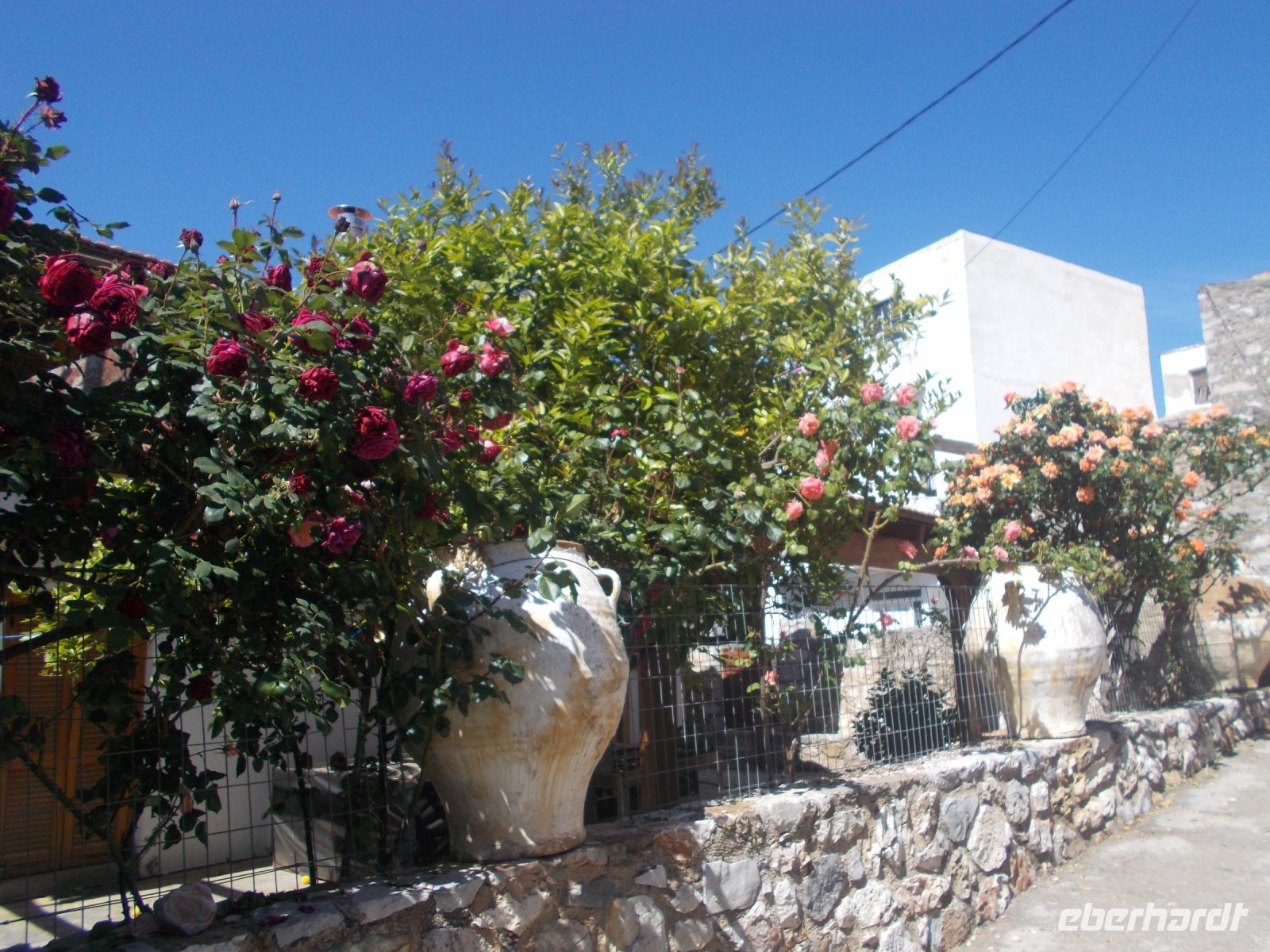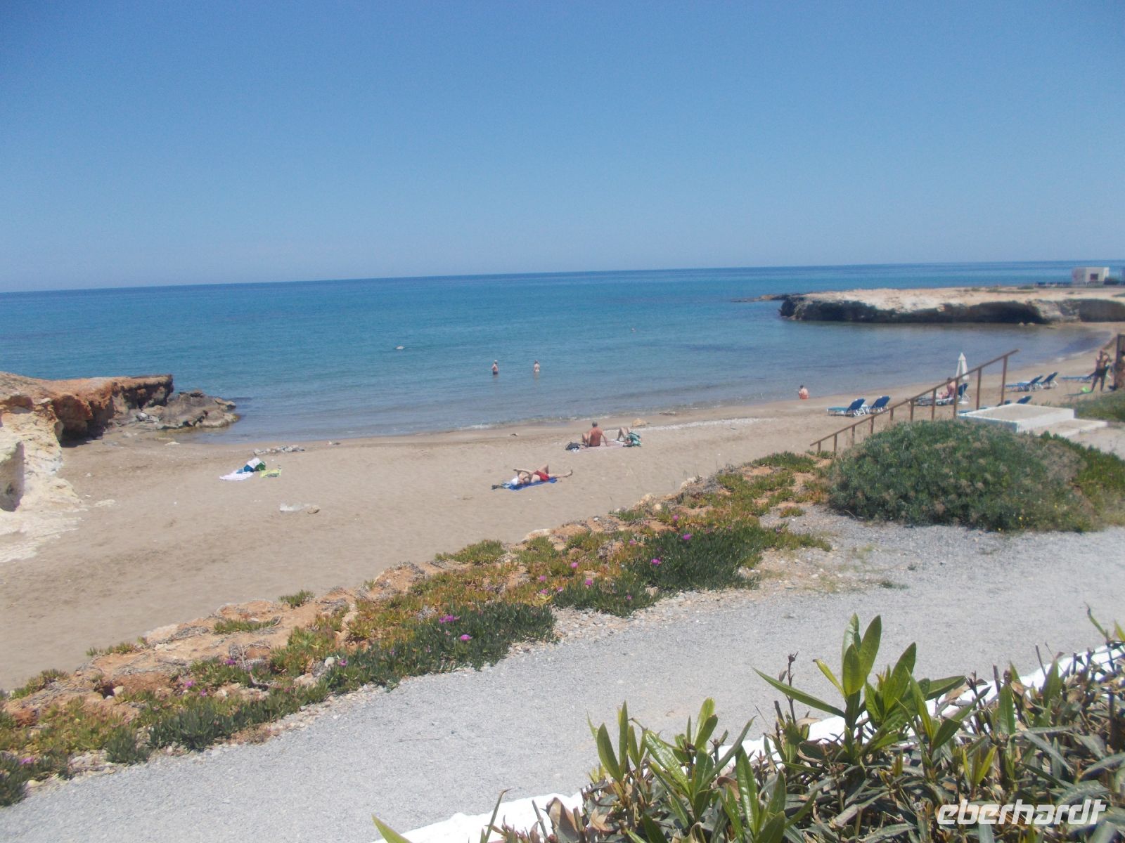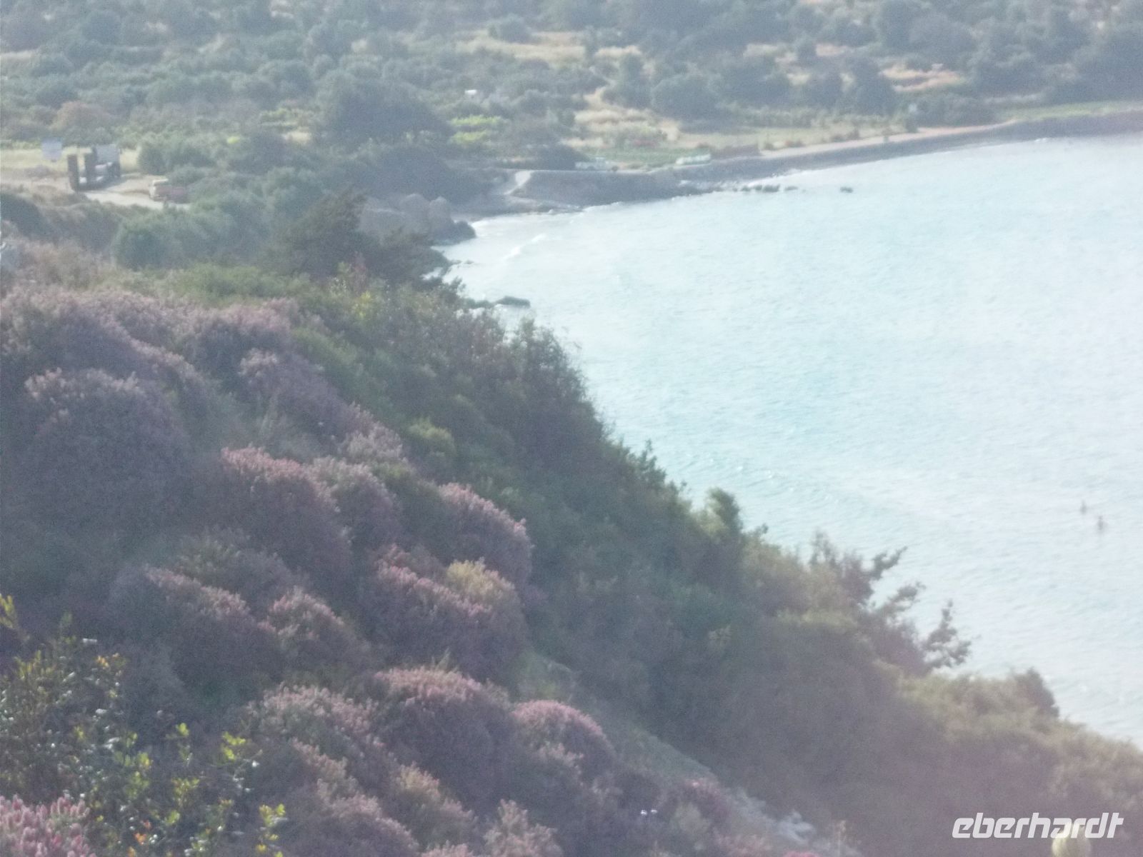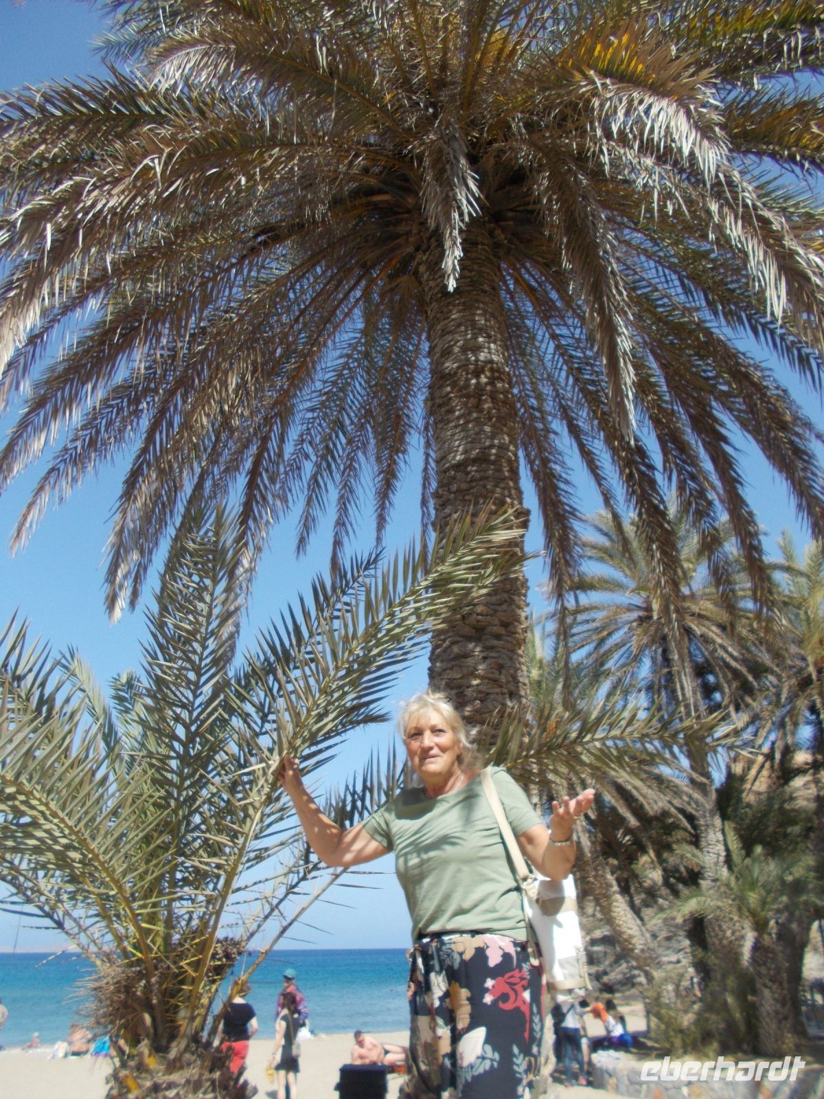 Von der Nordküste bis zum östlichsten Kap sollte unsere Reise heute gehen. Den ersten Stopp machten wir bei Gournia, der antiken Hafenstadt aus minorischer Zeit. Die Ausgrabungen wurden eingerahmt von der blühenden Mittelmeer-Fauna. Der Blick zur Laus- Insel ließ uns schon wieder die Fotoapparate zücken.Wir fuhren durch die ständig wechselnde Landschaft des Diktigebirges und hatten immer wieder mal einen tollen Blick aufs Meer. In Sitia unternahmen wir einen Bummel entlang der Strand- Promenade. Jetzt wussten wir warum sie „weiße Stadt am Meer“ genannt wird. Weiter hoch in die Berge führte unser Weg zu einem der reichsten und schönsten Klöster Kretas. Das Kloster Toplou, welches wie eine Festung gebaut wurde, faszinierte uns mit seiner Ikonen Sammlung. Hier gibt es auch ein vorzügliches Olivenöl zu kaufen. Irini unterrichtete uns, auf der Fahrt dorthin, zur Qualität und Herstellung des flüssigen Goldes. Untermalt wurde dies auch mit der dazugehörigen Göttersage, zum heiligen Olivenbaum und dem Musikinstrument Lyra. Selbst der Palmenstrand von Vai ,soll zum Kloster Toplou gehören und den besuchten wir im Anschluss. Hier genossen wir ein kühles Bad und fühlten uns wie in der Südsee. Auf der Heimfahrt lauschten wir griechischen Klängen und ließen den schönen Tag Revue passieren.