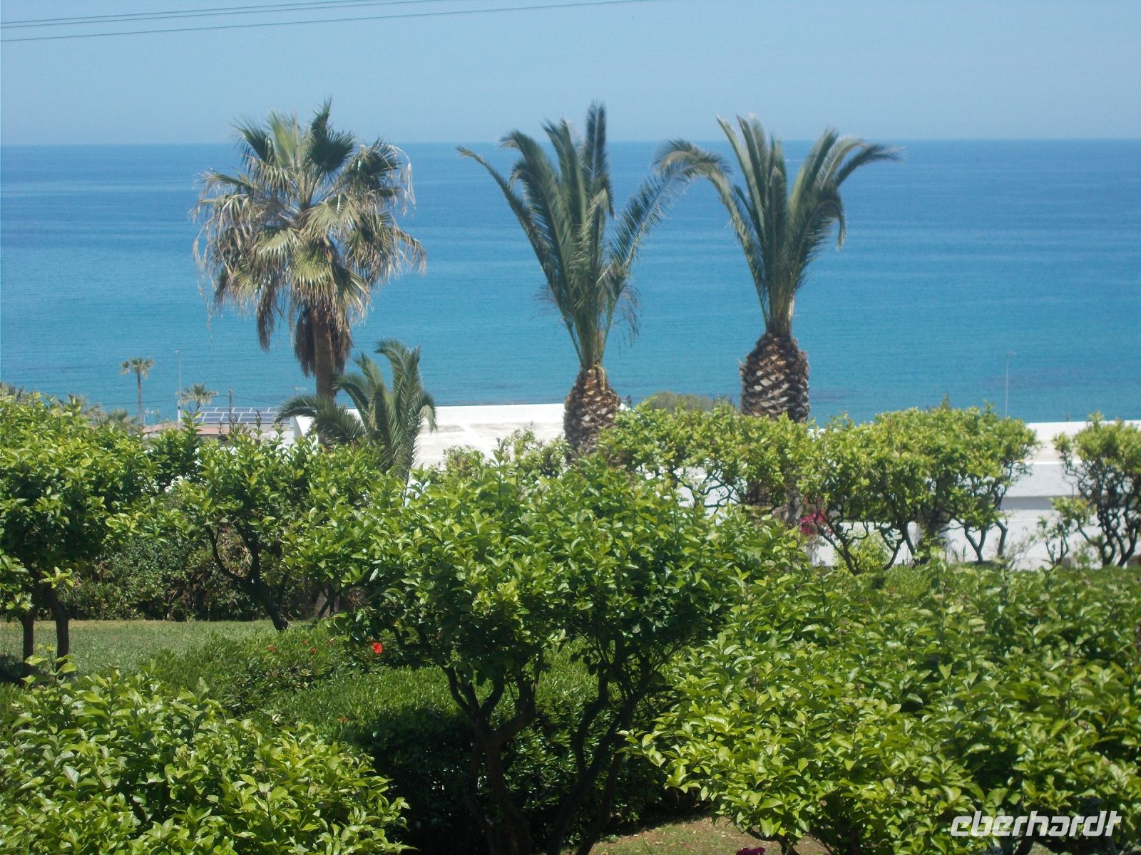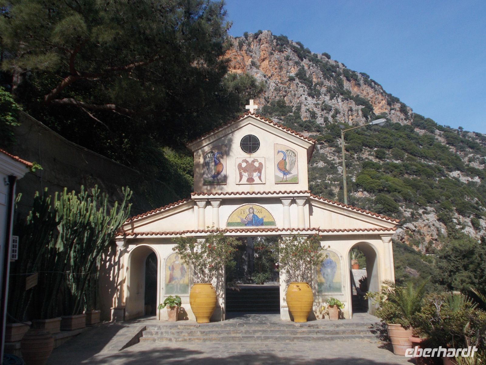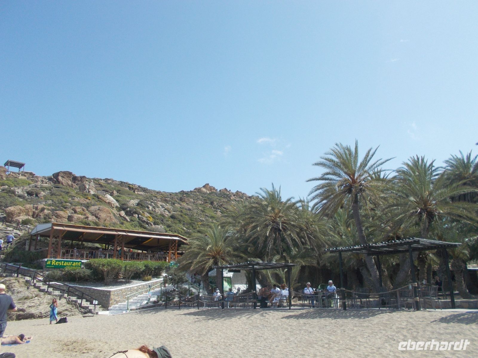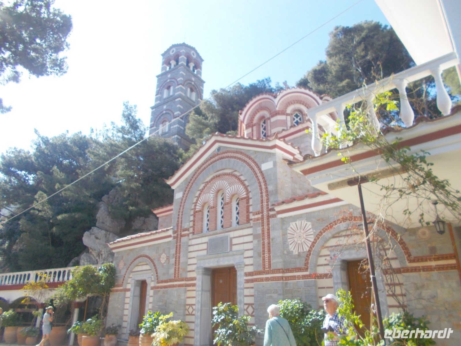 Von der Nordküste bis zum östlichsten Kap sollte unsere Reise heute gehen. Den ersten Stopp machten wir bei Gournia, der antiken Hafenstadt aus minorischer Zeit. Die Ausgrabungen wurden eingerahmt von der blühenden Mittelmeer-Fauna. Der Blick zur Laus- Insel ließ uns schon wieder die Fotoapparate zücken.Wir fuhren durch die ständig wechselnde Landschaft des Diktigebirges und hatten immer wieder mal einen tollen Blick aufs Meer. In Sitia unternahmen wir einen Bummel entlang der Strand- Promenade. Jetzt wussten wir warum sie „weiße Stadt am Meer“ genannt wird. Weiter hoch in die Berge führte unser Weg zu einem der reichsten und schönsten Klöster Kretas. Das Kloster Toplou, welches wie eine Festung gebaut wurde, faszinierte uns mit seiner Ikonen Sammlung. Hier gibt es auch ein vorzügliches Olivenöl zu kaufen. Irini unterrichtete uns, auf der Fahrt dorthin, zur Qualität und Herstellung des flüssigen Goldes. Untermalt wurde dies auch mit der dazugehörigen Göttersage, zum heiligen Olivenbaum und dem Musikinstrument Lyra. Selbst der Palmenstrand von Vai ,soll zum Kloster Toplou gehören und den besuchten wir im Anschluss. Hier genossen wir ein kühles Bad und fühlten uns wie in der Südsee. Auf der Heimfahrt lauschten wir griechischen Klängen und ließen den schönen Tag Revue passieren.