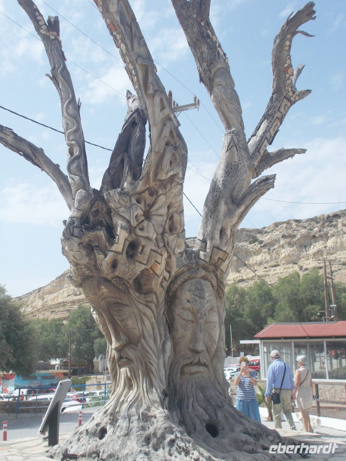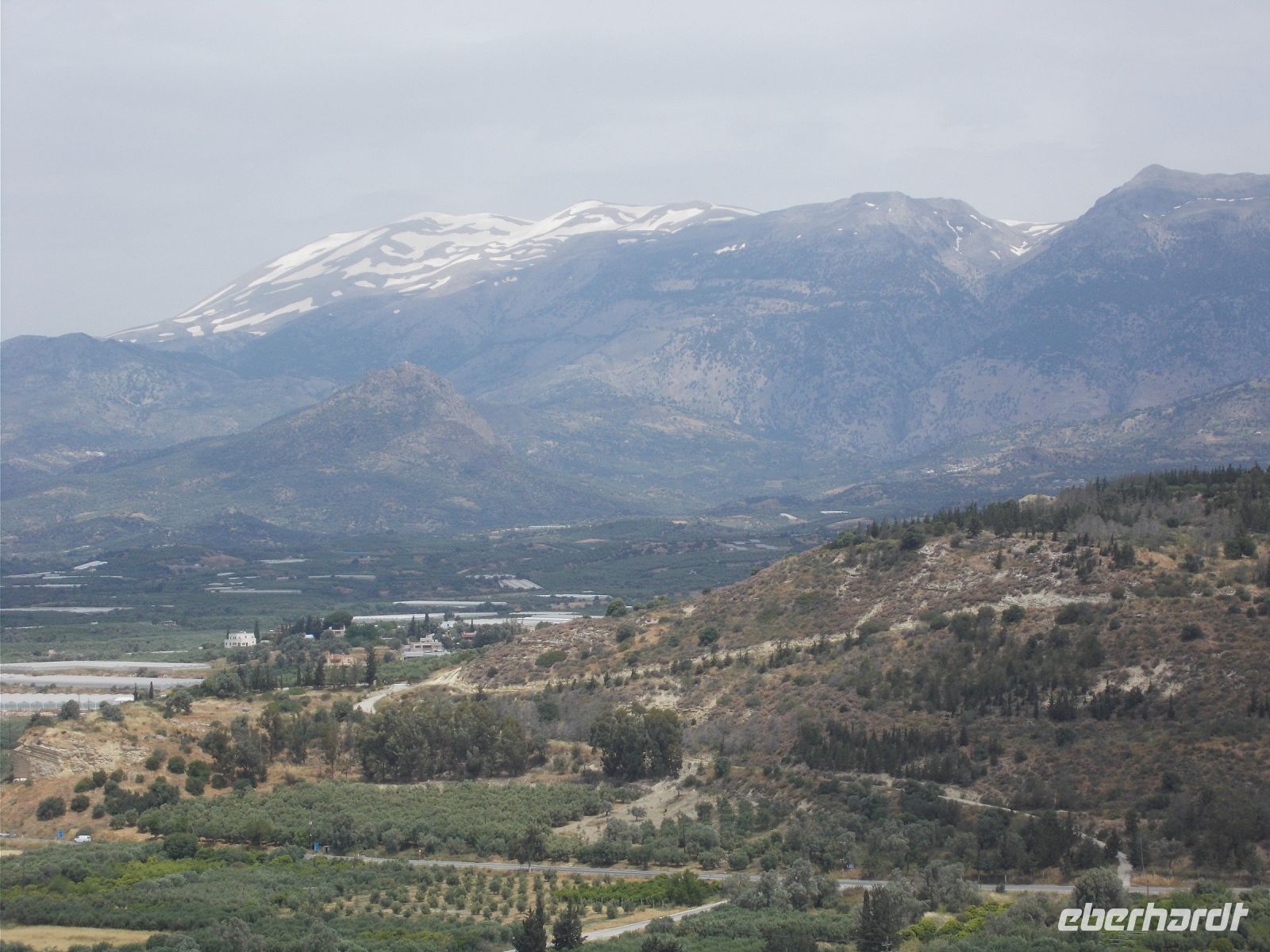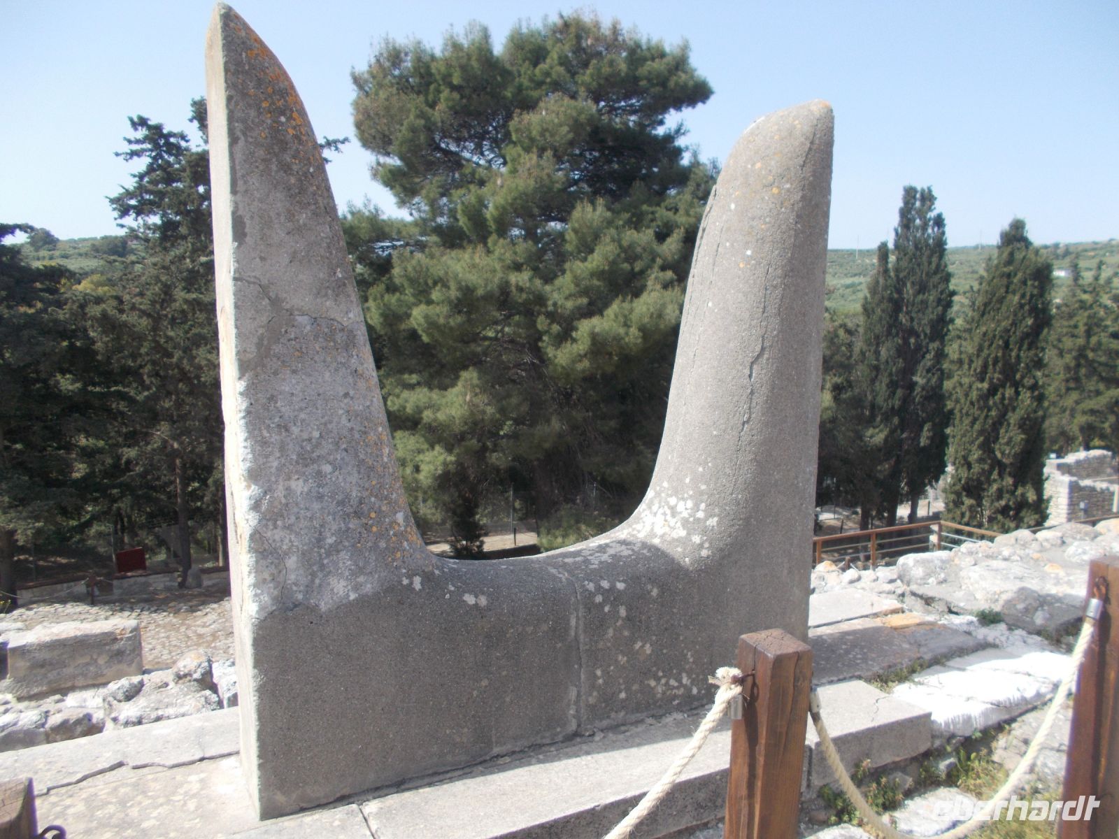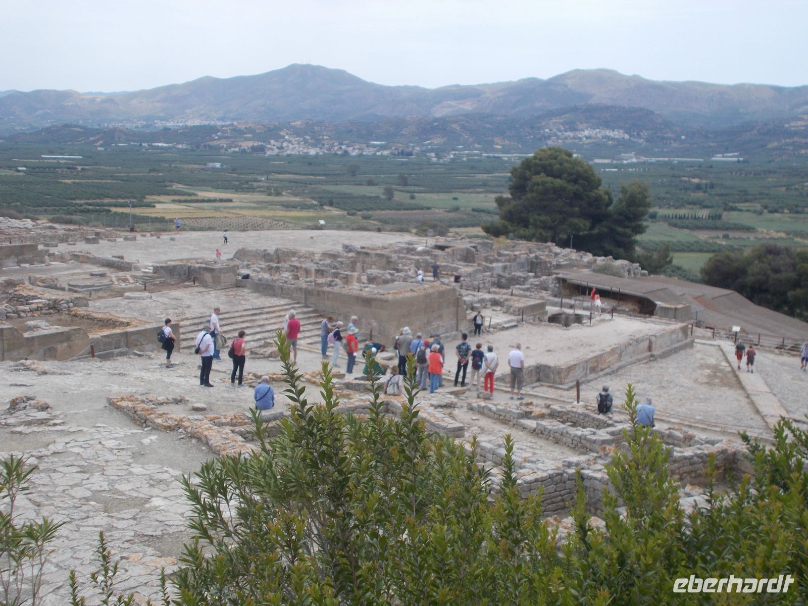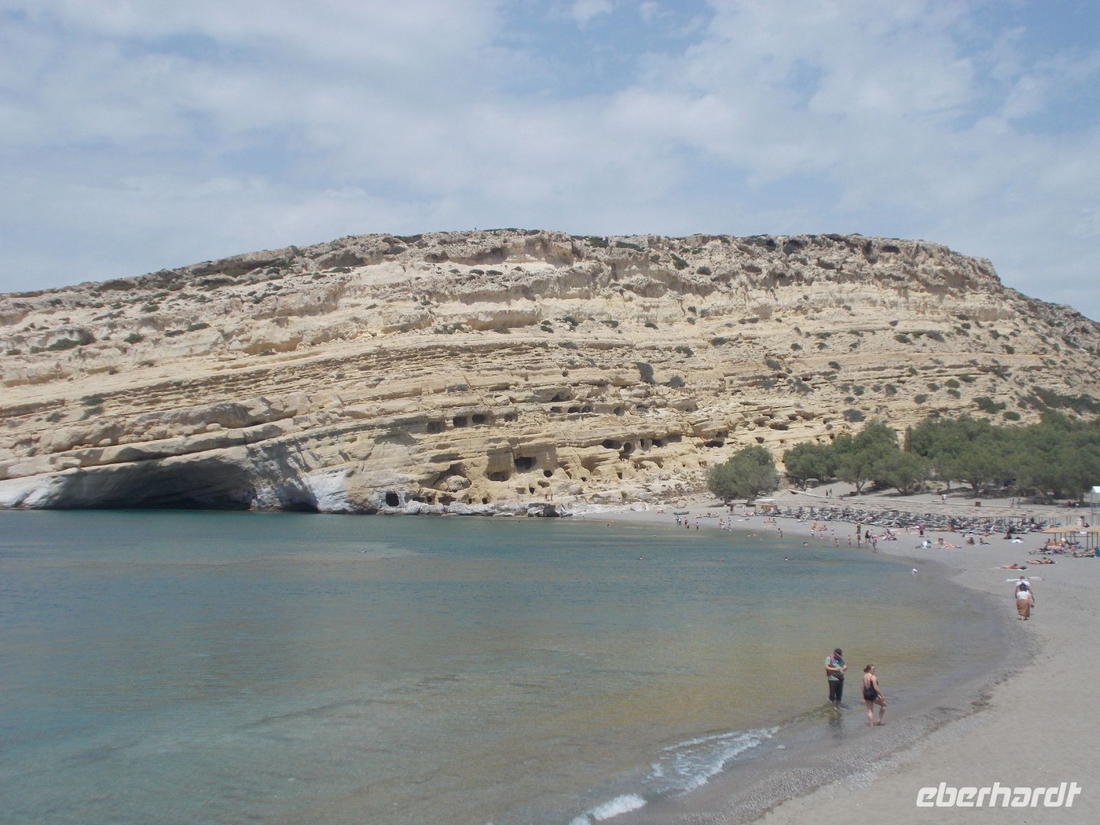 Heute ging es von Nord nach Süd. Vom Kretischen Meer fuhren wir ans Lybische Meer, wir teilten so zu sagen die Insel. Wir durchquerten die fruchtbare Messara Tiefebene, wo unzählige Weinreben, Olivenhaine und Mandelbäume zu sehen waren. Die Hauptstadt der antiken Welt, sollte unser erstes Ziel sein. In Gortis bestaunten wir eines der ältesten christlichen Monumente ,die Titus Basilika. Ein besonderer Höhepunkt bildete die, im Odeon in Stein gemeißelte, erste Gesetzesschrift Europas. Natürlich wandelten wir auch auf den Spuren der „Sagenwelt “ und besuchten die immergrüne Platane von Zeus und Europa. Weiter fuhren wir nach Festos, auf einen kleinen Plateau gelegen. Von den Überresten, des minoischen Palasts aus, hatten wir einen Panoramablick, von der Messara Ebene bis zum Psiloritis Gebirge,wo die Gipfel noch mit Schnee bedeckt waren. Der Alte- sowie der Neue Palast wurden nicht wieder rekonstruiert und unsere Fantasie war gefragt.Mit diesem Besuch verabschiedeten wir uns auch von der Geschichte der Minoer. Es zog uns weiter nach Matala. Dort wo Zeus mit Europa an Land ging, schwebt heute noch das Flair der „ Blumenkinder“ .Wir nutzten die Zeit und ließen uns von der Unbeschwertheit, dieses hübschen Badeortes, treiben.Wir schauten zu den markanten Felsenhöhlen , die einst als Gräber dienten und später zur Behausung der Hippie -Szene umfunktioniert wurden. Einige Gäste prüften auch den „Salzgehalt „des lybischen Meeres ,bei einem erfrischenden Bad. Auf der Heimfahrt erzählte Irini, wieder Geschichten aus der Sagenwelt, die eigentlich auch in Grimms Märchenwelt spielen könnten. Im Bus wurde mit Quzo zum Muttertag angestoßen.