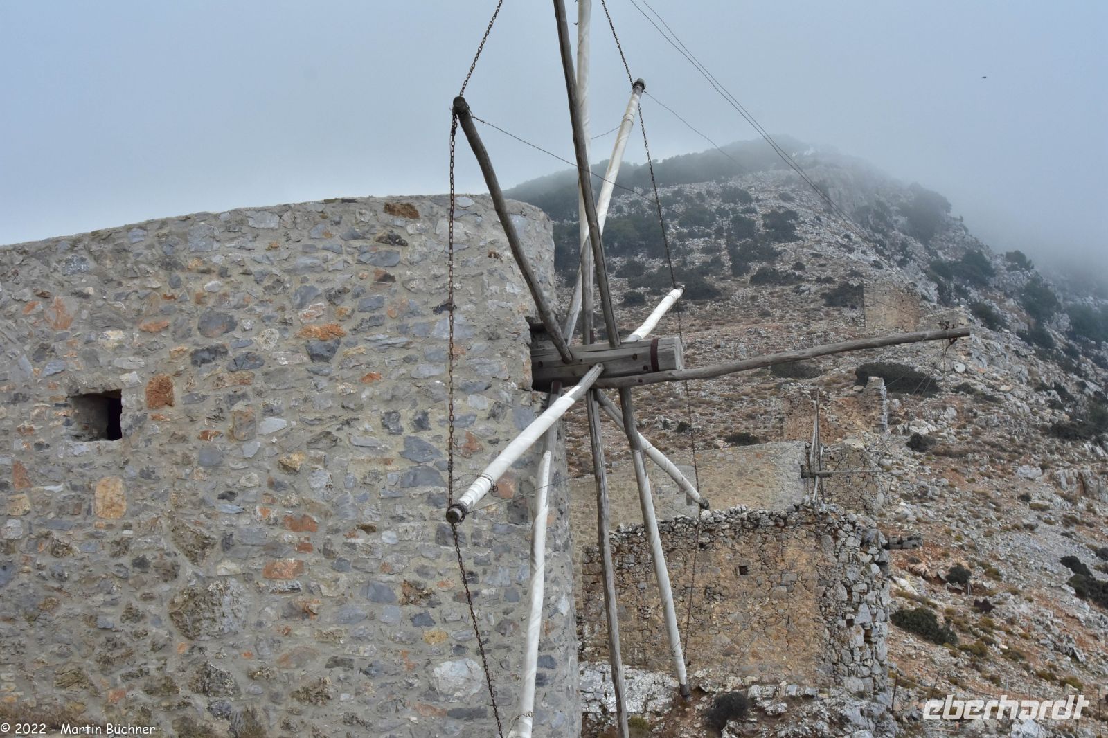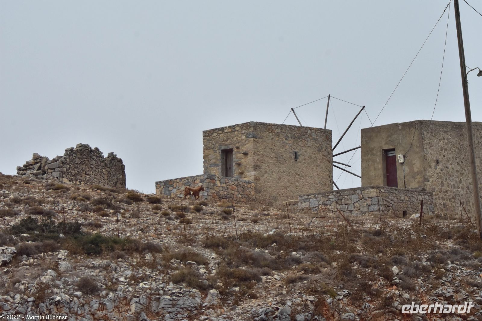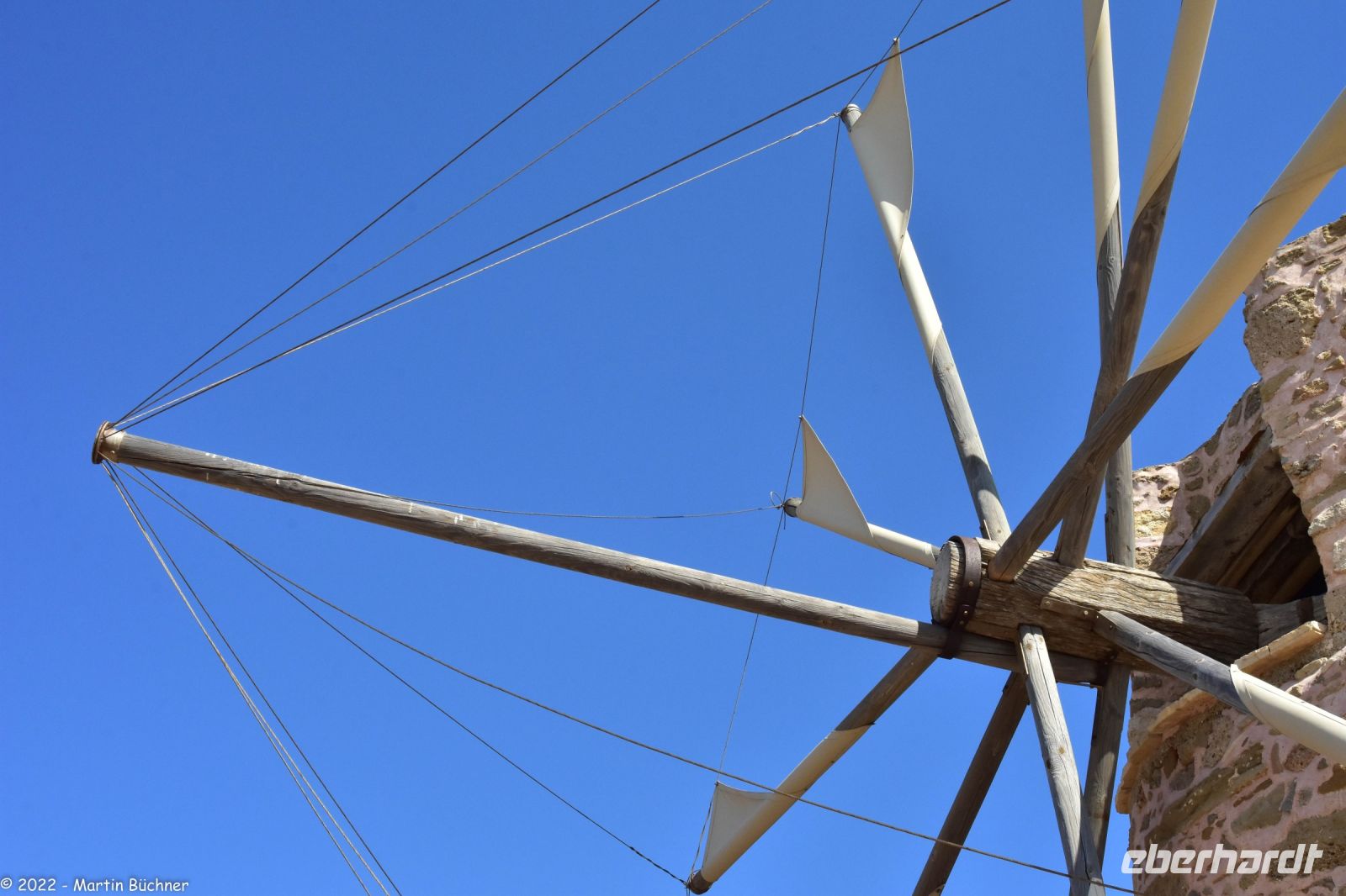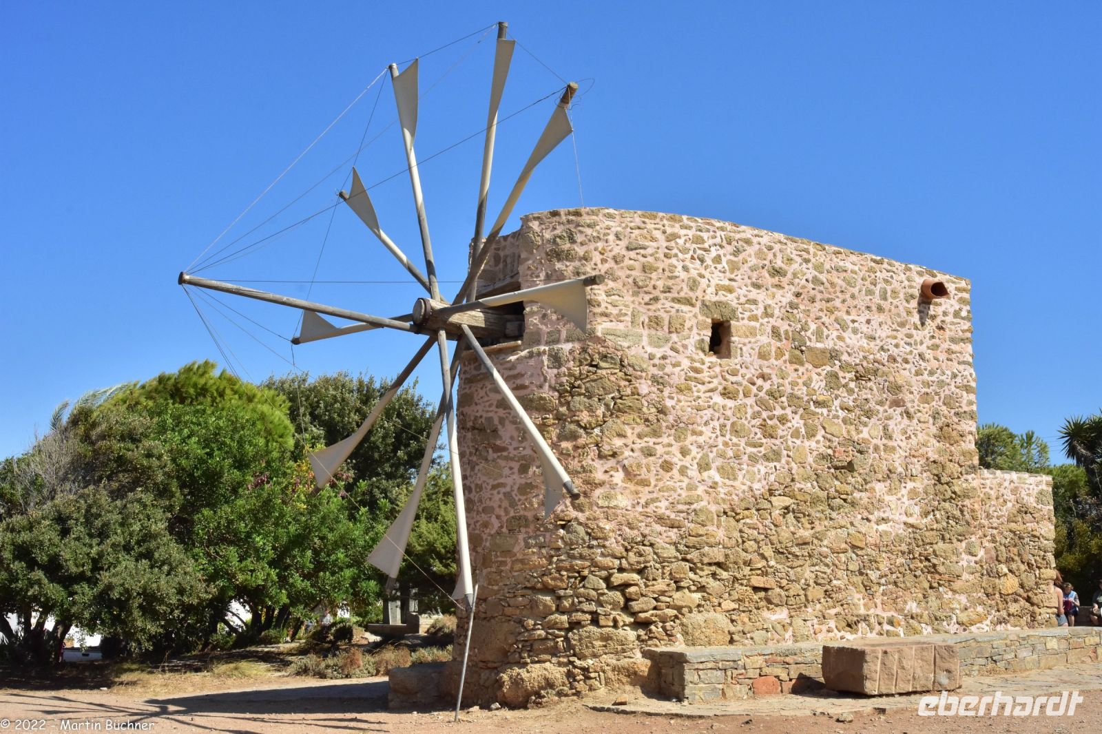 Am Pass von Ambelos = „der Weinrebenpass“ verlassen wir die Hochebene wieder in Richtung Norden. Zeit für eine Mittagspause. Am Pass weht der beständige Nordwind Meltemi. Dies veranlasste die Menschen in venezianischer Zeit 24 Getreidewindmühlen zu errichten. Die meisten davon verfielen zu Ruinen, zwei wurden restauriert. Nach dem Mittagessen bleibt Zeit für eine Erkundung. Die Bauweise ist durchaus interessant, da mitteleuropäische Mühlen in der Regel drehbar gebaut wurden, um sie je nach Bedarf in den Wind drehen zu können, die venezianischen Windmühlen hingegen waren fix ausgerichtet auf eine Windrichtung. Aufgrund der immer gleichen Winde, war eine drehbare Mühle nicht nötig. Am Nachmittag blieb Zeit für Freizeit und individuelle Erkundungen.