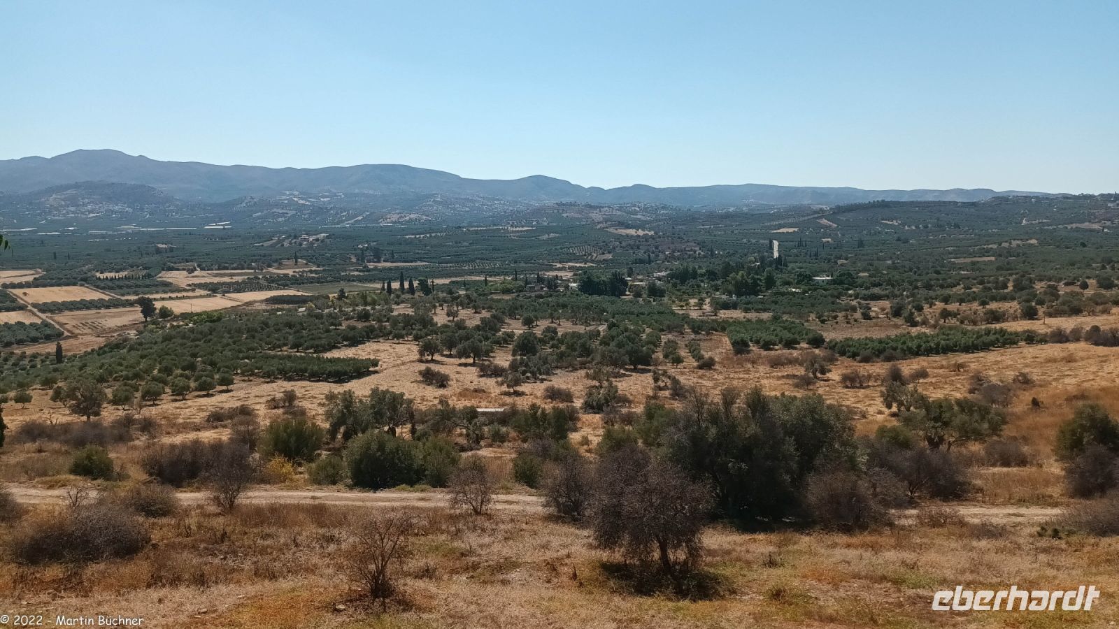 Mit dem Bus geht es zunächst in Richtung Heraklion, bevor die Straße nach Süden abzweigt. Wir erreichen die Messara-Ebene. Sie ist eine etwa 50x8 km weite Ebene, an drei Seiten eingebettet von hohen Bergen (im Ida-Gebirge bis 2.500 Meter Höhe), im Westen fällt sie zum libyschen Meer hin ab.