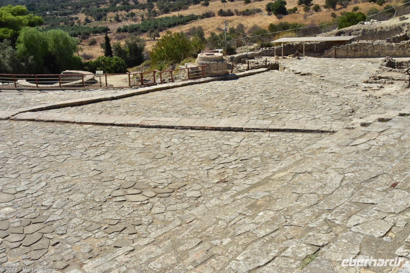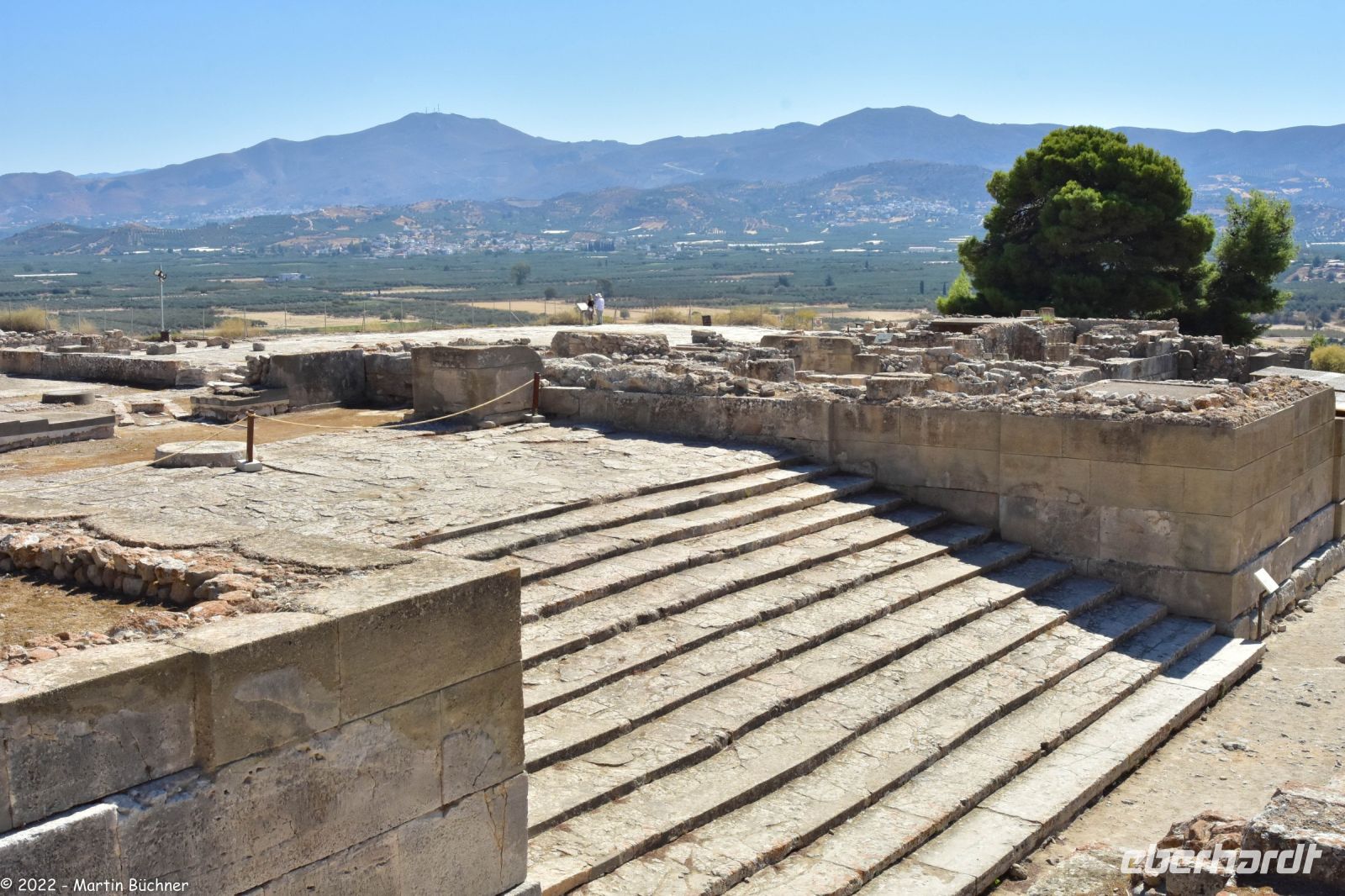 Wir reisen weiter in den minoischen Palast von Phaistos (neugriechisch Faistos). Nach Knossos ist es der zweitgrößte minoische Palast auf Kreta. Der Legende nach soll Rhadamanthys, der Bruder des König Minos, erster Herrscher des Palastes gewesen sein.