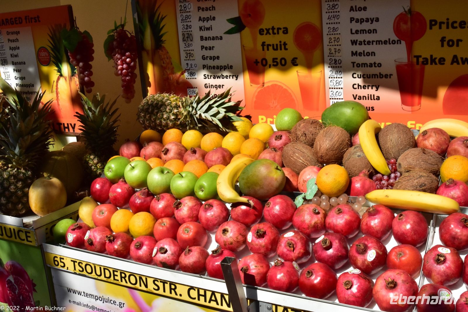 Zurück am Parkplatz angekommen stärken wir uns mit frisch gepressten Orangen-Granatapfel-Säften. Mit dem Bus umrunden wir die Lasithi-Hochebene.