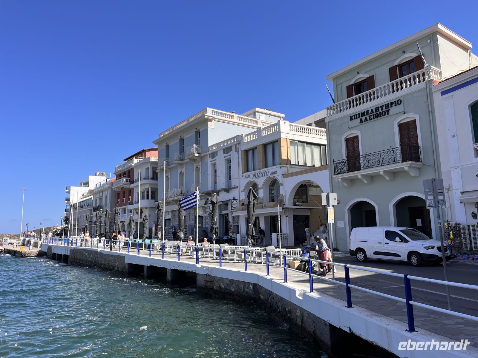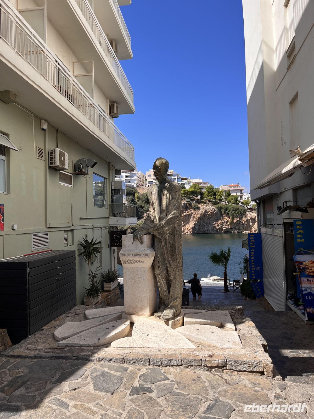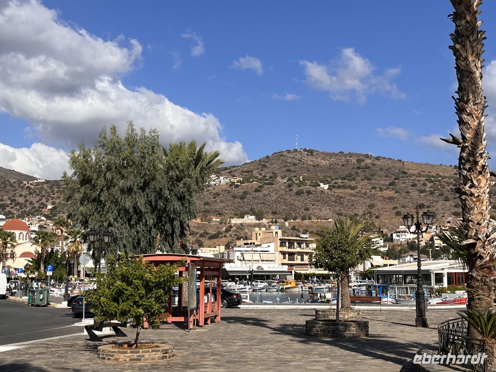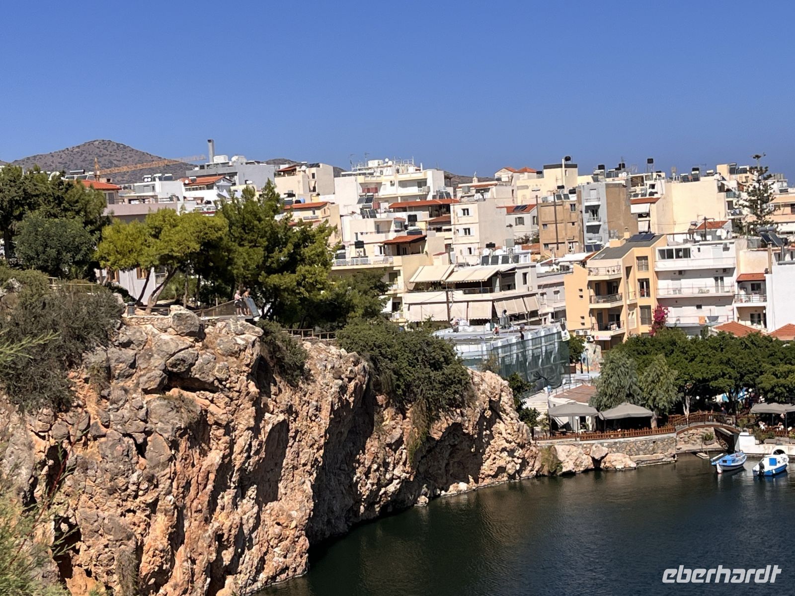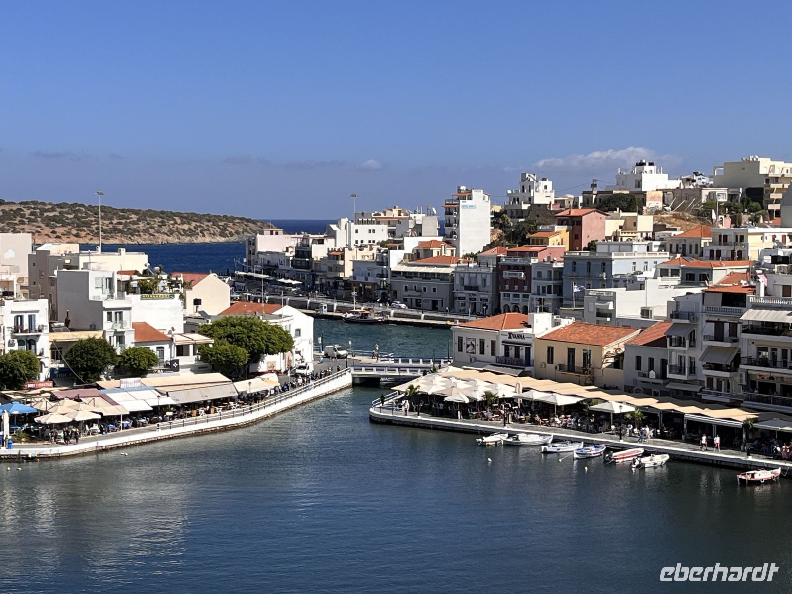 Auch in Agios Nikolaos machen wir einen Stopp. Agios Nikolaos ist – neben Chania – für viele Kreta-Fans die schönste Stadt dieser griechischen Insel. In der Mitte des Ortes befindet sich der durch einen Kanal mit dem Meer zusammenhängende Voulismeni-See. Er erreicht in der Mitte eine Tiefe bis zu 64m und ist mit vielen griechischen Mythen verbunden. Von zwei Seiten umgeben wird er von zahlreichen Tavernen und Cafes, von denen aus man auf die im ruhigen Wasser dümpelnden, bunten Fischerboote schaut. Die anderen beiden Seiten ragt eine Felsküste steil hinauf, auf deren Gipfel ein kleiner Park mit befestigten Wanderwegen zum Spazieren und zum Fotografieren einlädt. Nahezu alle Straßen und viele der kleinen malerischen Gassen von Agios Nikoalos führen früher oder später zu einem kleinen Kreisverkehr einige hundert Meter oberhalb des Sees. Die hier befindlichen Tavernen und Cafenias sind vor allem bei den Einheimischen sehr beliebt.