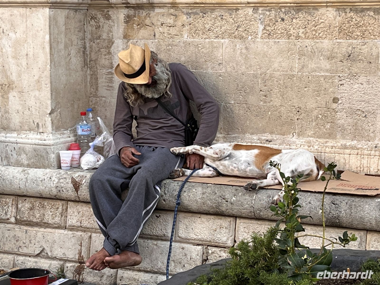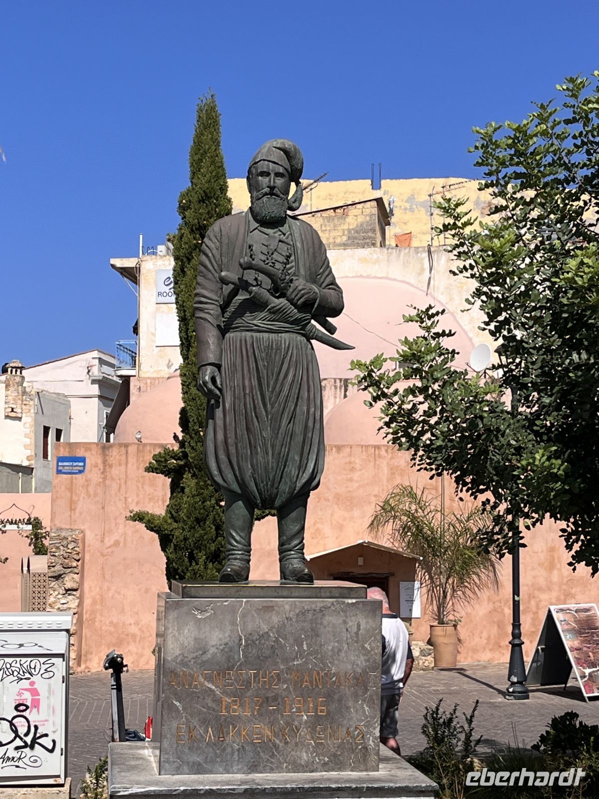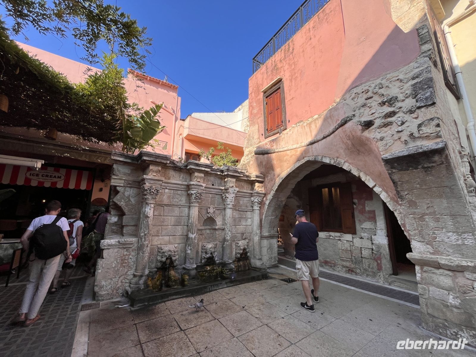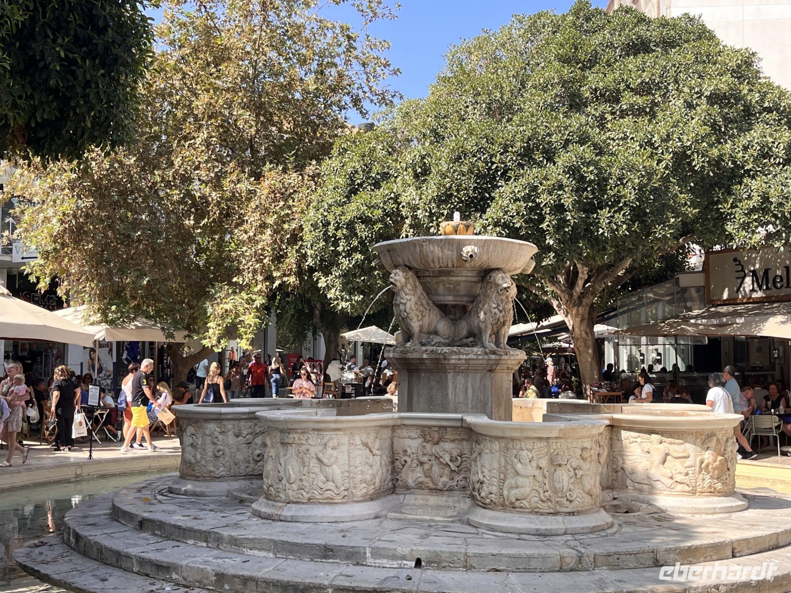 Unser nächstes Ziel war der Morosinibrunnen [auch Löwenbrunnen; erbaut 1628) auf der von zahlreichen Straßencafés umgebenen Platia Venizelou im Herzen der Stadt. Der aus acht reliefgeschmückten Wasserbecken mit einer von vier steinernen Löwen getragenen Wasserschale in der Mitte bestehende Brunnen wurde über ein 15 km langes Aquädukt aus den Quellen von Archanes gespeist. Georgios brillierte durch sein Wissen über die Stadt.