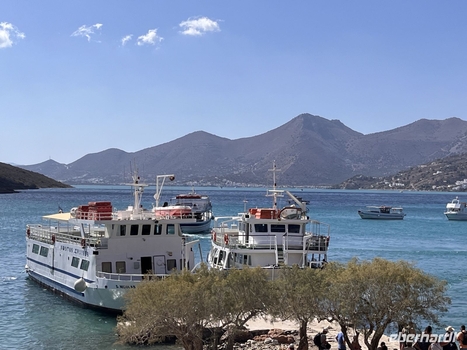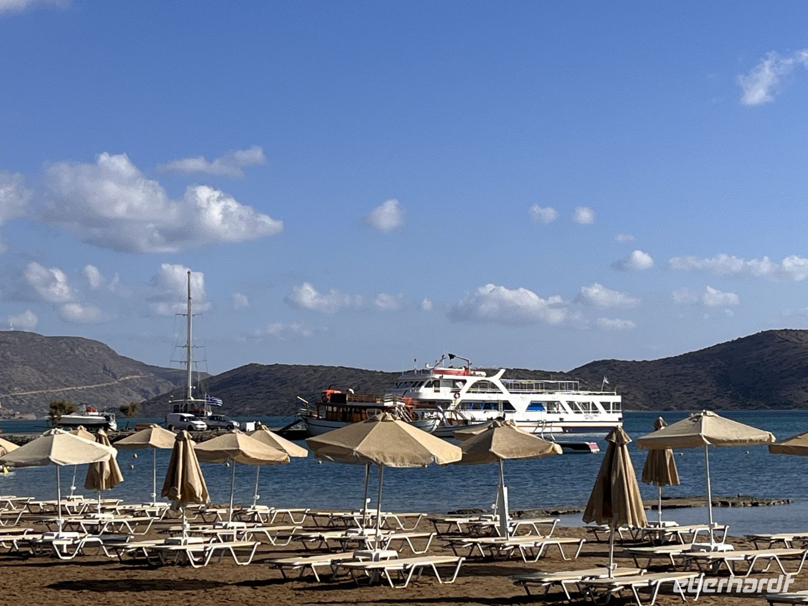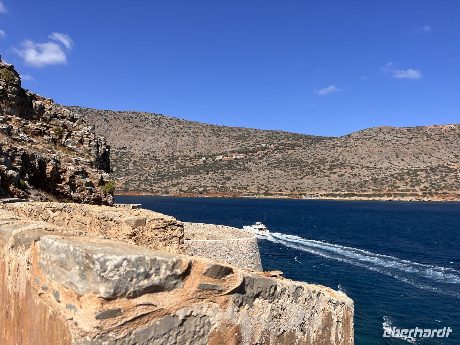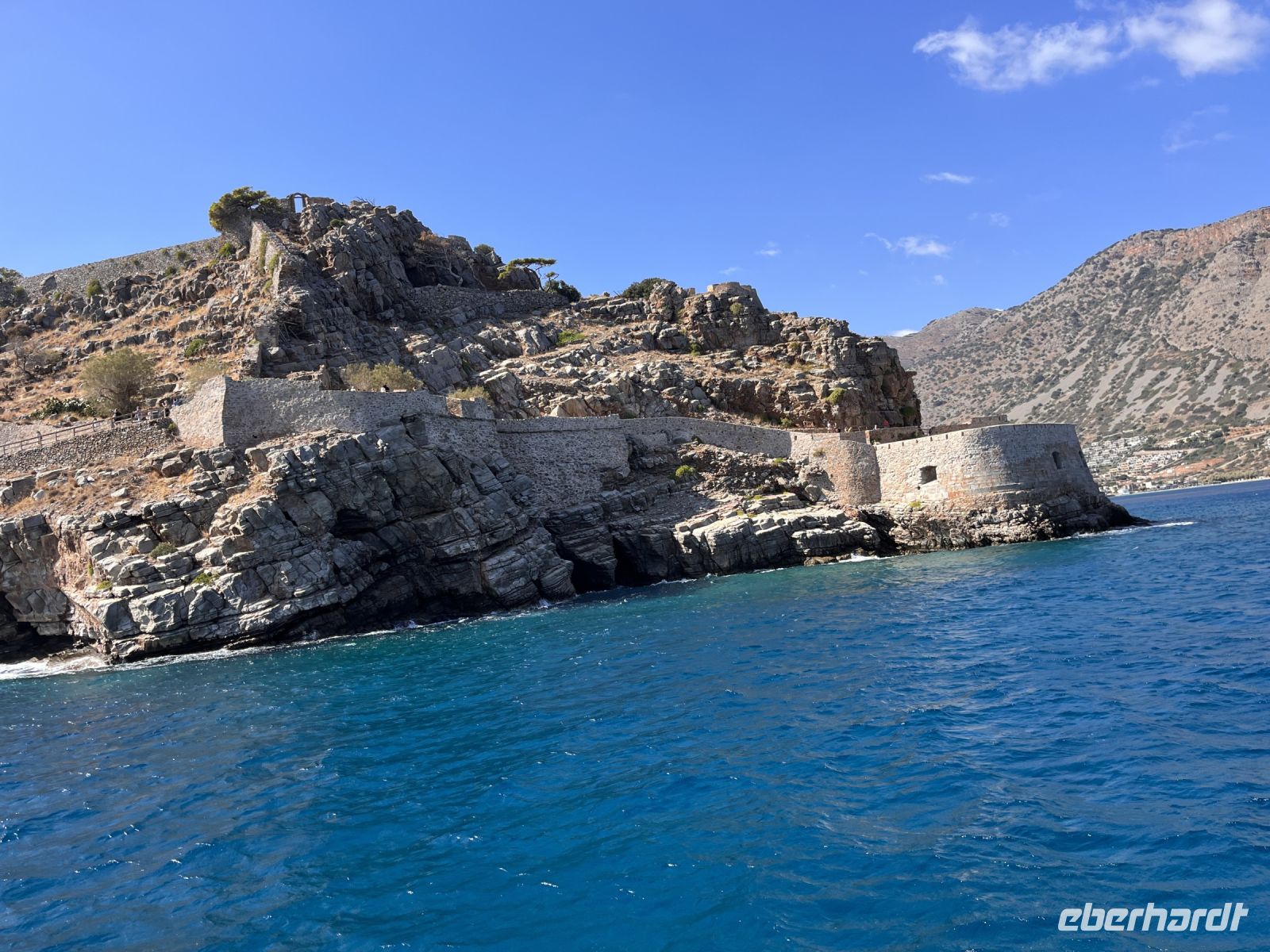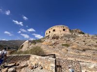 Heute fahren wir zur Insel Spinalonga. Sie liegt in einer strategischen Schlüsselposition am nördlichen Eingang des Golfs von Elounda nur 160 m von der Nordküste der gleichnamigen Halbinsel entfernt. Die kürzeste Entfernung zum kleinen Küstenort Plaka beträgt etwa 750 m. Die maximale Länge der Insel beträgt in Nord-Süd-Richtung 440 m, die größte Breite liegt bei 250 m im südlichen Inselteil. Die höchste Erhebung erreicht 53 m.