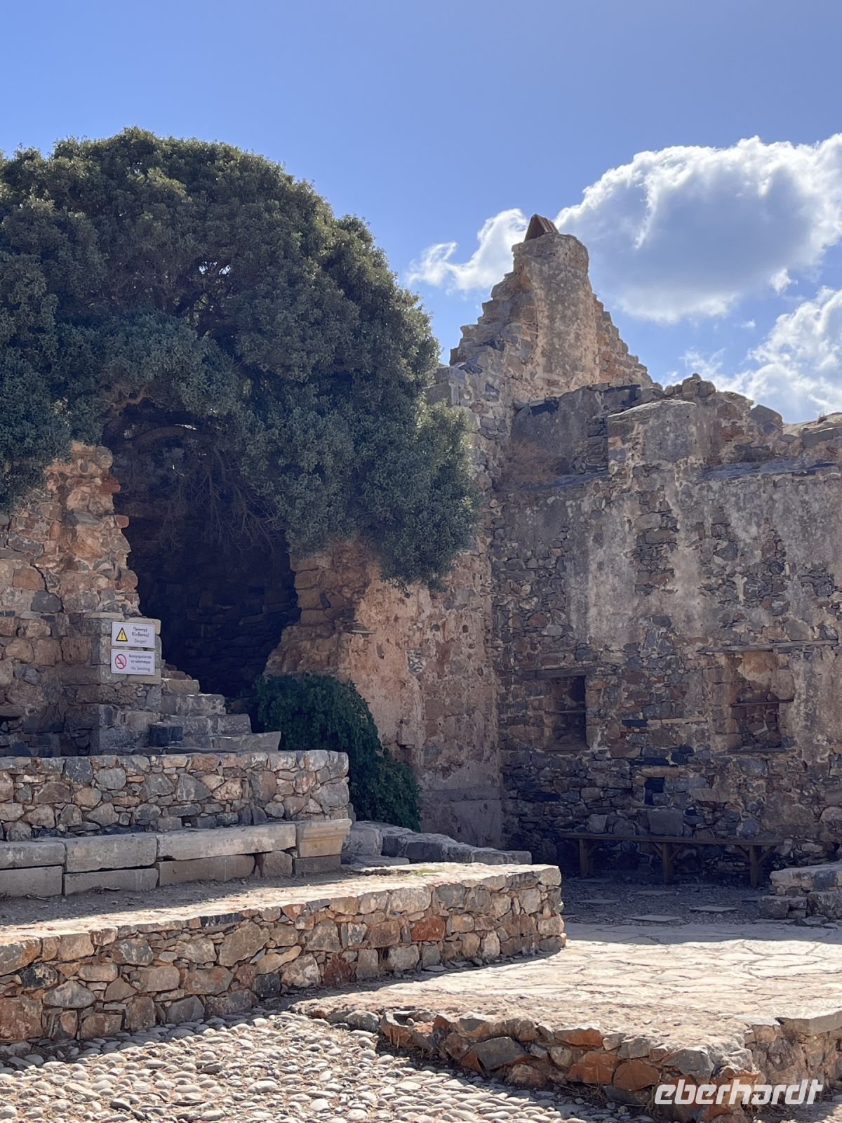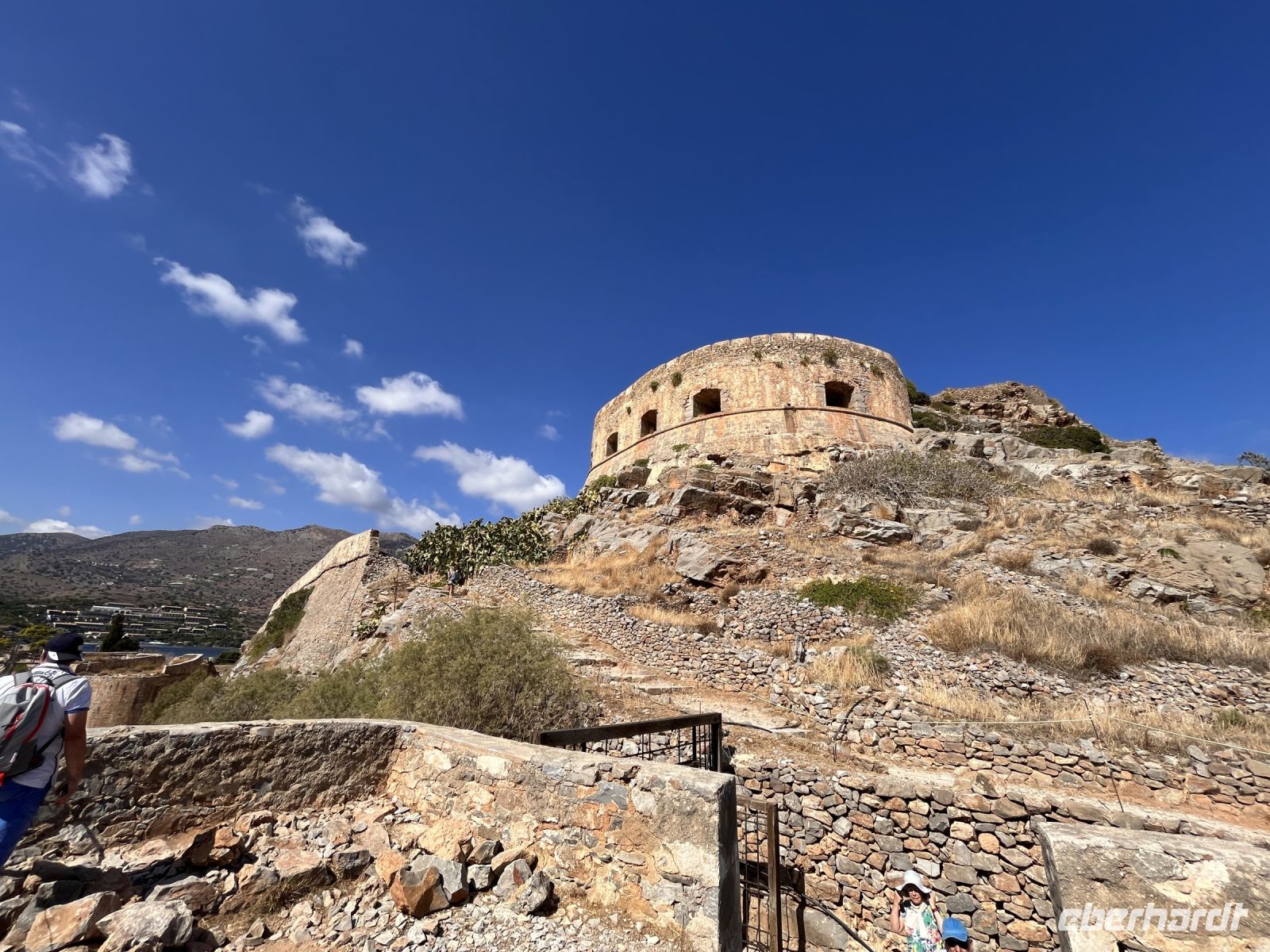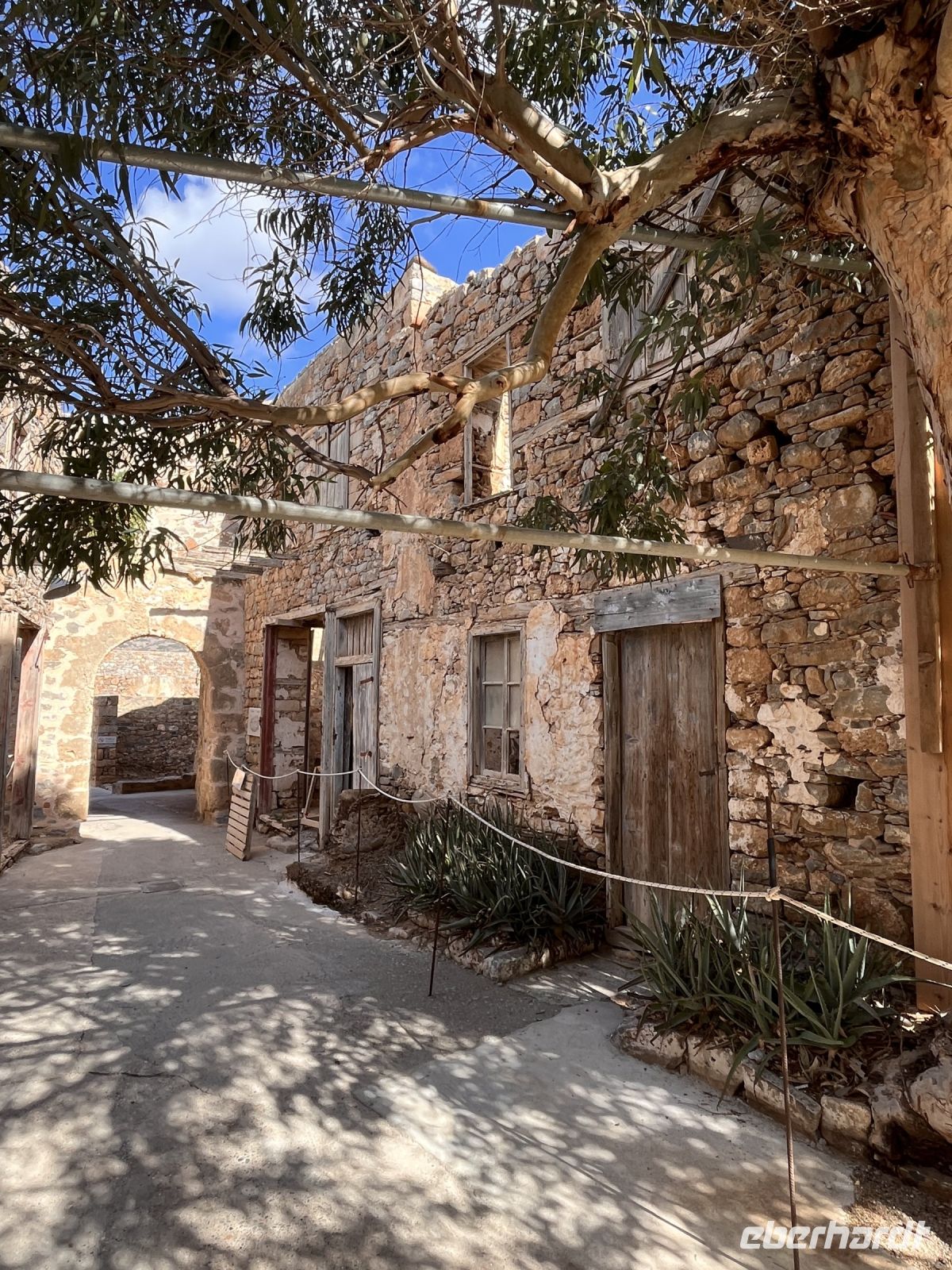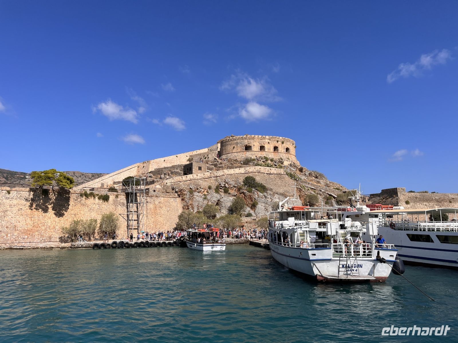 Die Insel erreichen wir mit dem Boot von Agios Nikolaos in einer knappen halben Stunde. Es gibt zwei Eingänge nach Spinalonga, das ursprüngliche Haupttor in der Mitte der Westküste der Insel gegenüber von Plaka und einen Tunnel an der Südspitze, der als Dantes Tor bezeichnet wird. An der Südspitze befinden sich touristische Einrichtungen und ein Landungssteg, der Booten als Anlegestelle dient.