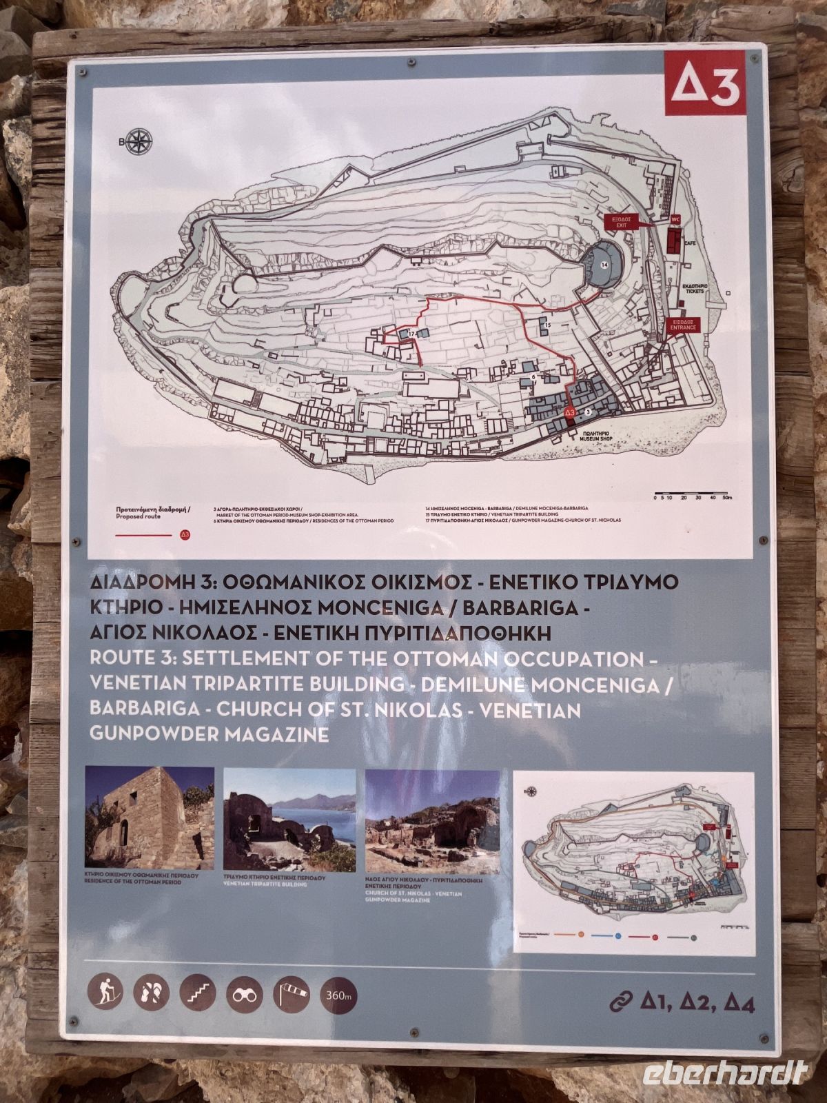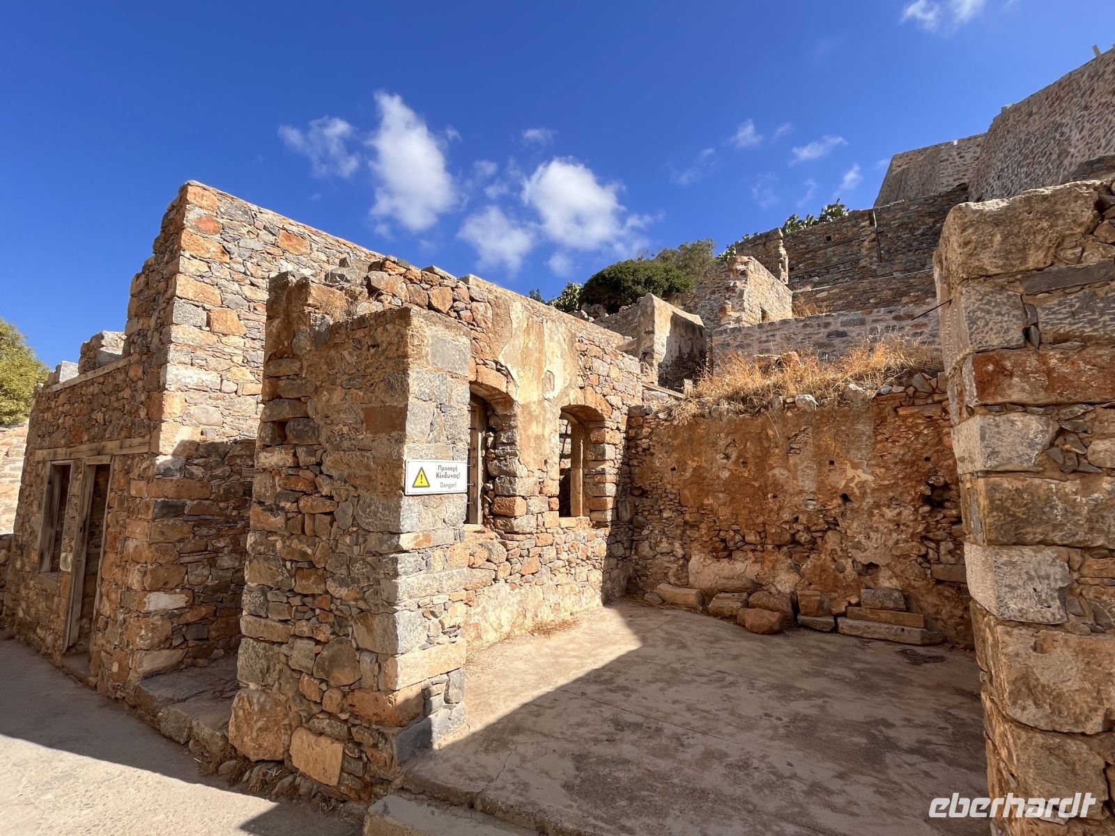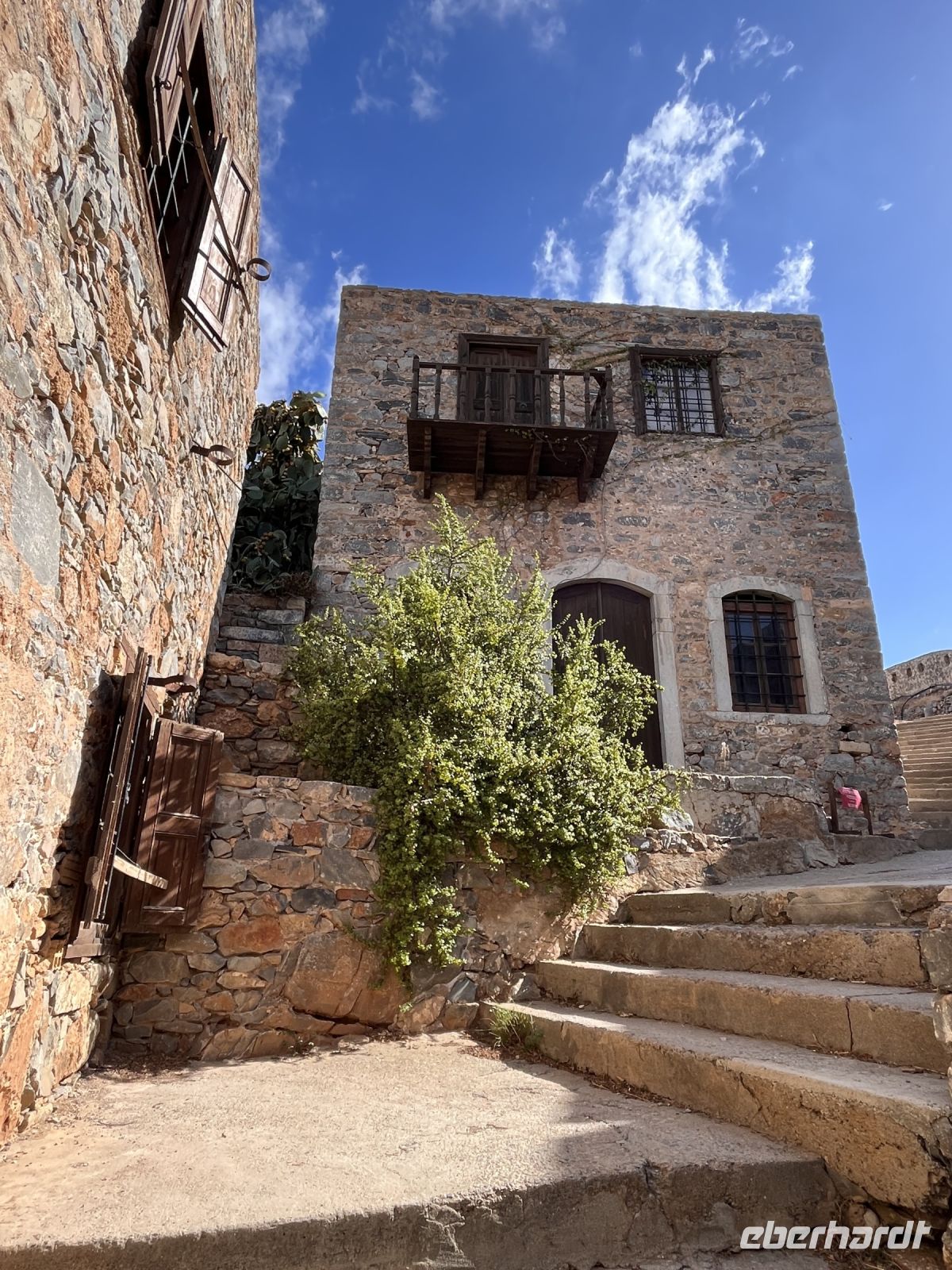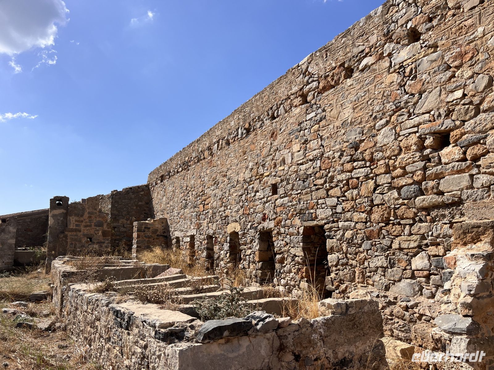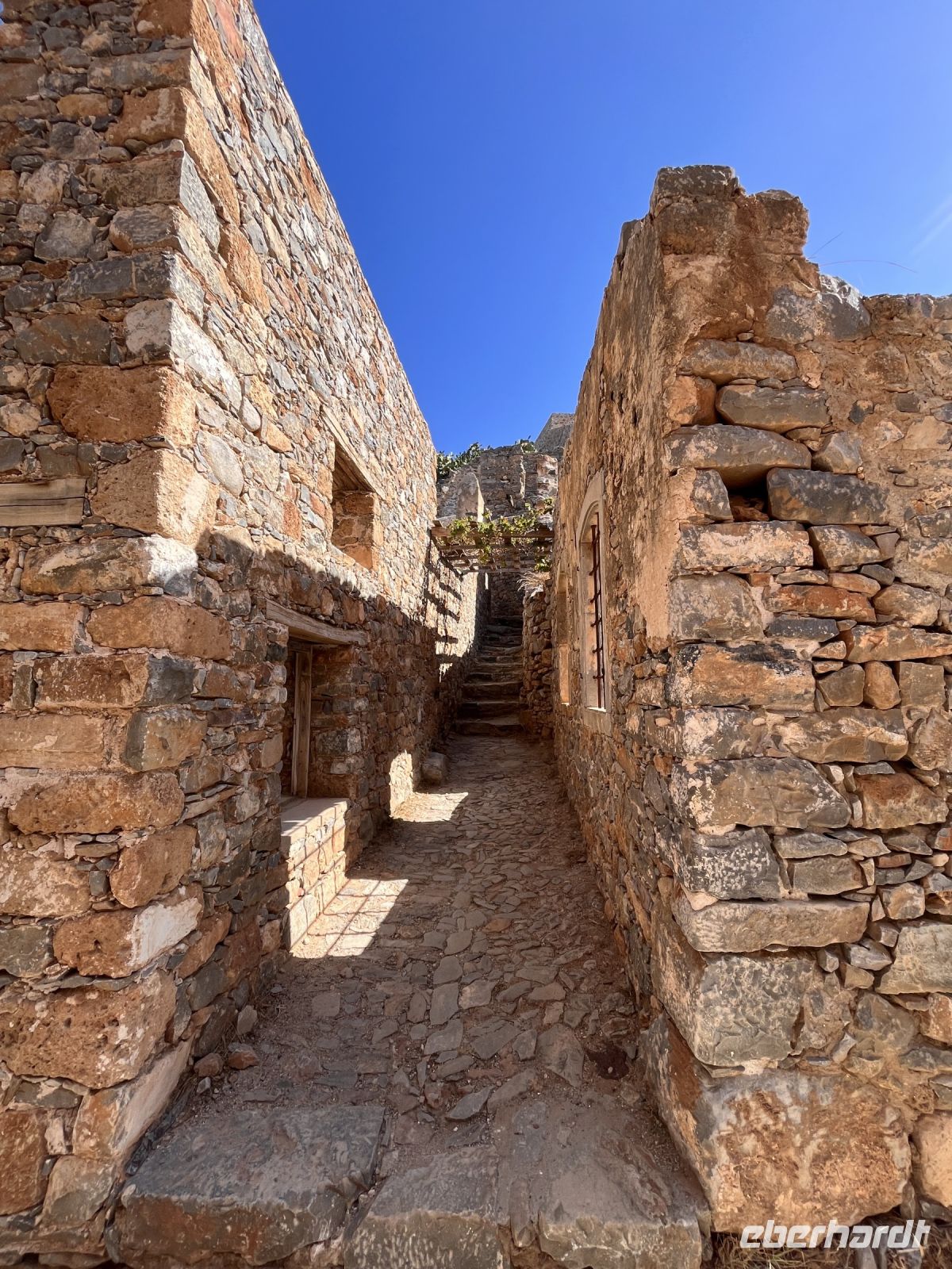 Die Insel erreichen wir mit dem Boot von Agios Nikolaos in einer knappen halben Stunde. Es gibt zwei Eingänge nach Spinalonga, das ursprüngliche Haupttor in der Mitte der Westküste der Insel gegenüber von Plaka und einen Tunnel an der Südspitze, der als Dantes Tor bezeichnet wird. An der Südspitze befinden sich touristische Einrichtungen und ein Landungssteg, der Booten als Anlegestelle dient.