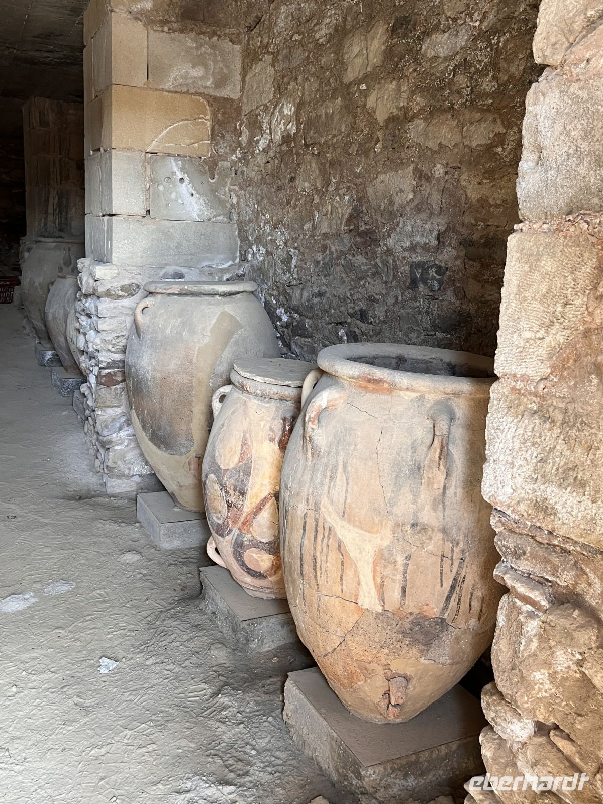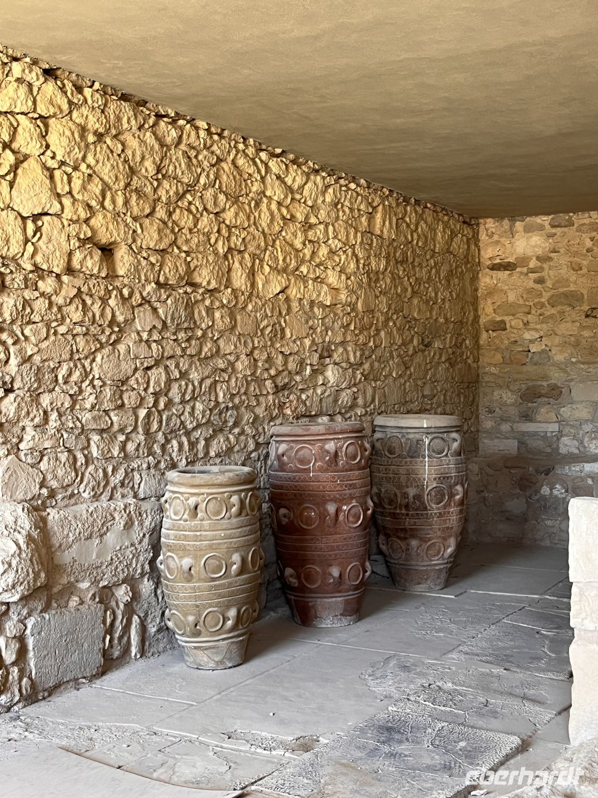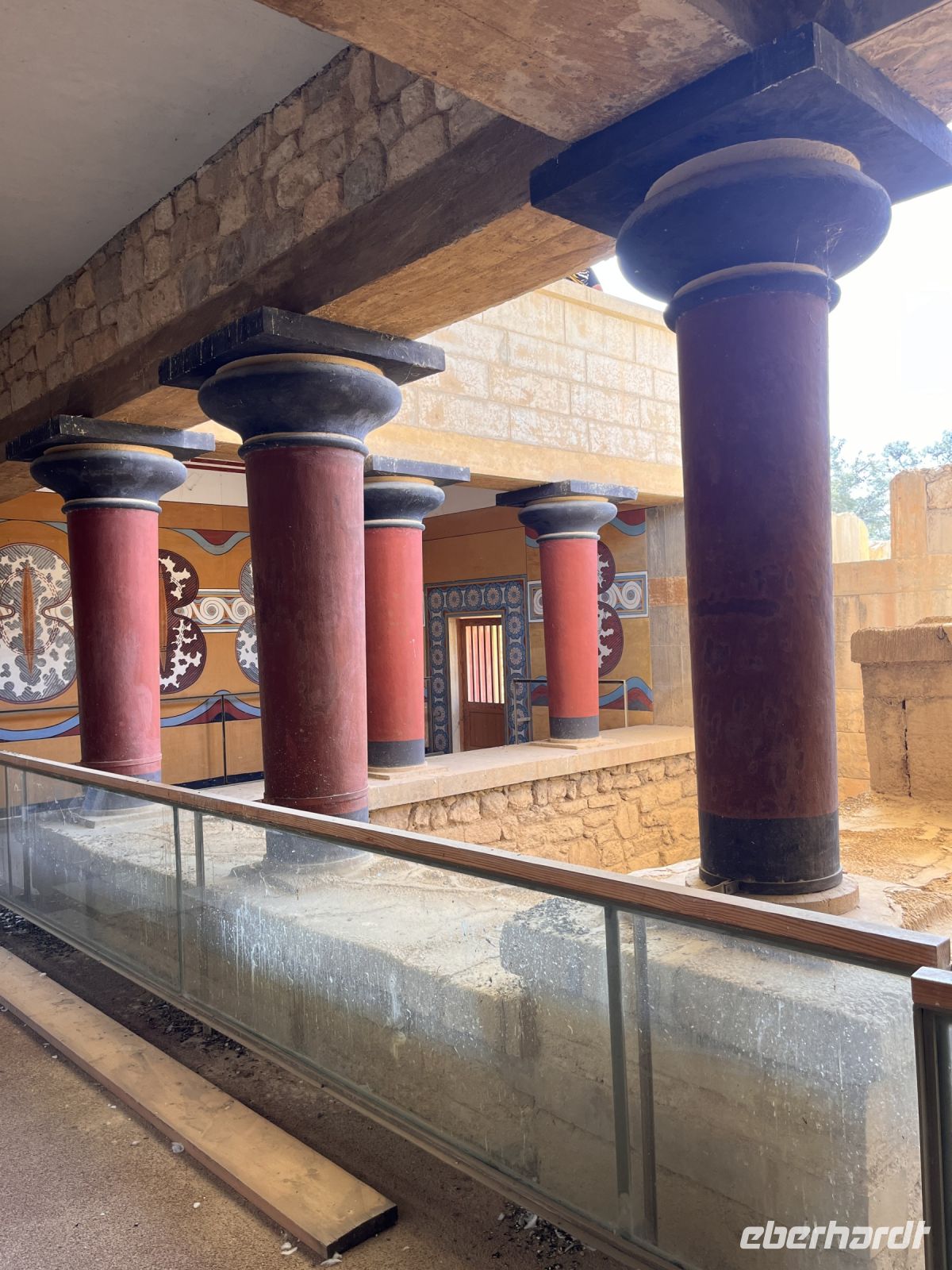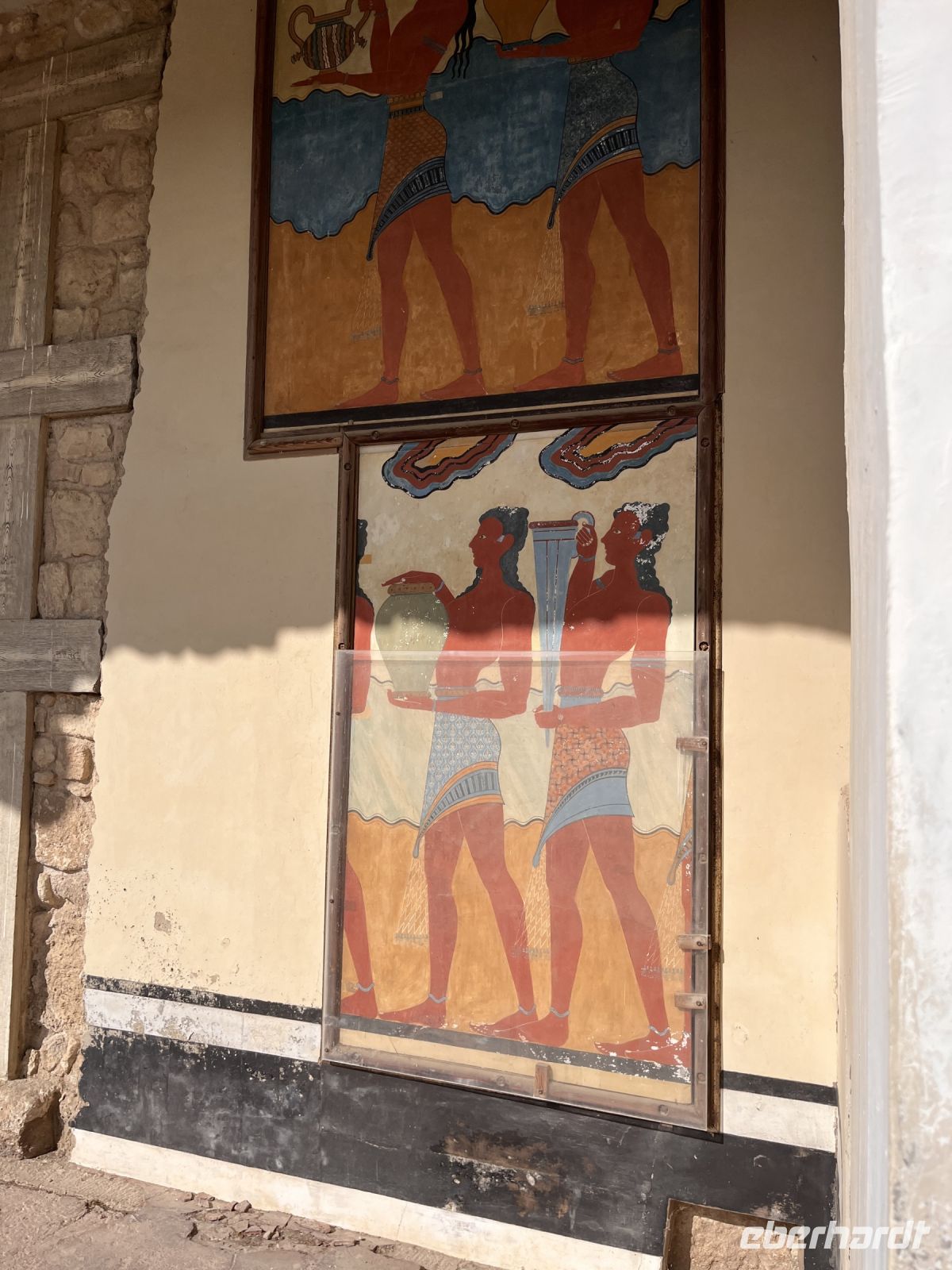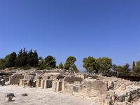 Nach einem sehr guten und ausgiebigen Frühstück fahren wir mit unserem lokalen Guide Georgios nach Knossos. Begeistert erzählt er uns viel Wissenswertes über diesen antiken Ort im mittleren Teil der Nordküste von Kreta, etwa fünf Kilometer südlich von Hiraklion entfernt. Bekannt ist er vor allem durch den Palast von Knossos, der neben den Palästen von Malia, Phaistos und Kato Zakros der größte minoische Palast auf Kreta ist und von Griechenland mit dem Europäischen Kulturerbe-Siegel ausgezeichnet wurde. Knossos blieb auch nach Zerstörung des Palastes bis in die byzantinische Zeit besiedelt. Älteste Spuren der bis zu acht Meter mächtigen Siedlungsschichten stammen aus dem 7. Jahrtausend v. Chr. (6900–6600 v. Chr.). Einwanderer, vielleicht aus Kleinasien, brachten erstmals Nutztiere und -pflanzen mit in die südliche Ägäis. Ihre Siedlung existierte wohl nur wenige Jahrhunderte (200–400 Jahre). Es schließt sich eine Fundlücke an, die bis etwa 5700–5500 v. Chr. reicht. Die nachfolgenden Neusiedler zeigen die typischen Kulturmerkmale des frühen Neolithikums. Am Ende des 3. Jahrtausends v. Chr. entwickelten sich kleinere Königreiche auf der Insel, wie man aus den größeren Palastanlagen in Phaistos, Malia, Knossos und Kato Zakros schließt. Der Palast von Knossos wurde zwischen 2100 und 1800 v. Chr. am Ort der neolithischen Besiedlung errichtet. Knossos war besonders groß, reich und prächtig. Wie fast alle Paläste Kretas wurde Knossos zwischen 1750 und 1700 v. Chr. durch ein schweres Erdbeben zerstört, jedoch bald wieder aufgebaut. Dieses Ereignis markiert in Knossos und dem übrigen Kreta das Ende der älteren und den Beginn der jüngeren Palastzeit. Auf den Fundamenten der alten Paläste wurden neue, noch aufwendigere errichtet. Knossos erfuhr seine größte Blüte und entwickelte sich zum führenden kretischen Stadtstaat, vermutlich das religiöse und politische Zentrum der Insel. Knossos verfügte damals wahrscheinlich über die größte und kampfstärkste Flotte, deren Schiffe zu den phönizischen, ägyptischen und peloponnesischen Häfen ausliefen und die Kykladen, Athen sowie den Nahen Osten ansteuerten. Knossos hatte zwei Seehäfen, einen bei Amnissos, den anderen in Iraklio. Um 1650 v. Chr. folgen kleinere Zerstörungen durch ein erneutes Erdbeben.
