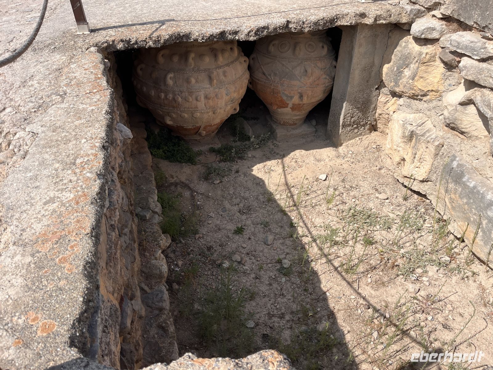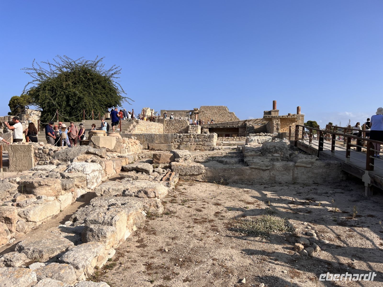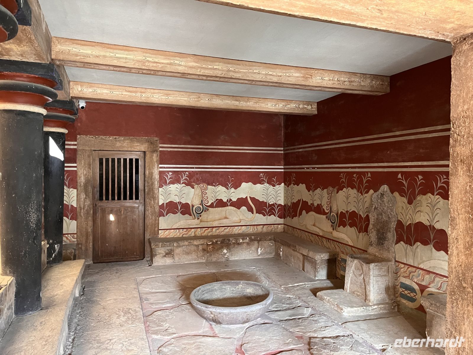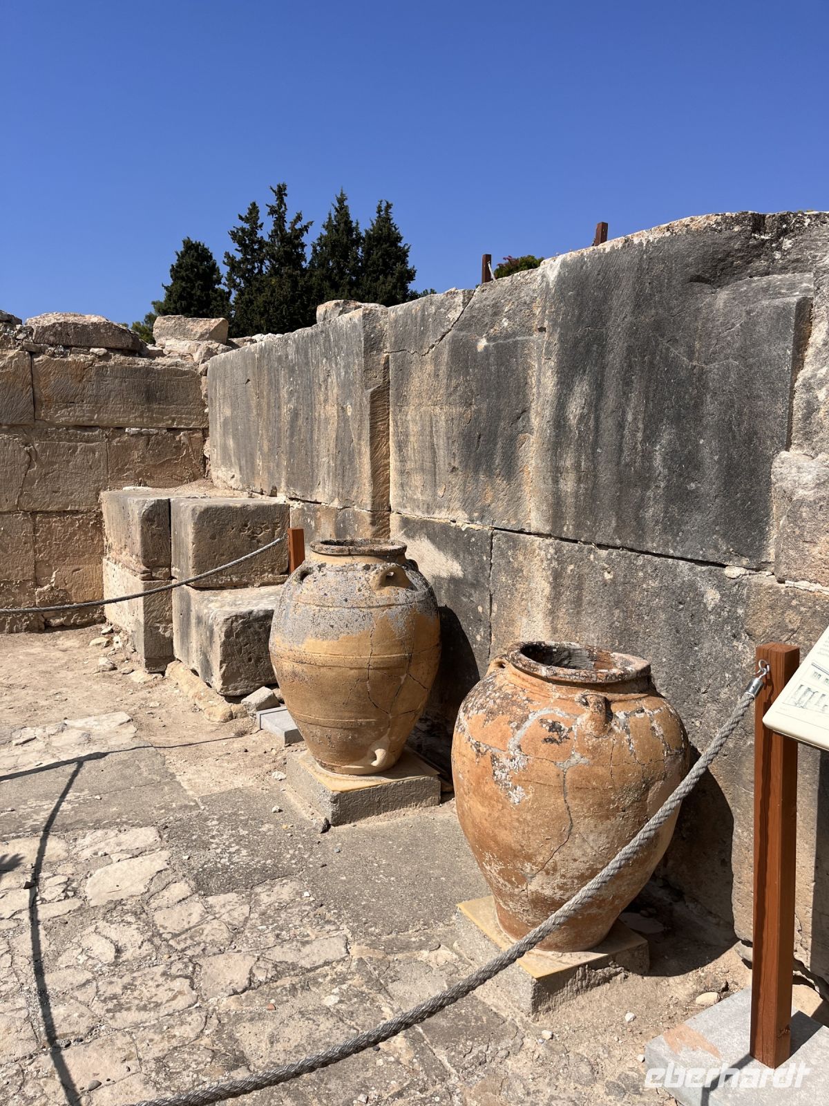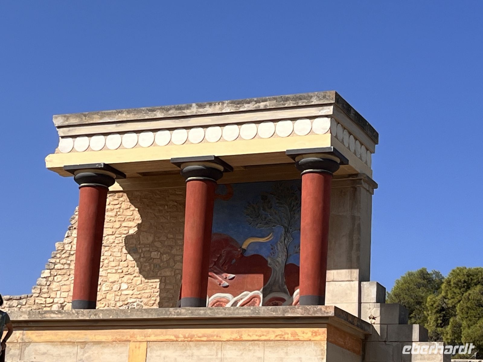Nach einem sehr guten und ausgiebigen Frühstück fahren wir mit unserem lokalen Guide Georgios nach Knossos. Begeistert erzählt er uns viel Wissenswertes über diesen antiken Ort im mittleren Teil der Nordküste von Kreta, etwa fünf Kilometer südlich von Hiraklion entfernt. Bekannt ist er vor allem durch den Palast von Knossos, der neben den Palästen von Malia, Phaistos und Kato Zakros der größte minoische Palast auf Kreta ist und von Griechenland mit dem Europäischen Kulturerbe-Siegel ausgezeichnet wurde. Knossos blieb auch nach Zerstörung des Palastes bis in die byzantinische Zeit besiedelt. Älteste Spuren der bis zu acht Meter mächtigen Siedlungsschichten stammen aus dem 7. Jahrtausend v. Chr. (6900–6600 v. Chr.). Einwanderer, vielleicht aus Kleinasien, brachten erstmals Nutztiere und -pflanzen mit in die südliche Ägäis. Ihre Siedlung existierte wohl nur wenige Jahrhunderte (200–400 Jahre). Es schließt sich eine Fundlücke an, die bis etwa 5700–5500 v. Chr. reicht. Die nachfolgenden Neusiedler zeigen die typischen Kulturmerkmale des frühen Neolithikums. Am Ende des 3. Jahrtausends v. Chr. entwickelten sich kleinere Königreiche auf der Insel, wie man aus den größeren Palastanlagen in Phaistos, Malia, Knossos und Kato Zakros schließt. Der Palast von Knossos wurde zwischen 2100 und 1800 v. Chr. am Ort der neolithischen Besiedlung errichtet. Knossos war besonders groß, reich und prächtig. Wie fast alle Paläste Kretas wurde Knossos zwischen 1750 und 1700 v. Chr. durch ein schweres Erdbeben zerstört, jedoch bald wieder aufgebaut. Dieses Ereignis markiert in Knossos und dem übrigen Kreta das Ende der älteren und den Beginn der jüngeren Palastzeit. Auf den Fundamenten der alten Paläste wurden neue, noch aufwendigere errichtet. Knossos erfuhr seine größte Blüte und entwickelte sich zum führenden kretischen Stadtstaat, vermutlich das religiöse und politische Zentrum der Insel. Knossos verfügte damals wahrscheinlich über die größte und kampfstärkste Flotte, deren Schiffe zu den phönizischen, ägyptischen und peloponnesischen Häfen ausliefen und die Kykladen, Athen sowie den Nahen Osten ansteuerten. Knossos hatte zwei Seehäfen, einen bei Amnissos, den anderen in Iraklio. Um 1650 v. Chr. folgen kleinere Zerstörungen durch ein erneutes Erdbeben.