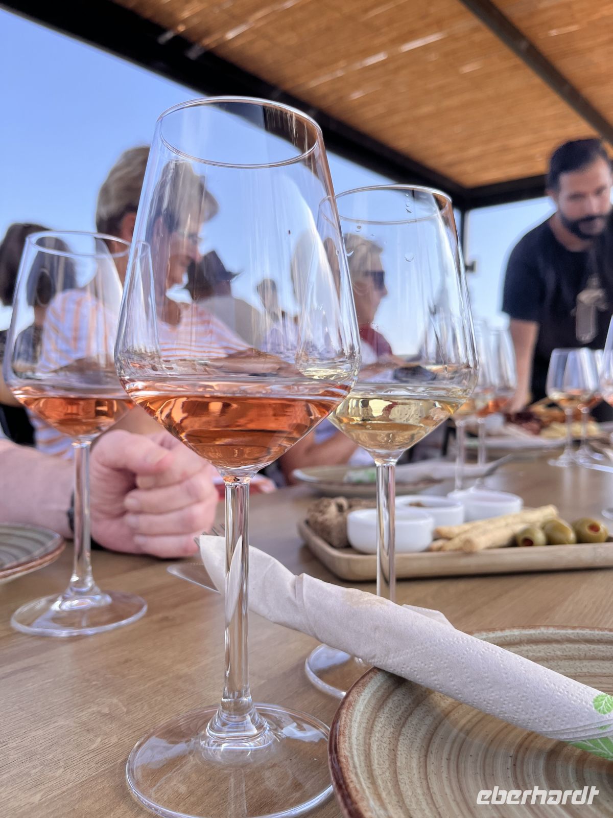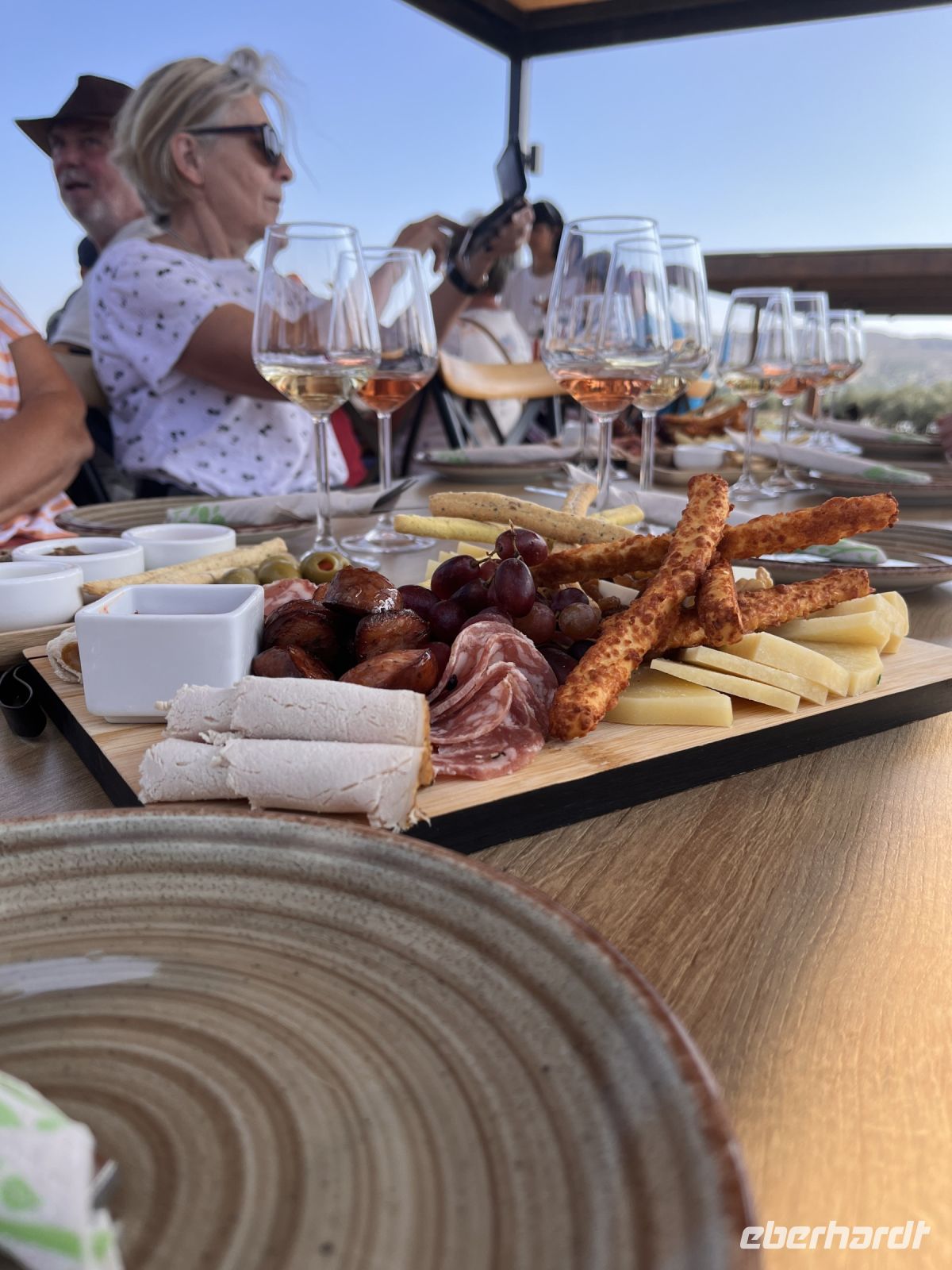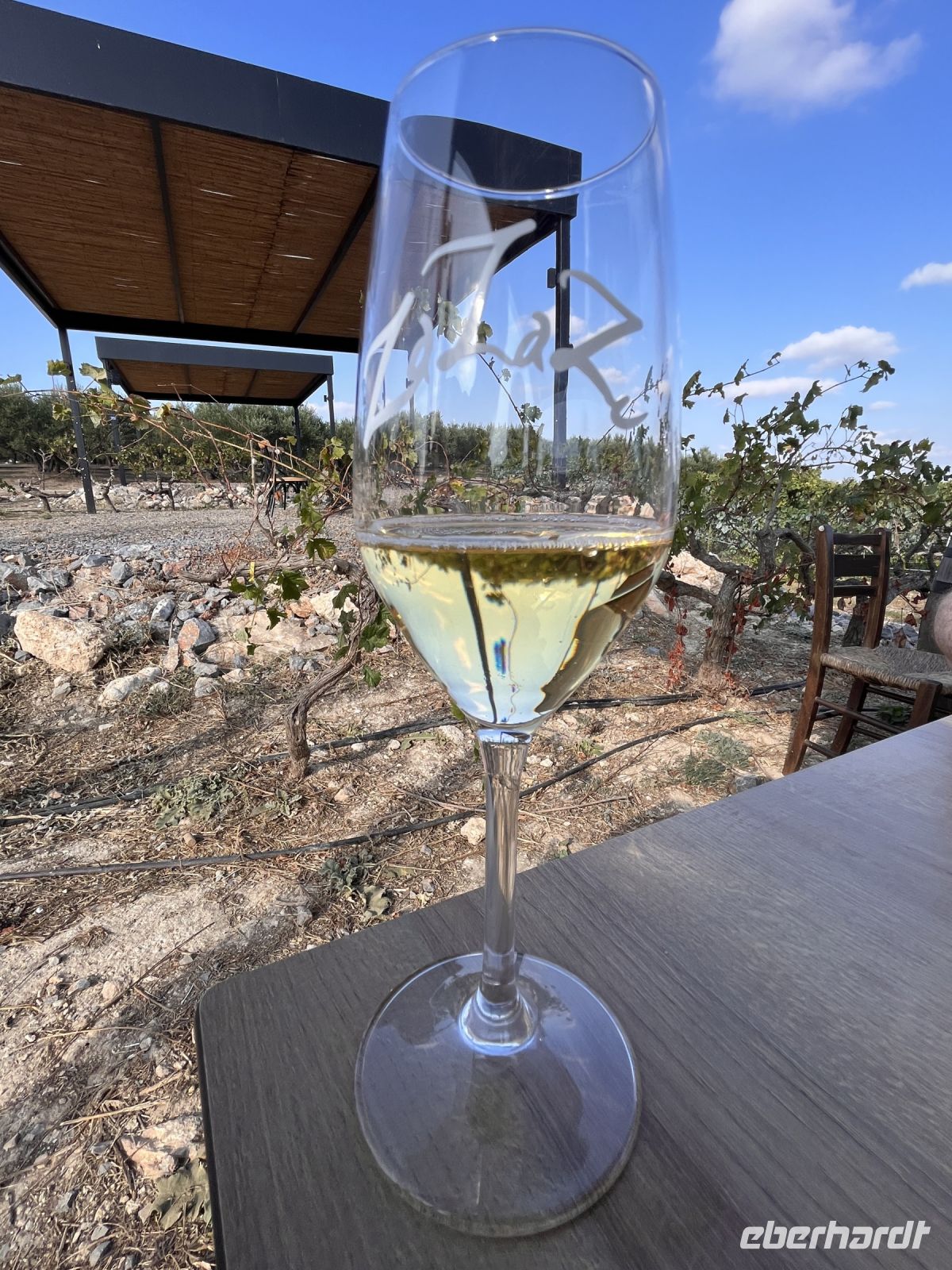 Etwas fussmüde und beeindruckt von den vielen monumentalen Bauwerken fuhren wir weiter zum Weingut Lyrarakis. In Alagni inmitten der Idylle des Lassithi-Gebirges liegt das 1966 gegründete Familienweingut Lyrarakis. Spezialisiert auf seltene ur-kretische Rebsorten, von denen einige sogar vom Aussterben bedroht waren, hat sich das Gut alten kretischen Weinsorten wie Plyto verschrieben. Irini, eine Mitarbeiterin des Weingutes erklärte uns bei einem Spaziergang durch das Gut viel Details über die Herstellung der regionalen Weinsorten. Bei einer Verkostung konnten wir mehrere der leckeren Weine probieren und weitere Spezialitäten der Region wie Käse, Wurst Schinken und verschiedene Brotsorten verspeisen.