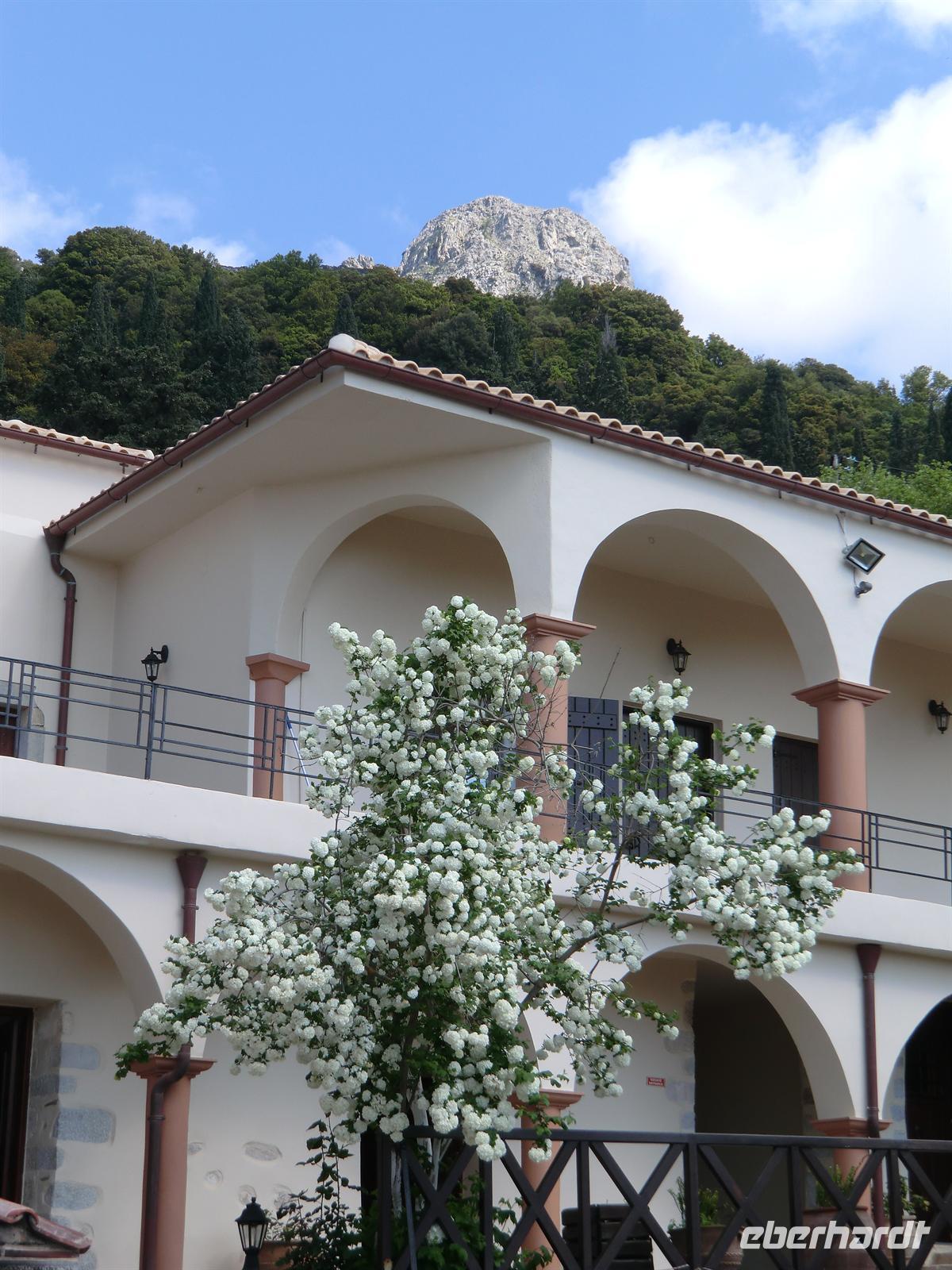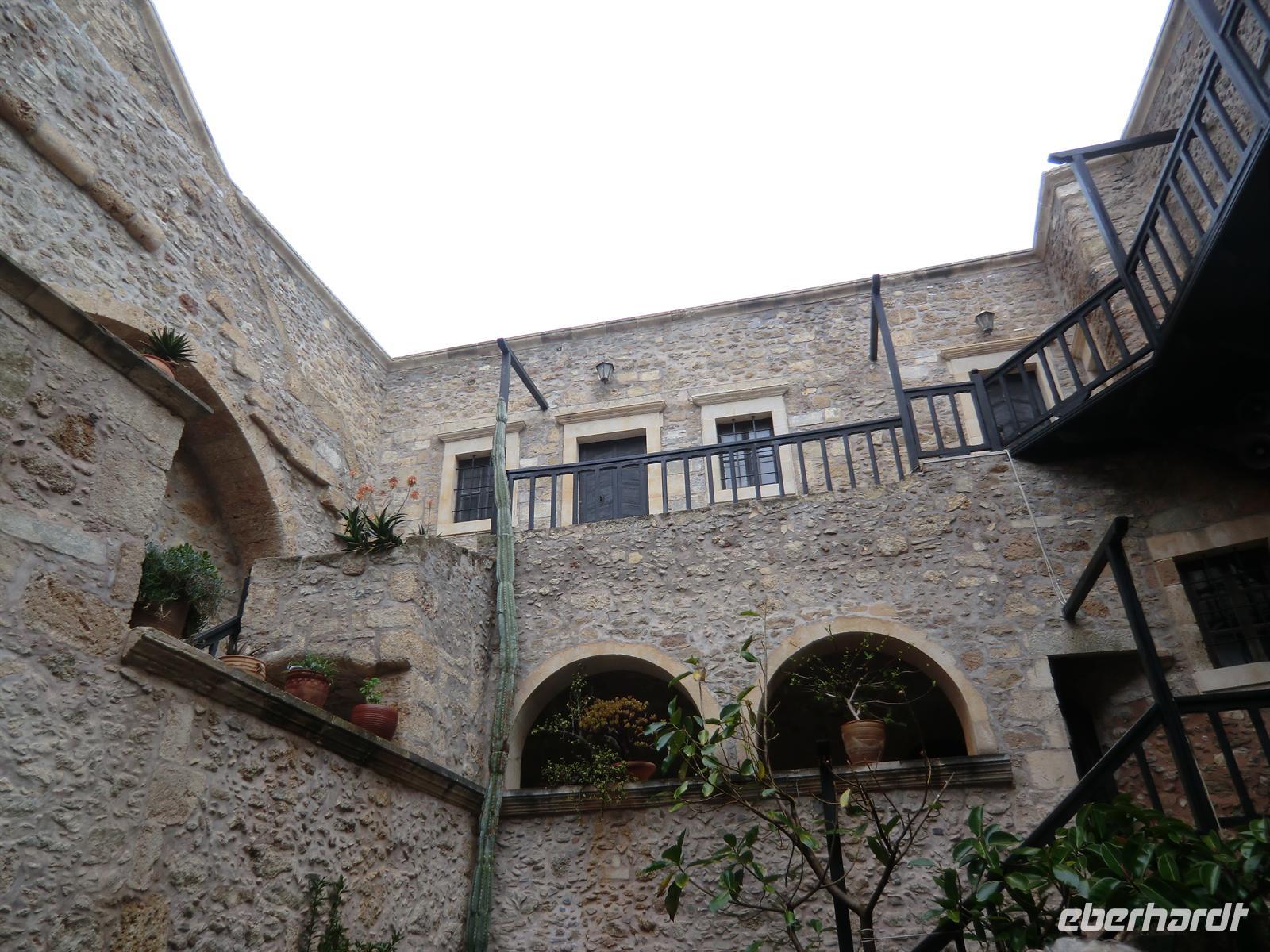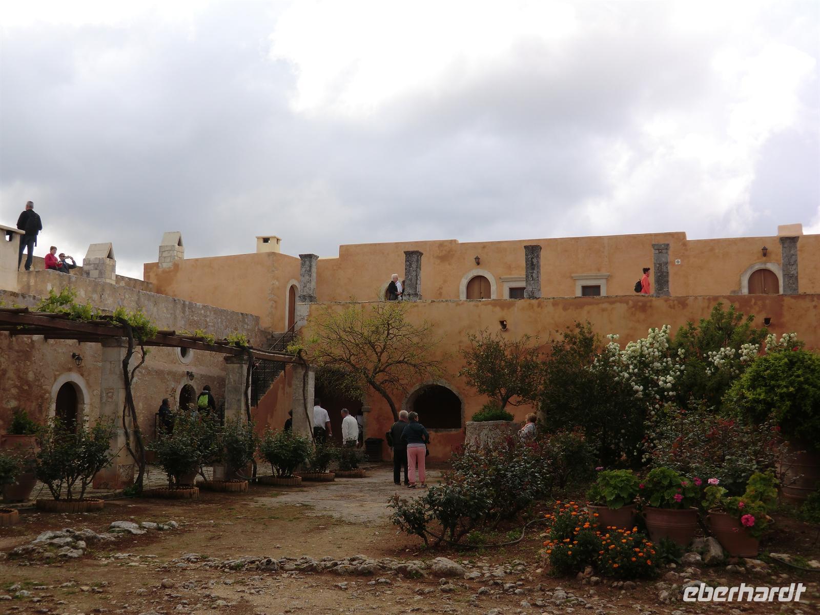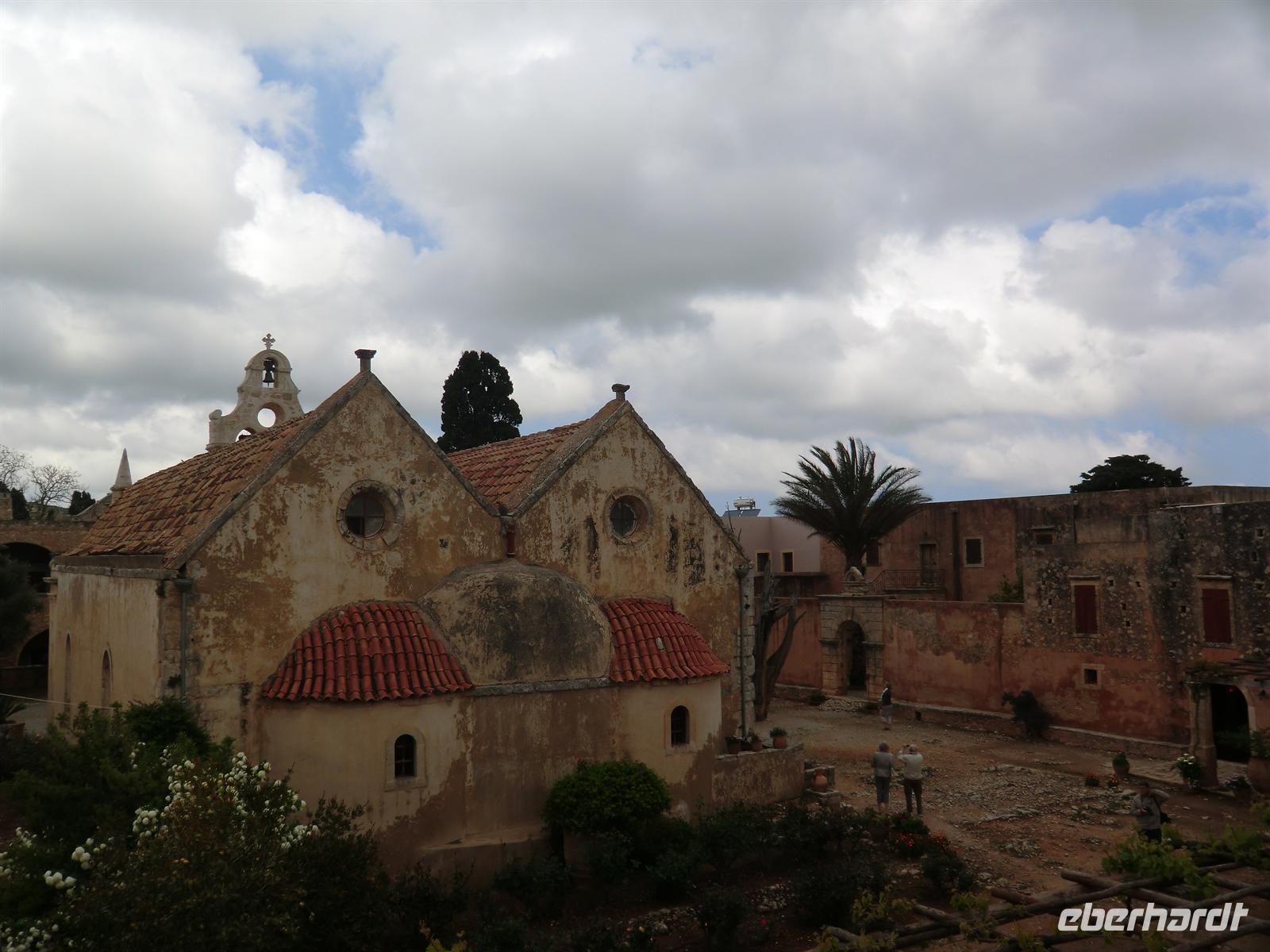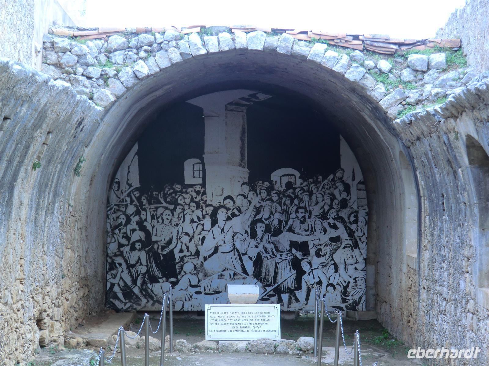 10 Uhr erreichten wir den ersten Höhepunkt des heutigen Besichtigungstages: das Kloster von Arkadi. 1866 versuchten hier griechische Freiheitskämpfer, Widerstand gegen die Fremdherrschaft der Türken zu leisten. In einer grausamen Schlacht wurden die im Kloster verschanzten Männer, Frauen und Kinder blutig niedergeschlagen.