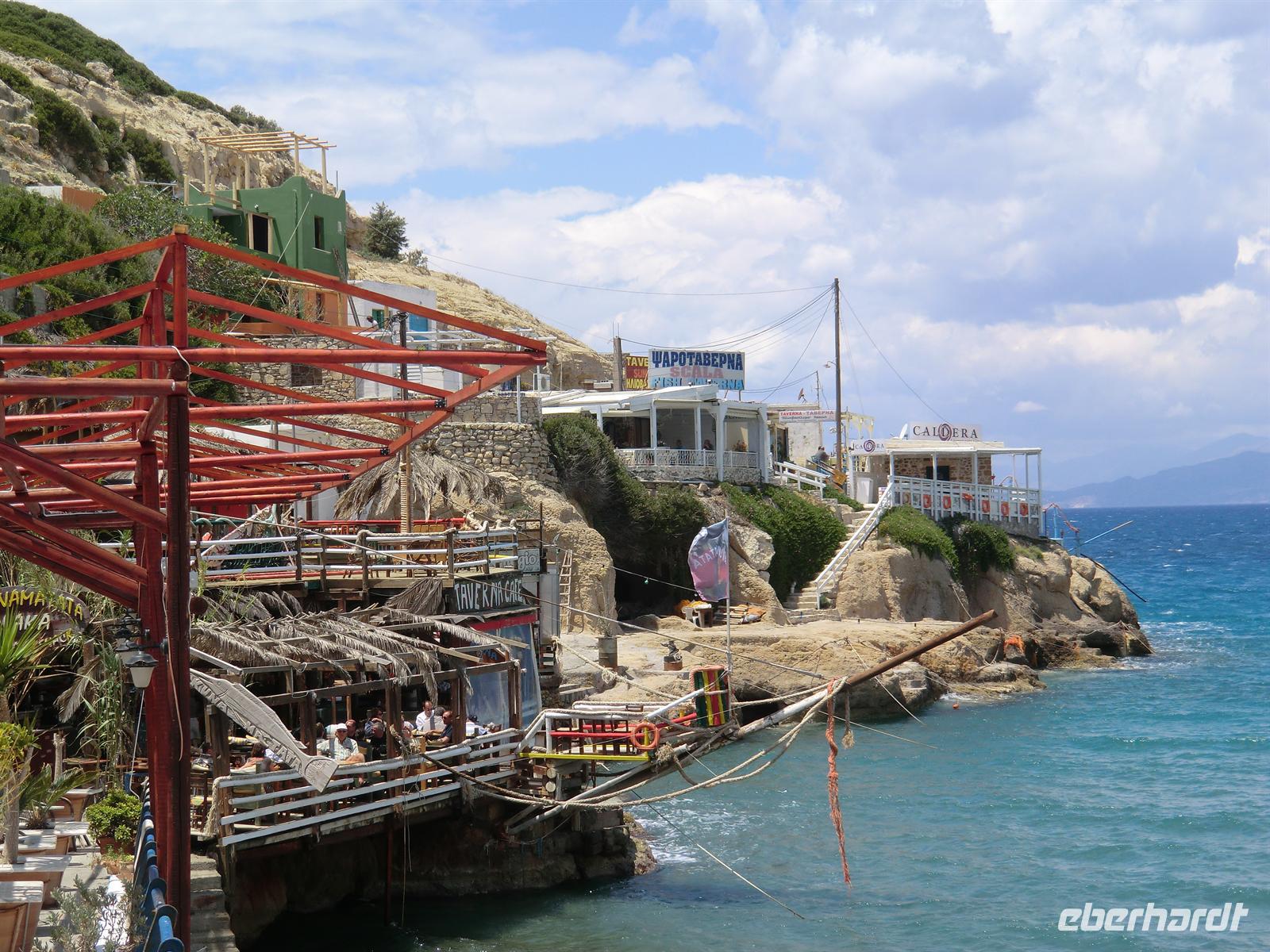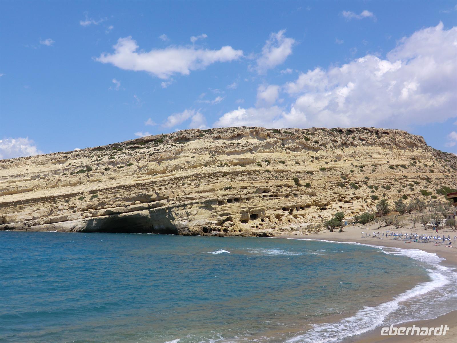 Nachdem wir die beeindruckende Anlage von Festos mit ihrem herrlichen Panoramablick und den rekonstruierten Vasen besichtigt hatten fuhren wir weiter an die Küste und erreichten Matala 13:25 Uhr. Nach einem kurzen Fußmarsch durch das Örtchen kehrten wir in einer gemütlichen Taverne ein, die einen herrlichen Blick auf die Höhlen und den Strand am lybischen Meer bot. Wir genossen griechische Köstlichkeiten, wie Tsatsiki, Salat mit Feta und Kalamari. Frisch gestärkt wagten einige den Sprung ins kühle Nass. Andere gingen durch die einladenden Boutiquen bummeln oder die beeindruckenden Höhlen besichtigen.