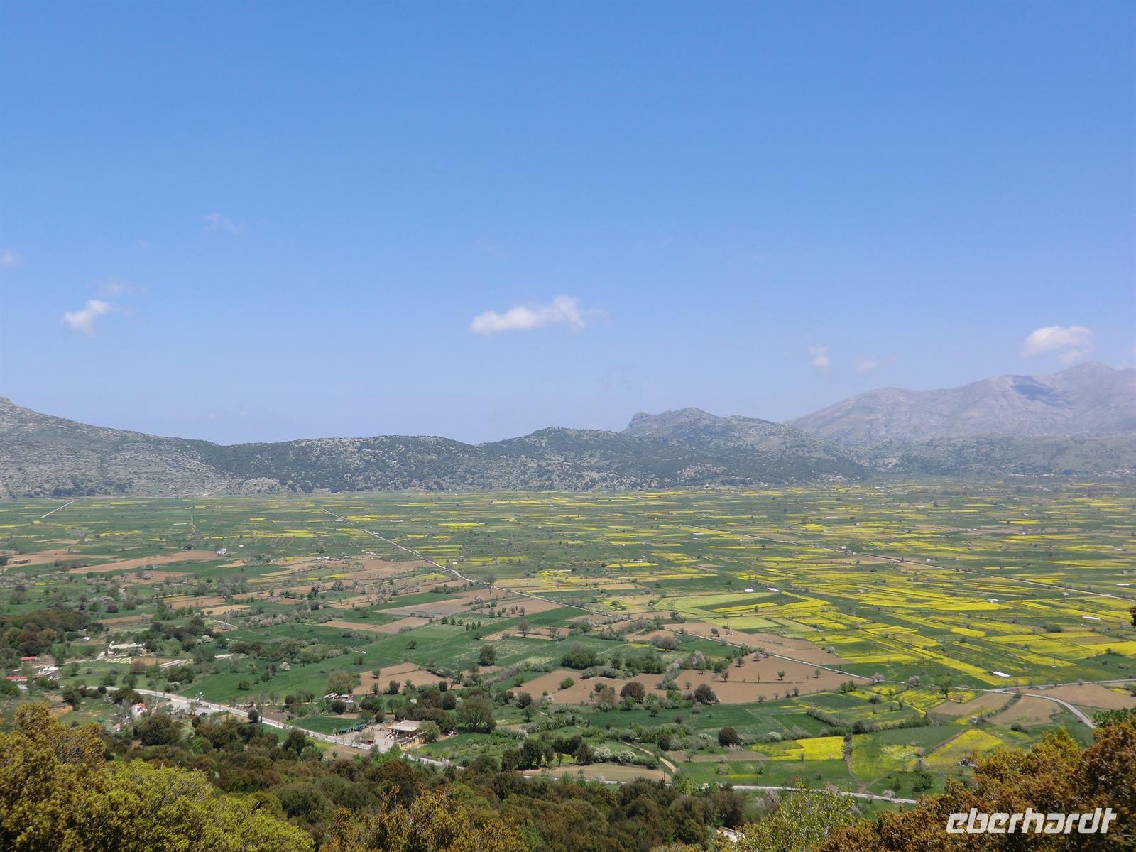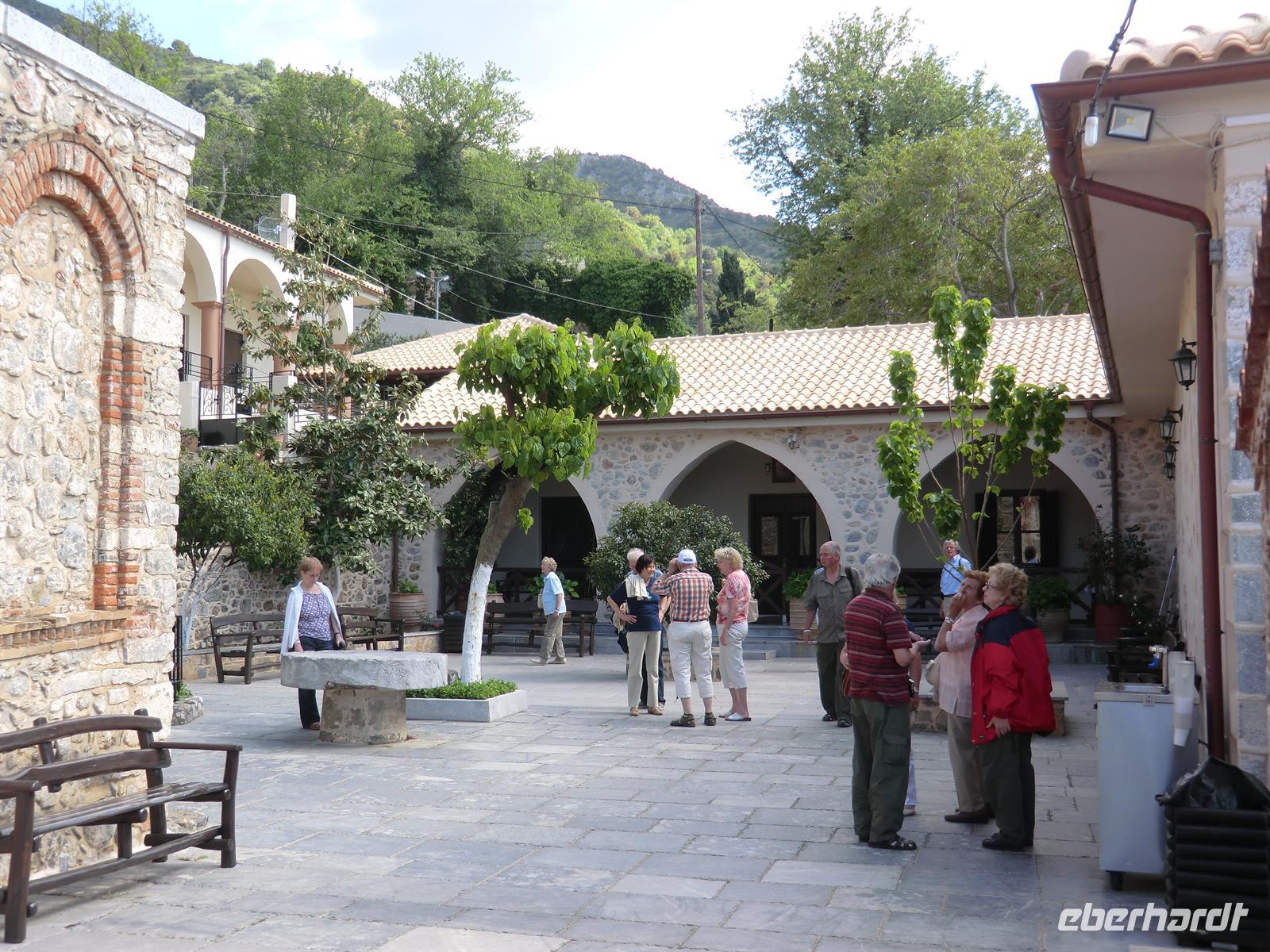 Weiter ging es in die Höhe und somit in die landschaftlich wunderschöne Lassithi-Ebene. Umgeben von Bergketten erblickten wir das weite 860 Meter hohe Plateau in einem herrlichen Gelb, dass durch den blühenden Raps erstrahlte. 12:15 Uhr erreichten wir den Ort Psychro, der durch die Diktäische Höhle einen besonderen Ruf genießt. Die griechische Mythologie besagt, dass der mächtige Gott Zeus in dieser Tropfsteinhöhle geboren worden ist. Über einen steilen Steinpfad erreicht man den Abstieg in die kühle Höhle. Während des etwa 30minütigen Aufstieges bot sich uns eine herrliche Aussicht über die weite Ebene. Nachdem wir auch die feuchten Stufen der Höhle zunächst hinab und anschließend wieder hinauf gestiegen waren, hielten wir den Moment, an dem die „Höhlenforscher“ erneut das Tageslicht erblickten, umgeben von dem wunderbaren Bergpanorama in einem Foto fest. Erneut im Ort angekommen, stärkten wir uns mit einem frisch gepressten Orangensaft, ehe wir über die idyllische Serpentinenstraße weiter bis zum Restaurant „Kourites“ fuhren, wo wir frisch zubereitete kretische Kost genießen konnten. Nach einem kleinen Spaziergang zum Friedhof des Ortes fuhren wir weiter durch enge Gassen und scharfe Kurven bis zum Kloster von Lassithi. Umgeben von hohen Bergen ist diese Anlage ein wahres Paradies der Ruhe und Beschaulichkeit, das zum Verweilen und Philosophieren einlädt. 16:20 Uhr fuhren wir nach der interessanten Besichtigung zurück zu unserem Hotel, vor dessen Hauptportal wir 16:45 Uhr ankamen.