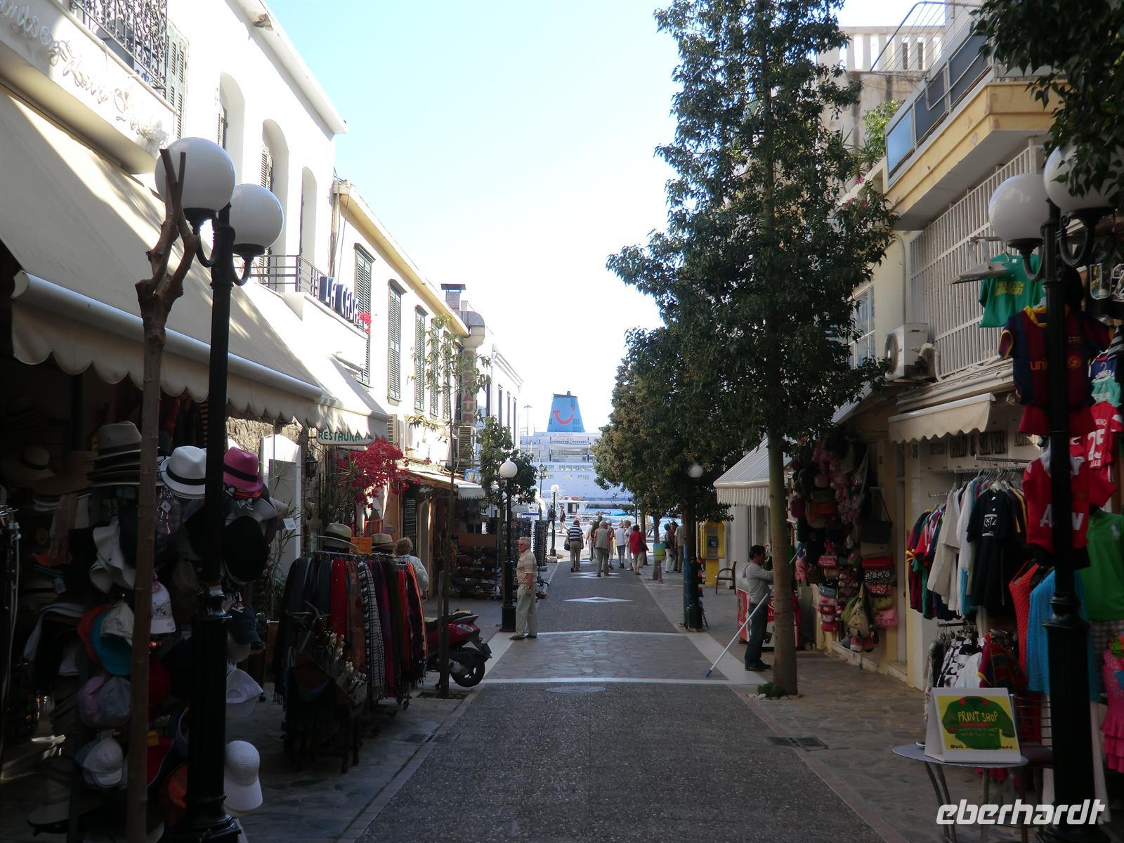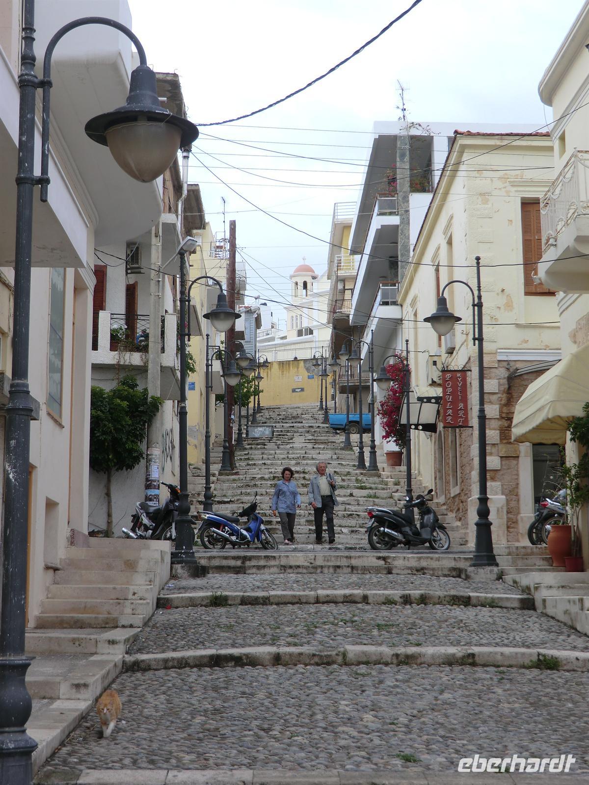 Aus dem Bus ausgestiegen passierten wir den Platz der Freiheit, um über die Hauptgeschäftsstraße mit ihren vielen kleinen Boutiquen zum Löwenbrunnen zu gelangen. Dort verabschiedeten wir uns für eine Freizeit von 2 Stunden, die für einen Besuch der Basilika, der Festung und/oder zum Einkaufen genutzt werden konnte. Einige ließen sich in einer schattigen Bar griechischen warmen Käse mit Zucker und Zimt schmecken.