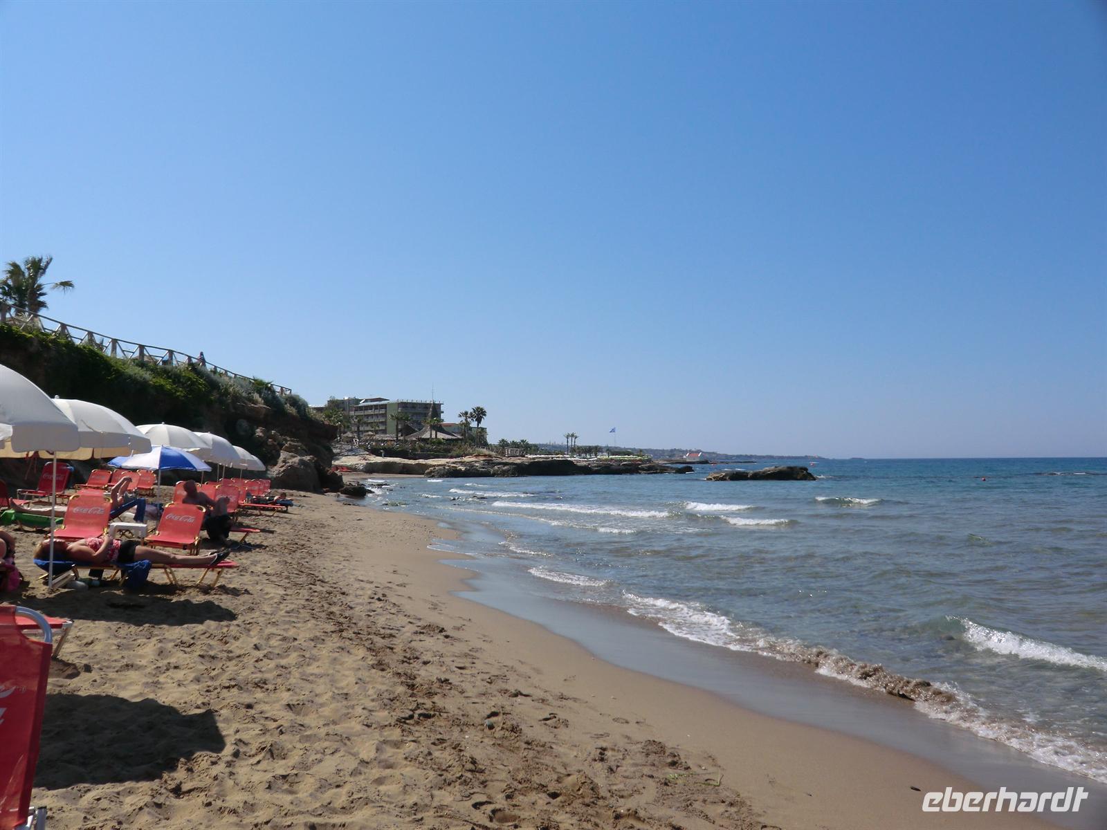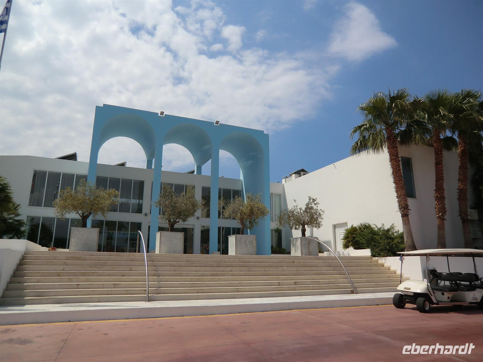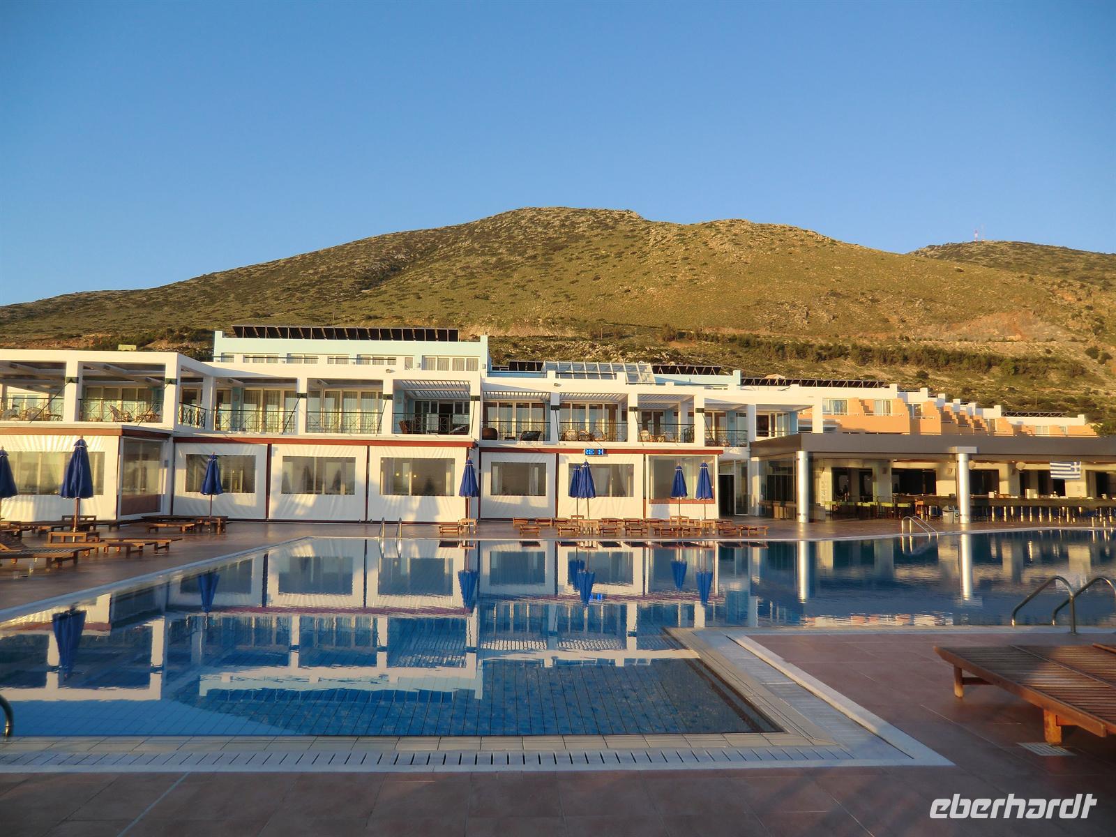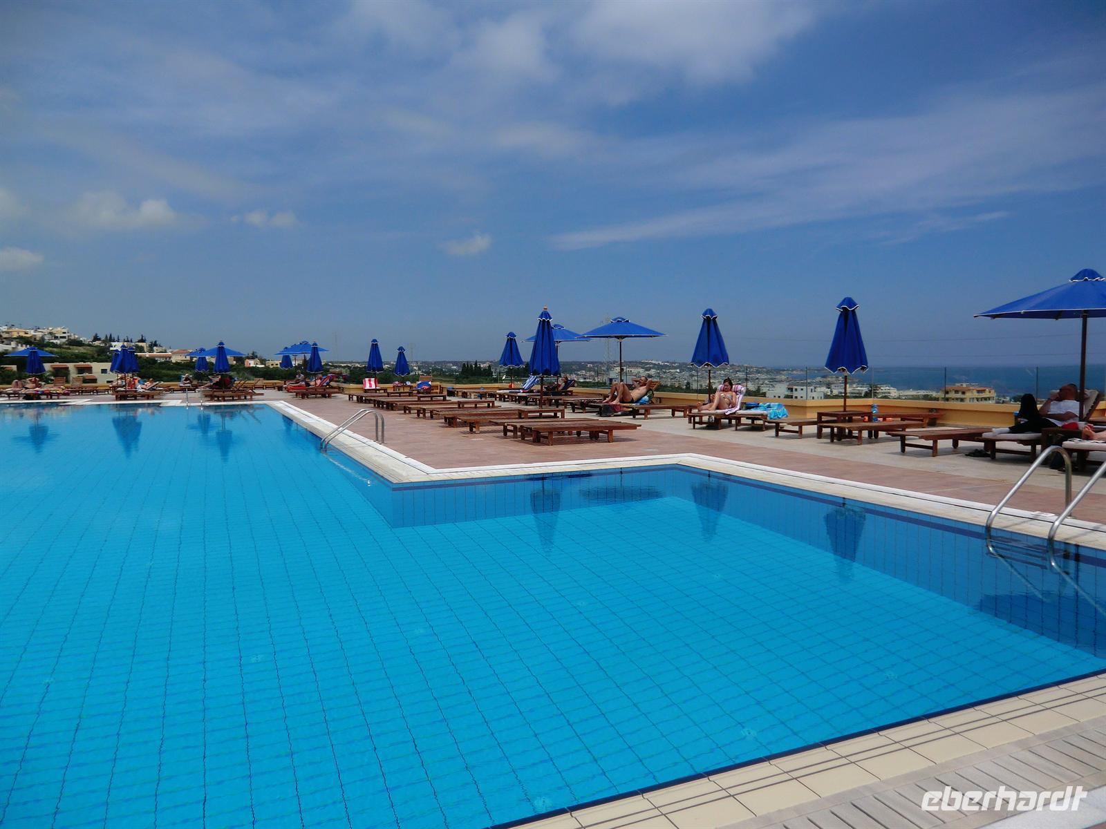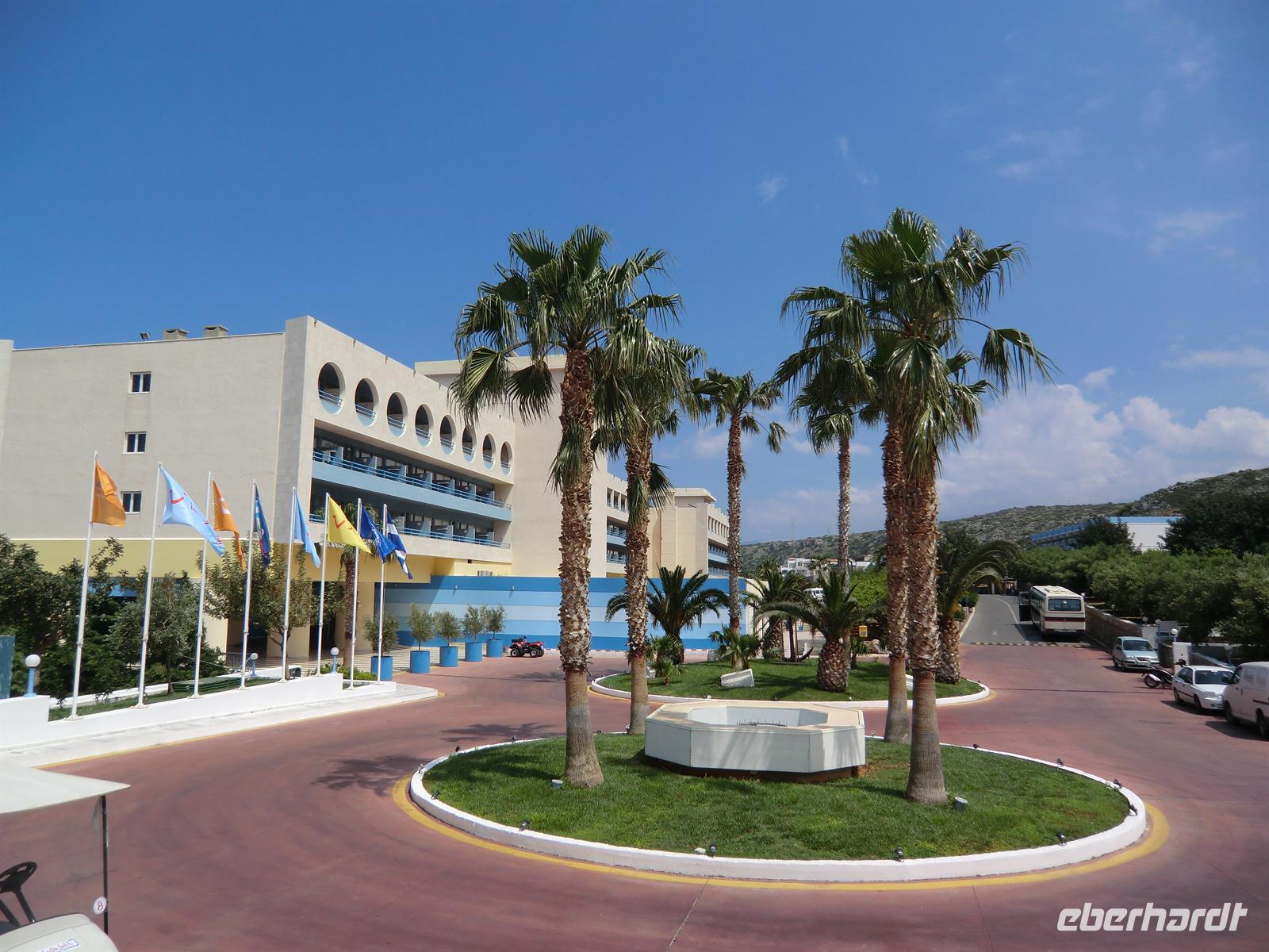Nach nur 30 Minuten Fahrt erreichten wir unser 4-Sterne Hotel „Imperial Belvedere“ am Eingang des Ortes Hersonissos. Durch ein Empfangsportal hindurch führt die Straße hinauf zur Rezeption, wo wir bereits mit einem kühlen Willkommenstrunk erwartet wurden. Nun konnte der lustige Gang zu den Zimmern beginnen. Das Gangsystem des in Terrassenform angelegten Hotels hält in jedem Fall den Orientierungssinn frisch. Nach einem kleinen Spaziergang haben wir diesen Test jedoch gut gemeistert und konnten den ersten Tag auf der Insel entspannt und neugierig genießen: sei es am Pool, am Strand oder bei einem Besuch des Ortes.