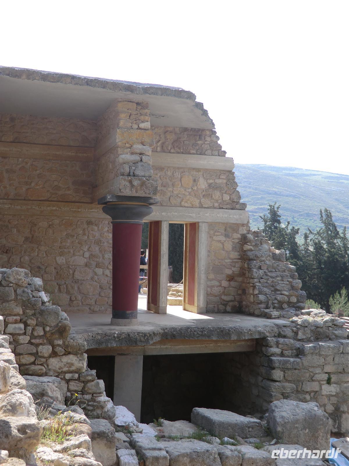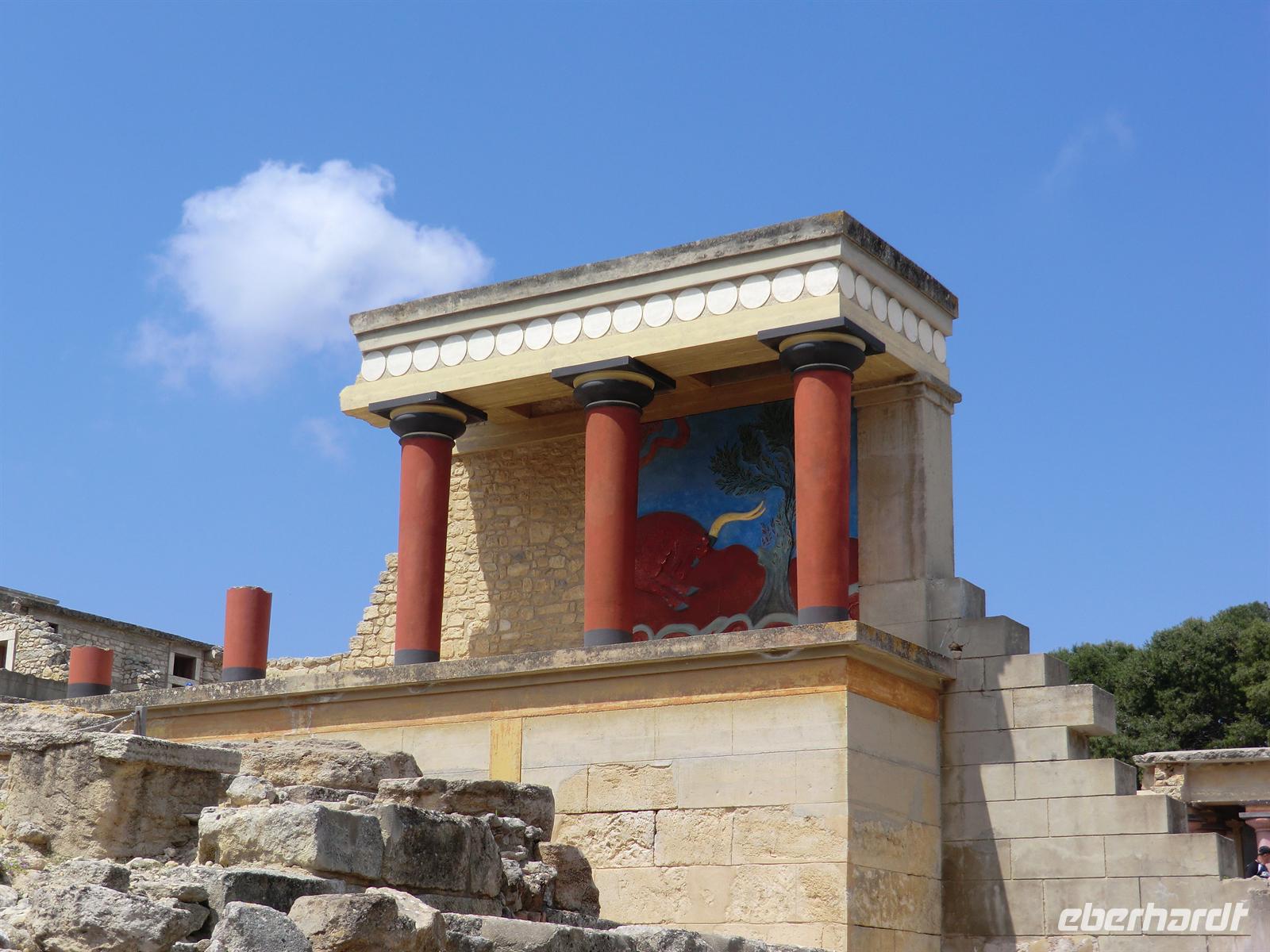 Frisch gestärkt begannen wir heute mit unserer ersten Erkundungsfahrt. 9 Uhr startete Nektarius den Motor in Richtung Knossos. Zunächst fuhren wir entlang der Küste die gleiche Strecke wie am Tag zuvor vom Flughafen aus. Das wunderbare Blau des Mittelmeeres begrüßte uns in voller Pracht. Der schneebedeckte Berg Ida - der mit 2.456 Metern höchste Berg der Insel - war heute von Wolken verhangen. Auf dem gestrigen Landeanflug konnten wir das Gebirge jedoch bestaunen. Auf der Fahrt führte uns Rena thematisch in die Zeit der Minoer ein, die ca. 2.000 Jahre v.Chr. die bombastische Palastanlage von Knossos geschaffen haben. Insgesamt sollen es über 1.500 Räume gewesen sein, die dieser Palast beherbergte. Heute lassen die mühevollen Ausgrabungen an jene Zeit erinnern und locken jährlich zehntausende Besucher in die geschichtsträchtige Region. Das religiöse Symbol der Doppelaxt lässt an zahlreichen steinernen Überresten an die Minoer erinnern.