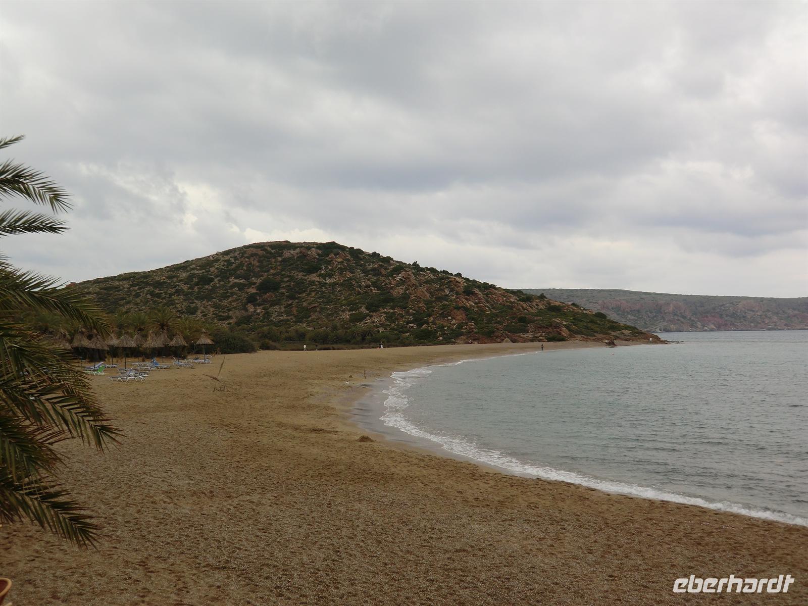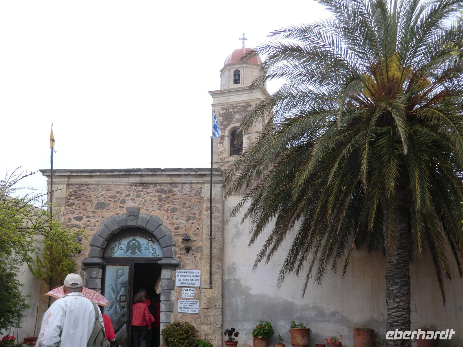 Heute meinte der Zeus es leider nicht gut mit uns. Am Morgen begrüßte uns das Trommeln des Regens und der Himmel empfing uns wolkenverhangen. Trotzdem starteten wir frohen Mutes zu unserem heutigen fakultativen Ausflug in den Osten von Kreta. 8:30 Uhr fuhren wir frisch gestärkt von einem reichhaltigen Frühstück in Richtung Malia - ein Ferienort, in dem vor allem junge Engländer in ihren Ferien die Nacht zum Tag machen. Im Bus begrüßte uns Rena mit einem kretischen Guten-Morgen-Lied mit dem schönen Text „Guten Morgen! Wie geht es dir? Ich liebe dich!“. Musikalisch ging es entlang der Küste vorbei an alten Getreidemühlen, Mandelbäumen und Eukalyptusbäumen weiter bis nach Gournia. In dieser Ausgrabungsstätte wurden die Grundmauern einer Jahrtausende alten Siedlungsanlage freigelegt, die auf die ehemalige Ortsstruktur schließen lassen. Eingebettet in die wunderbar grüne Bergwelt der Insel erbot sich uns ein schönes Fotomotiv. Entlang der Serpentinenstraße fuhren wir weiter bergauf und nach einem nächsten Hügel konnten wir die Hafenstadt Sitia mit ihren weißen Häusern erblicken. Durch die Stadt hindurch fuhr Nektarius weiter bis nach Toplou, wo wir 11 Uhr das berühmte Kloster des Ortes betraten. Die erste Attraktion war definitiv das türkische WC innerhalb der Anlage J Erleichtert führte uns Rena anschließend durch die Räumlichkeiten des Klosters, die insbesondere durch die zahlreichen Ikonen überzeugten. Nach einer kleinen Pause machten wir uns gegen 12:30 Uhr auf nach Vai - an den einzigen natürlichen Palmenstrand Europas. Im idyllischen Strandrestaurant wurden wir mit einem kühlen Raki (griechischer Schnaps) begrüßt, der uns, wenn die Sonne schon nicht schien, von innen wärmte. Nach einem leckeren Mittagessen erklommen wir die Steinstufen, die neben dem Restaurant auf eine kleine Anhöhe führten. Von oben hatte man einen