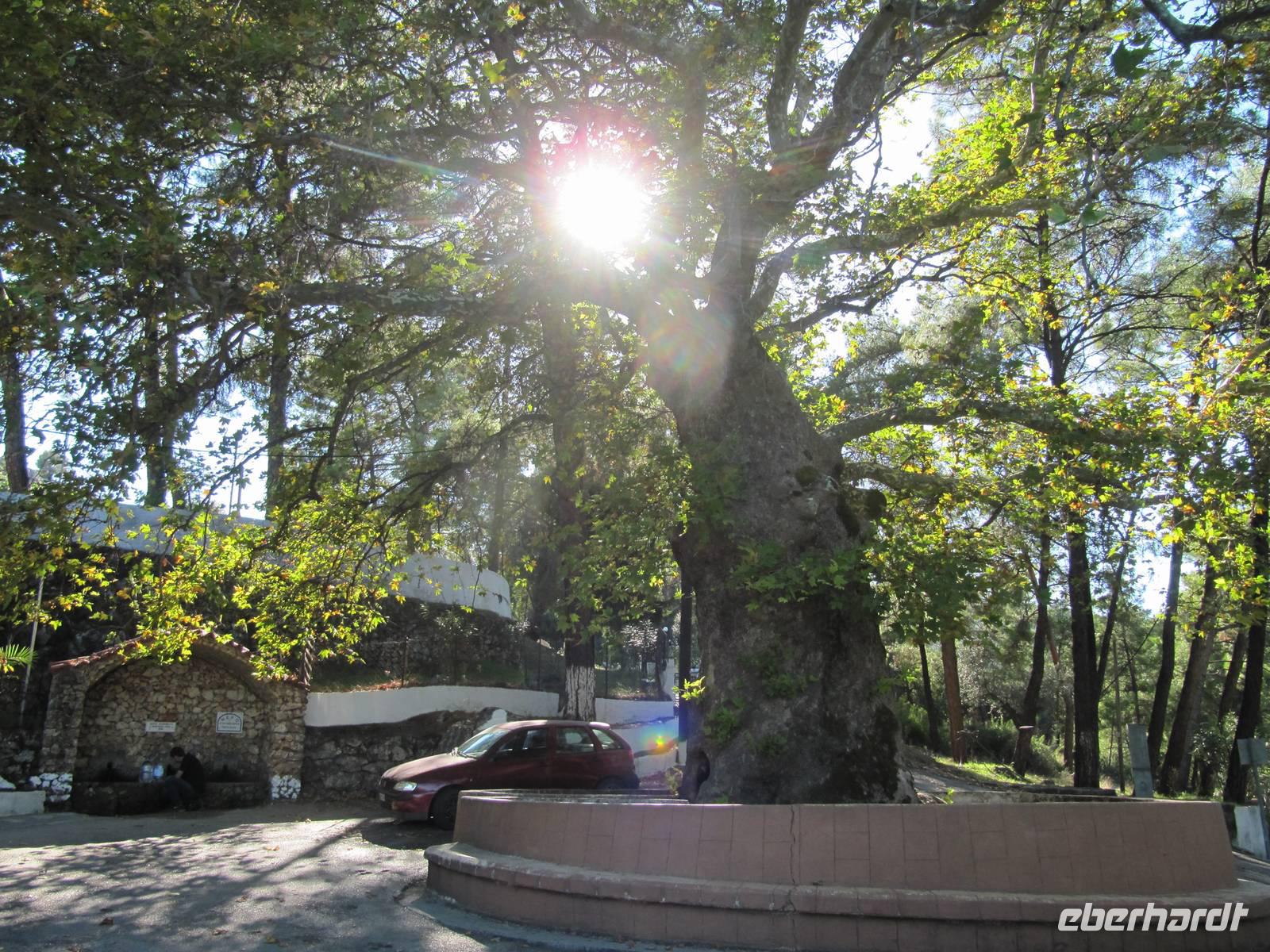 Das morgendliche vielfältige kulinarische Angebot des Hotels genossen wir und trafen uns um 9 Uhr vor dem Hotel mit Maria zu unserer Fahrt gen Westen ... Die wunderschöne Westküste der Insel wartete darauf, von uns besichtigt und mit allen Sinnen erlebt zu werden. Auf dem Weg dahin berichtete uns Reiseleiterin Maria von Sagen, Traditionen, Mythen und Sitten und der spannenden Geschichte des Landes. Wir erwarben erneut Expertenwissen aus erster Hand. Auf dem Weg zu unserem ersten Halt in Siana hielten wir an einem Aussichtspunkt, an dem wir die Inseln Griechenlands von Weitem bestaunen und fotografieren konnten. Eine Ziege hatte es uns allen angetan :-) In Siana angekommen probierten wir den guten und hochprozentigen Obstler sowie den örtlich produzierten Honig und in Rhodos gepresstes Olivenöl mit Brot. Welch Genuss! Im Anschluss besuchten wir die Kirche von Siana und hatten die Möglichkeit, die Stadt auf eigene Faust zu erkunden oder in den bunten Lädchen und Ständen zu Stöbern. Mit dem Bus fuhren wir weiter nach Monolithos. Dieser setzte uns hier ab und wir stiegen hinauf zum Kastell, von dem wir einen wunderschönen Panoramablick genießen konnten und wir zahlreiche Bilder zur Erinnerung schossen. Wir fuhren weiter und gingen in eine Taverne, in der wir das leckere einheimische Essen der Einwohner von Rhodos genießen durften. Anschließend stöberten wir noch in den ansässigen Souvenirläden und der ein oder andere erwarb tolle griechische Mitbringsel. In Embonas besichtigten wir ein ursprünglich rhodisches Haus, dessen Geschichte uns Maria mit ihrer lebensfrohen Art näherbrachte und freuten uns im gleichen Zug auf die Kostprobe verschiedener Weine und Ouzo mit Kaffee, dessen Geschmack wohl die Wenigsten von uns bereits kannten und den wir sehr genossen. Trotz der vielen mehr oder weniger gefährlichen Kurven, brachte der Busfahrer uns sicher zum nächsten Besichtigungspunkt. Eine 1.500 Jahre alte Platane an einer frischen Quelle, die wir auch verkosteten. Welch´ kostbare Erfrischung an so einem herrlich sonnigen Tag! Nachdem wir die Westküste besichtigt hatten, fuhren wir zurück ins Hotel, wo wir uns zum Abendessen trafen. Am Abend genossen wir ein wenig das Programm vom Hotel.