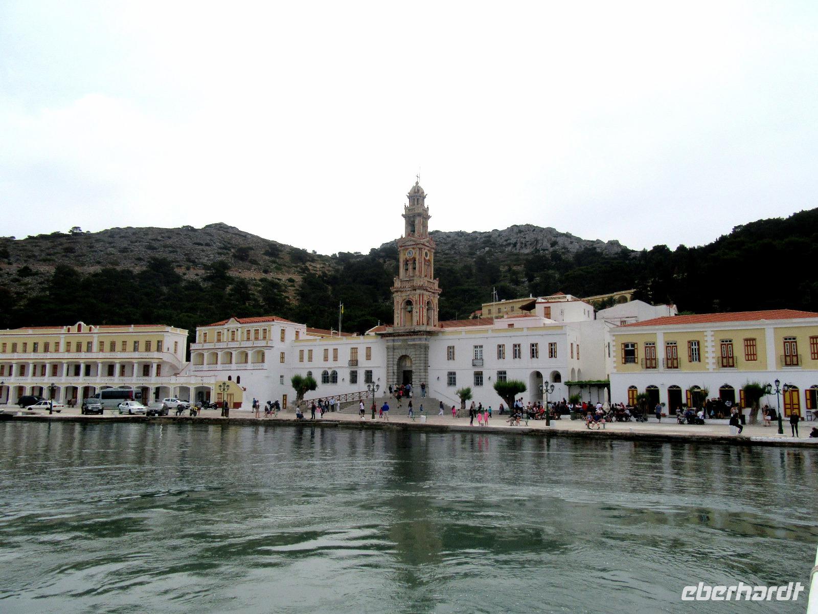 Nach ca. 90 Minuten Bootsfahrt legen wir einen Stopp an der Südwestküste ein, wo das Kloster Panormitis direkt über der Bucht steht.