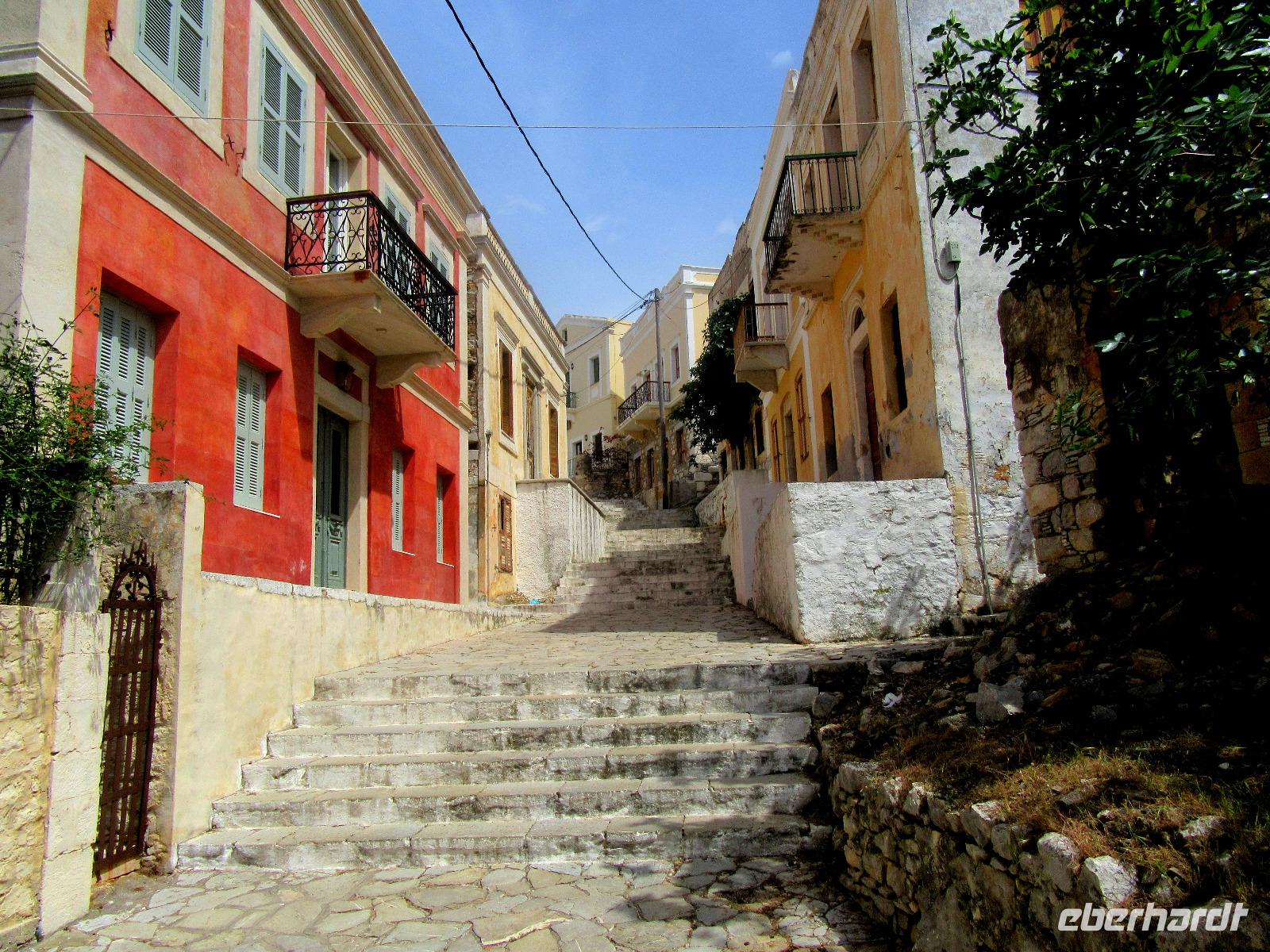 Nach ca. einer Stunde Aufenthalt geht unsere Fahrt weiter nach Symi. Bei Ankunft kann man schon die schönen Kapitänshäuser bestaunen und als wir nach wenigen Minuten die Promenade erreichen stoßen wir schon auf Verkaufsstände mit den traditionellen Besen und den Schwämmen, die diese Insel bekannt gemacht haben.
