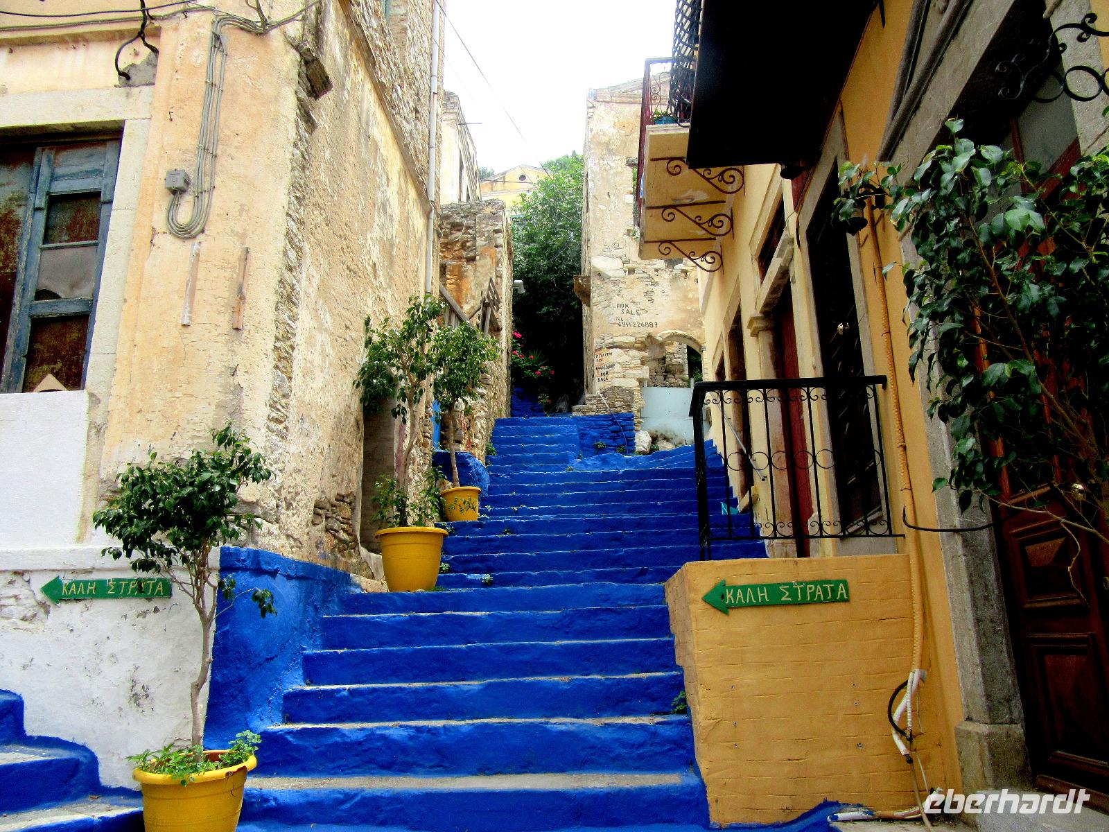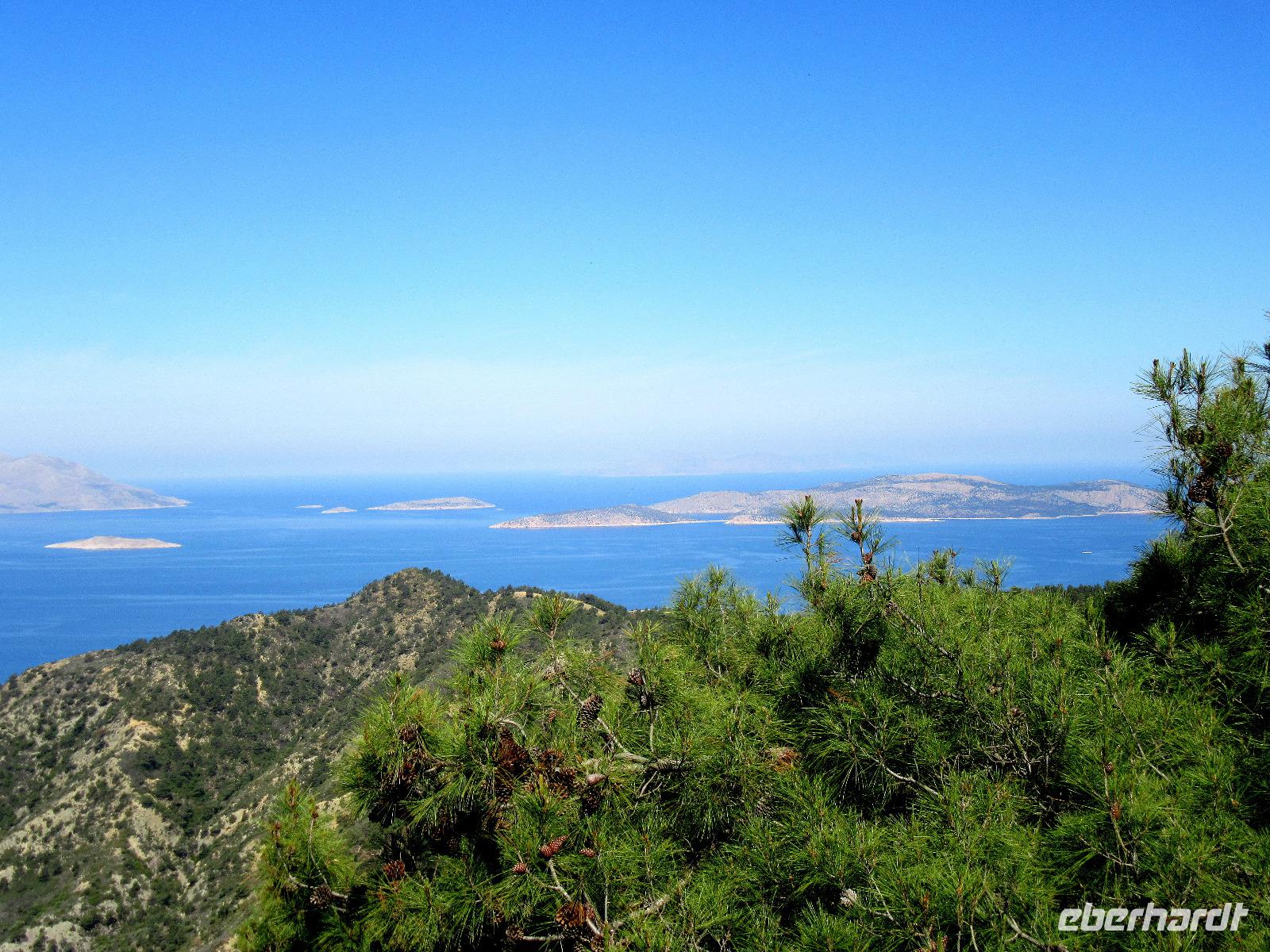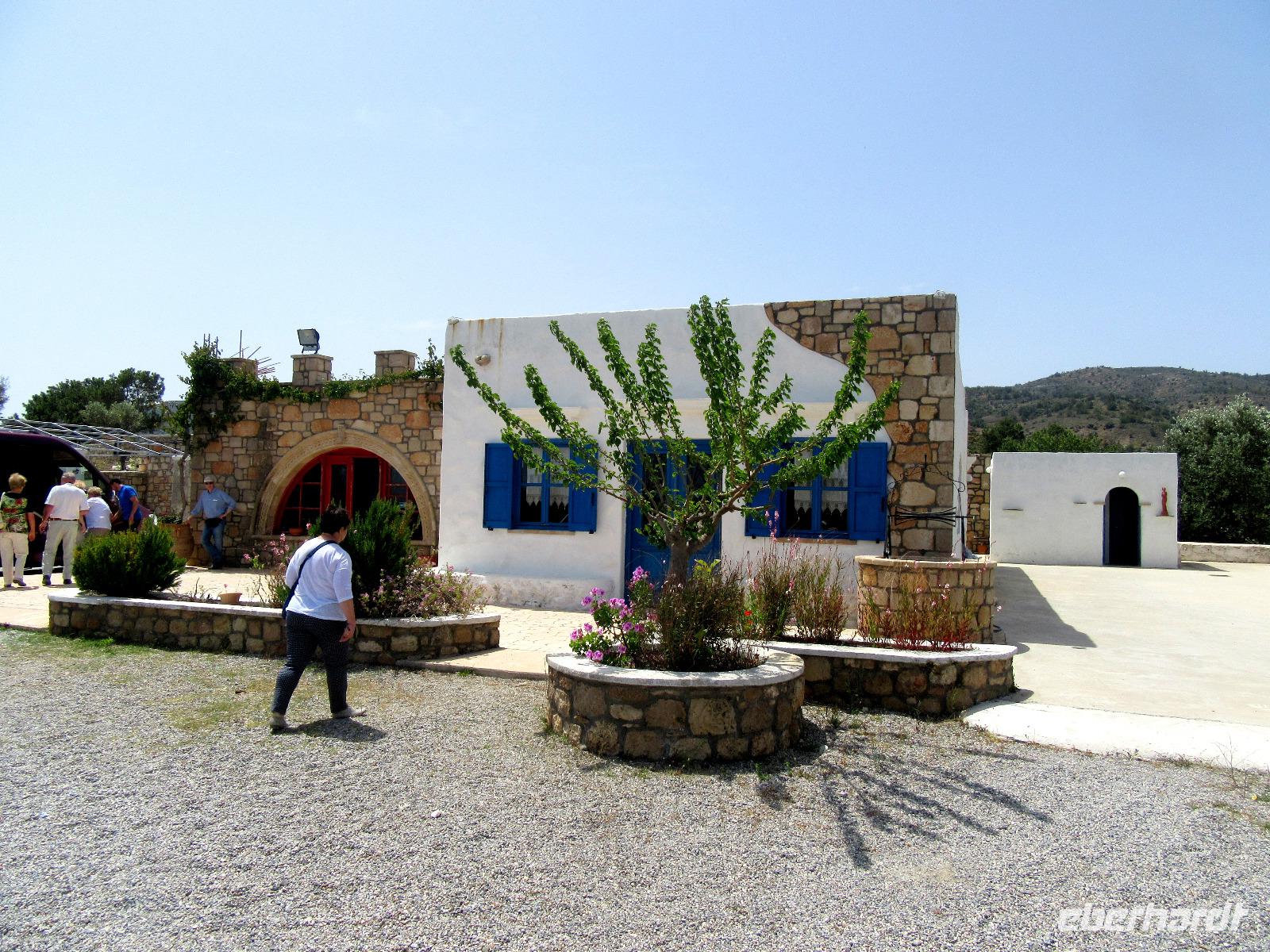 Heute führt uns die Fahrt entlang der Westküste. Wir fahren entlang des ägäischen Meeres mit einer grünen hügeligen Landschaft. Hier leben die Einheimischen vorwiegend von der Landwirtschaft. Wir sehen weite Felder und ab und an auch die eine oder andere Ziege. Nach einem kurzen Fotostopp bei Kritina, wo wir einen herrlichen Blick über die vorgelagerten Inseln haben, machen wir unseren ersten Halt im Imkerdorf Siana. Wir besichtigen die imposante heilige Kirche, die der seligen Anna gewidmet wurde. Außerdem ist Siana bekannt als kleines Straßendorf mit einheimischen Läden. Maria führt uns in einen solchen Laden und wir verkosten den aus Weintrauben hergestellten Suma, sowie einen hausgemachten Zimt-, Orangenlikör.