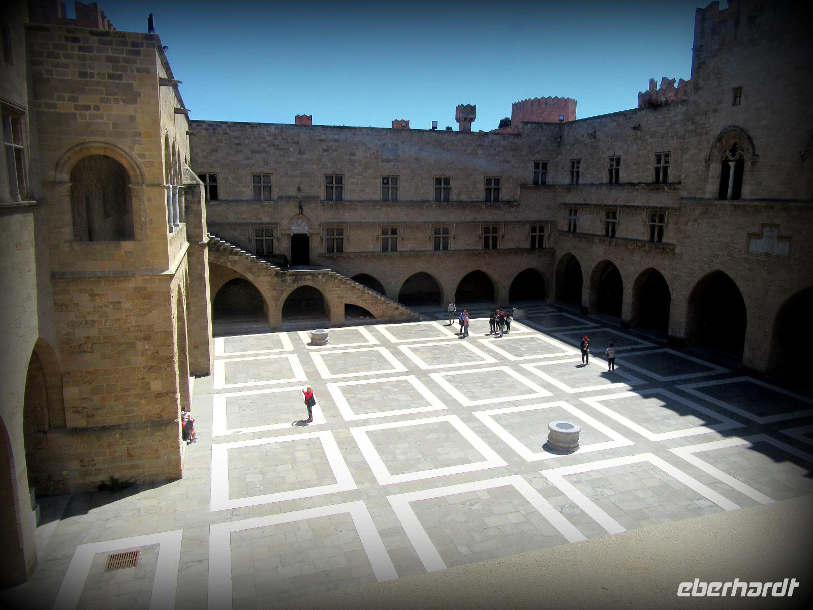Anschließend besichtigen wir noch den Großmeisterpalast, ein imposantes Bauwerk aus dem 14. Jahrhundert. Ein Teil wurde im 19. Jahrhundert zerstört und unter italienischer Herrschaft um 1940 wieder aufgebaut. Original erhalten sind noch die eindrucksvollen Türme im Eingangsbereich.