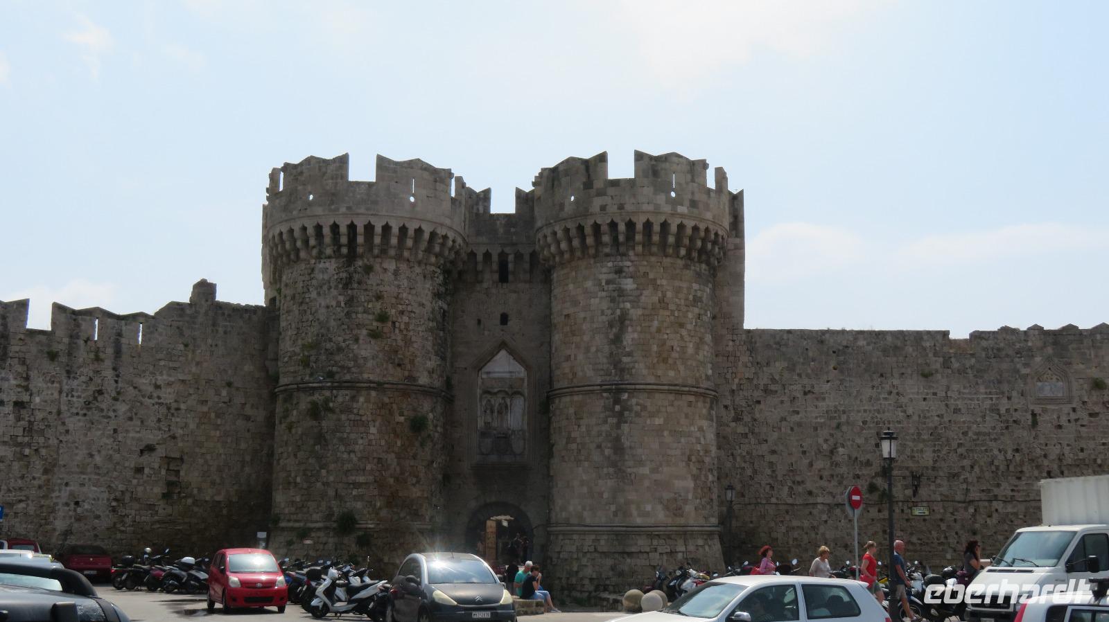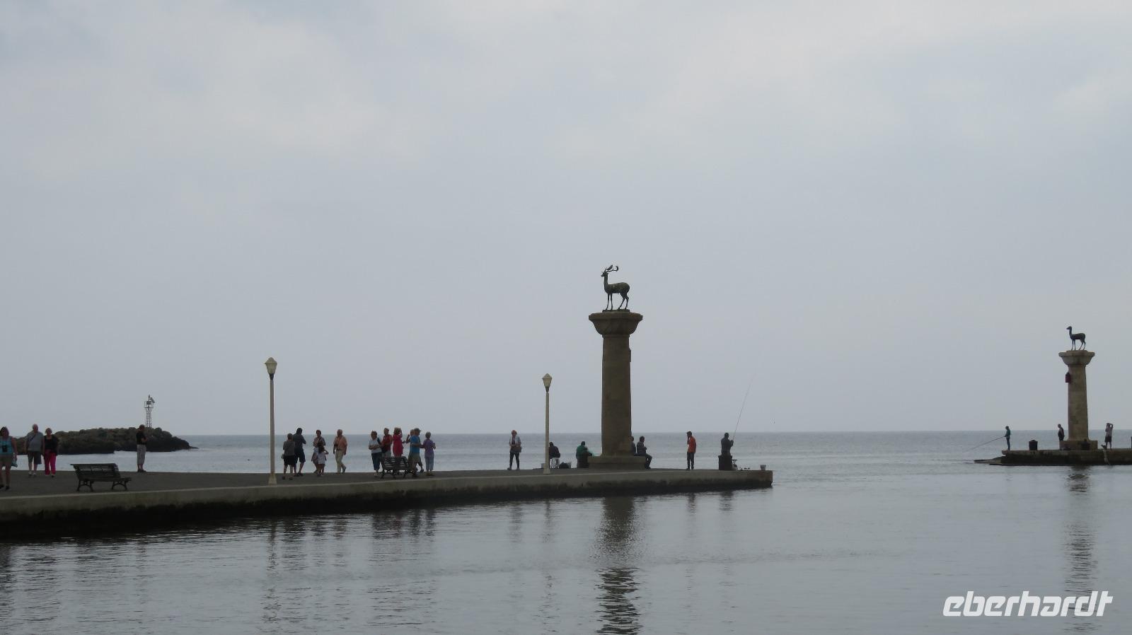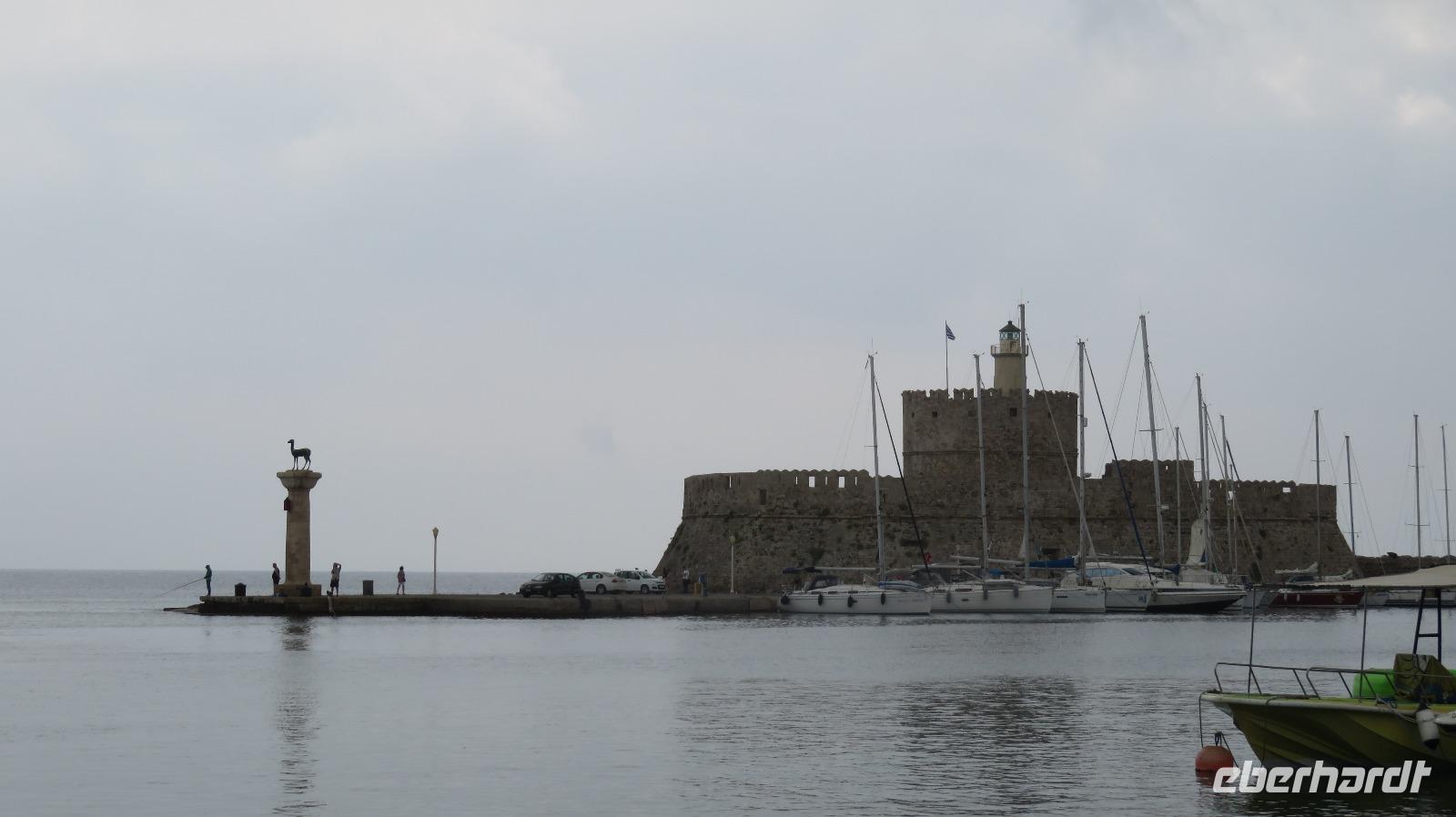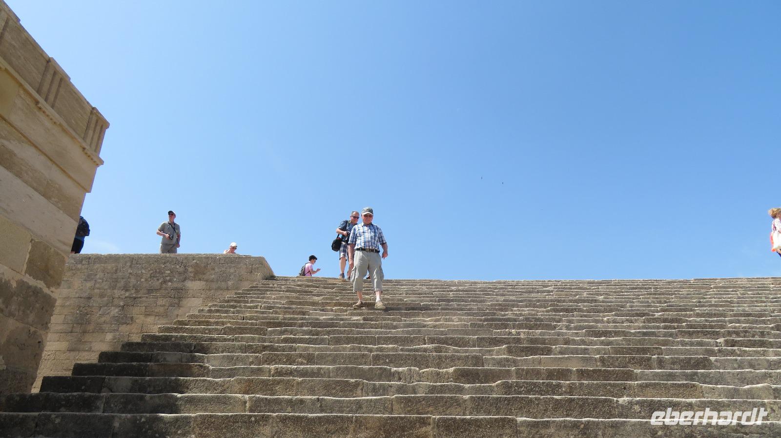 Nach einem guten Frühstück starteten wir um 9 Uhr mit unserem Reiseleiter nach Rhodos. Entlang der großen Hafenmauer gelangten wir zum Hafen Mandraki, wo wir unseren ersten Stopp machten. Von hier konnte man den Hirsch und die Hirschkuh an der Hafeneinfahrt gut sehen. An dieser Stelle soll früher auch der Koloss von Rhodos gestanden haben, die riesige Bronzestatue des Sonnengottes Helios, die zu den 7 Weltwundern der Antike zählt. Aber ob das wirklich wahr ist, oder doch nur eine Sage, kann Niemand sagen. Dann ging es weiter zur Akropolis, wo wir die Säulen des Apollo Tempel sahen, leider ist nur noch wenig übrig von der großen Tempelanlage. Dafür ist das Stadion noch gut erhalten. Hier wurden schon olympische Spiele durchgeführt.