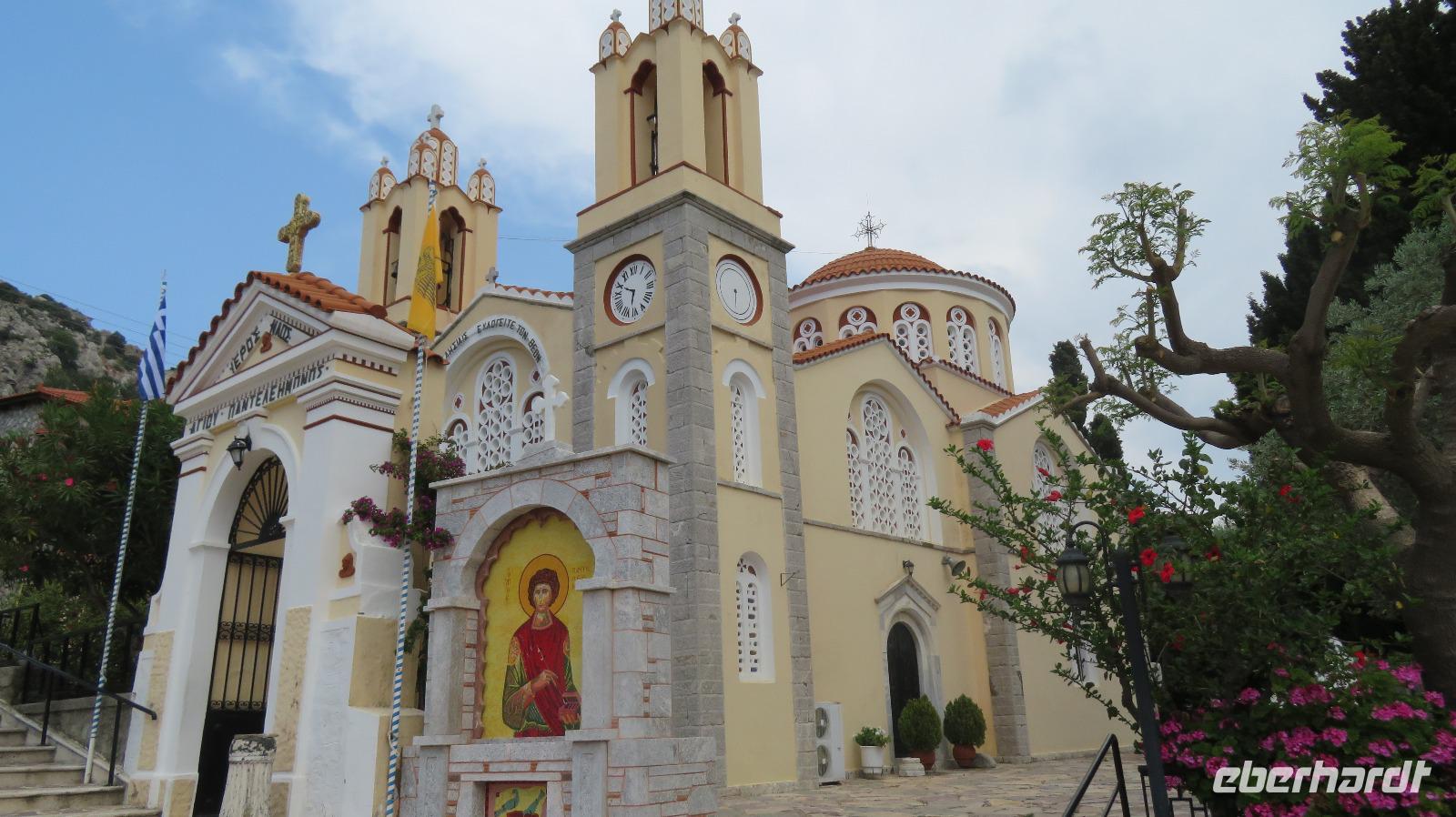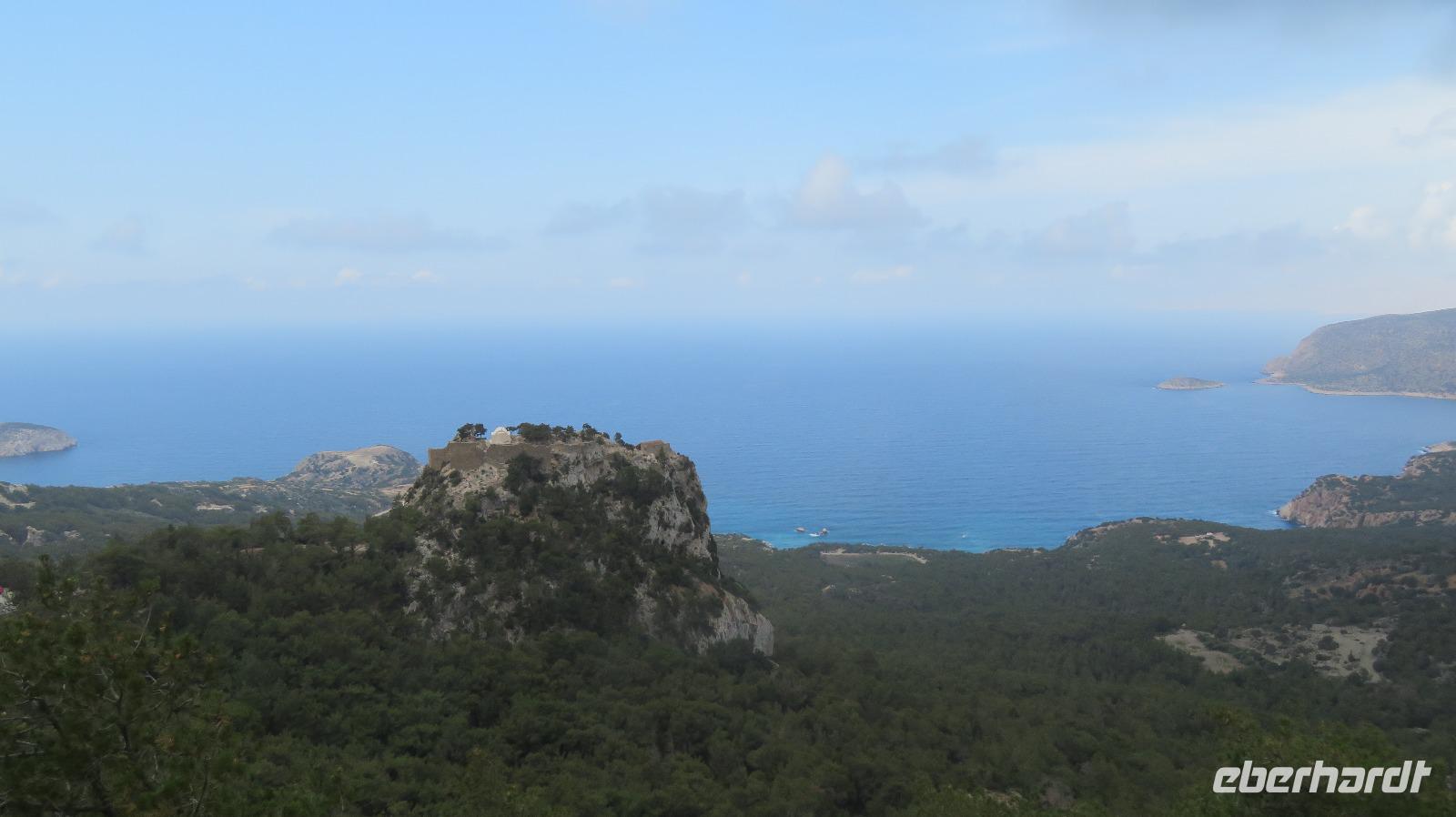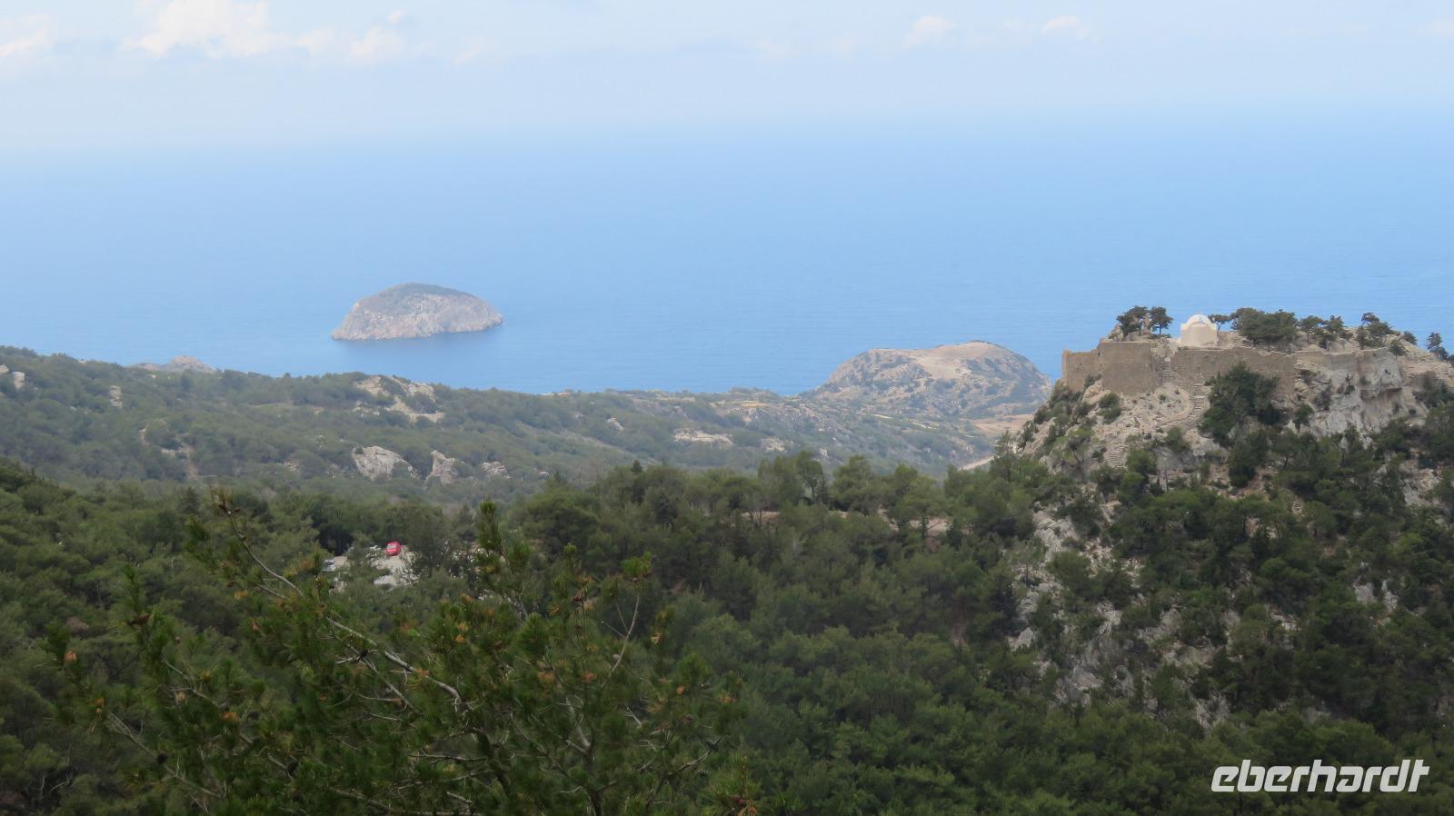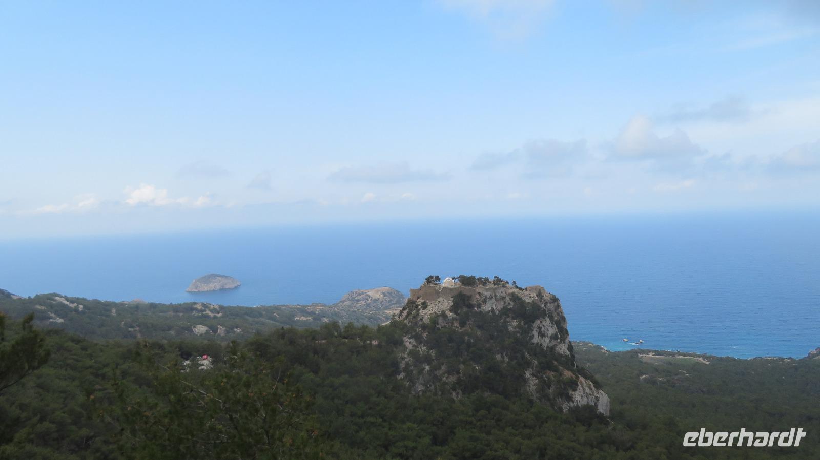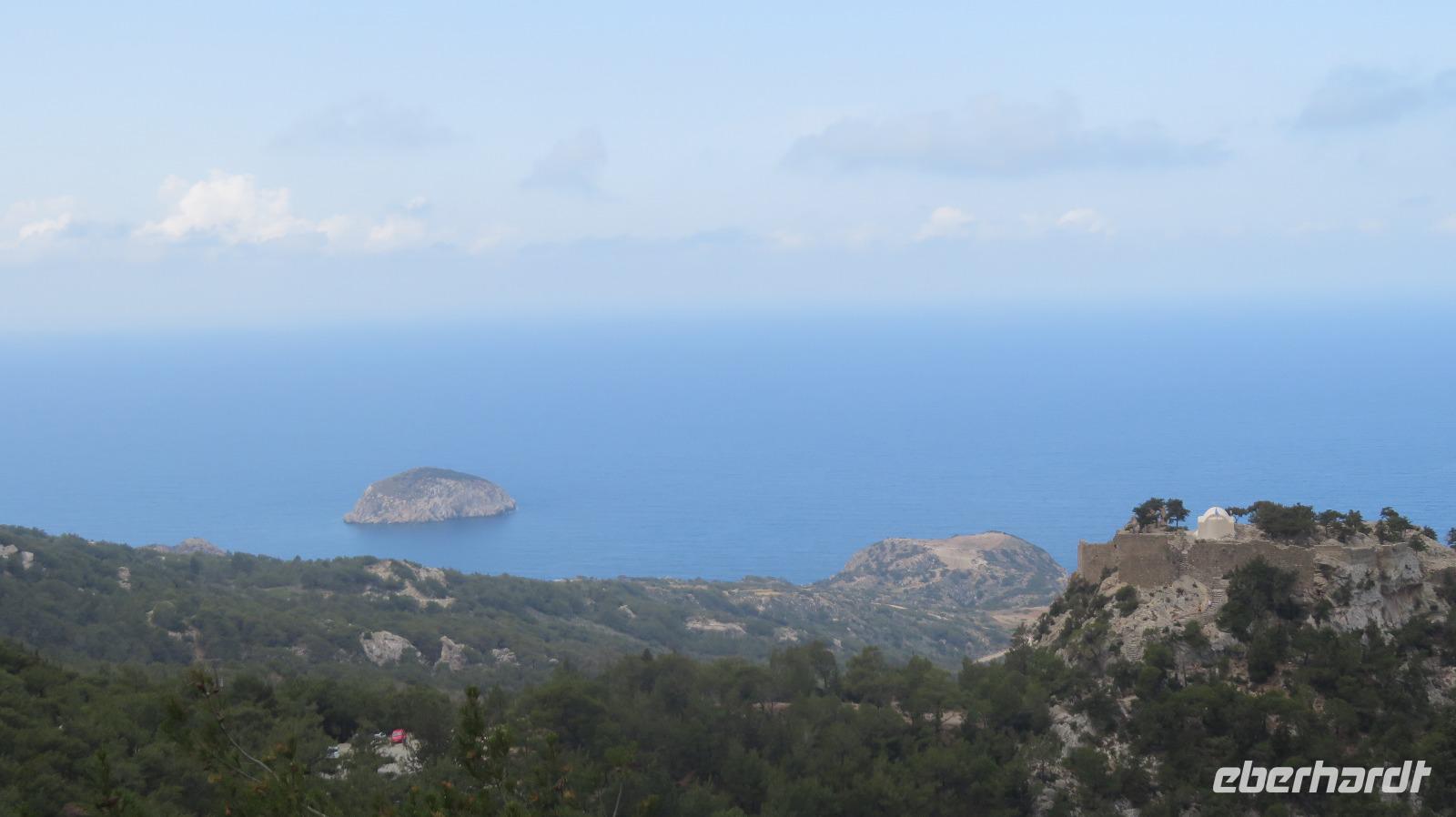 Pünktlich starteten wir wieder gemeinsam mit Manolis zur Westküste. Den ersten Halt machten wir an der kleinen weißen Kapelle - Agios Nikolaos Fountoukli. An einem schönen Hotel, das man sich eher in den Alpen vorstellen könnte, machten wir Kaffeepause. Wir konnten einen Blick auf das Kastell Monolothos werfen, leider kann man es nicht mehr besichtigen. Die alte Johanniterfestung aus dem 15. Jh. liegt auf einem Felsen und wir hatten einen tollen Blick auch auf das Meer. In Siana besichtigten wir die schöne Kirche. Interessant ist die Kirchturmuhr, die nur aufgemalt ist.