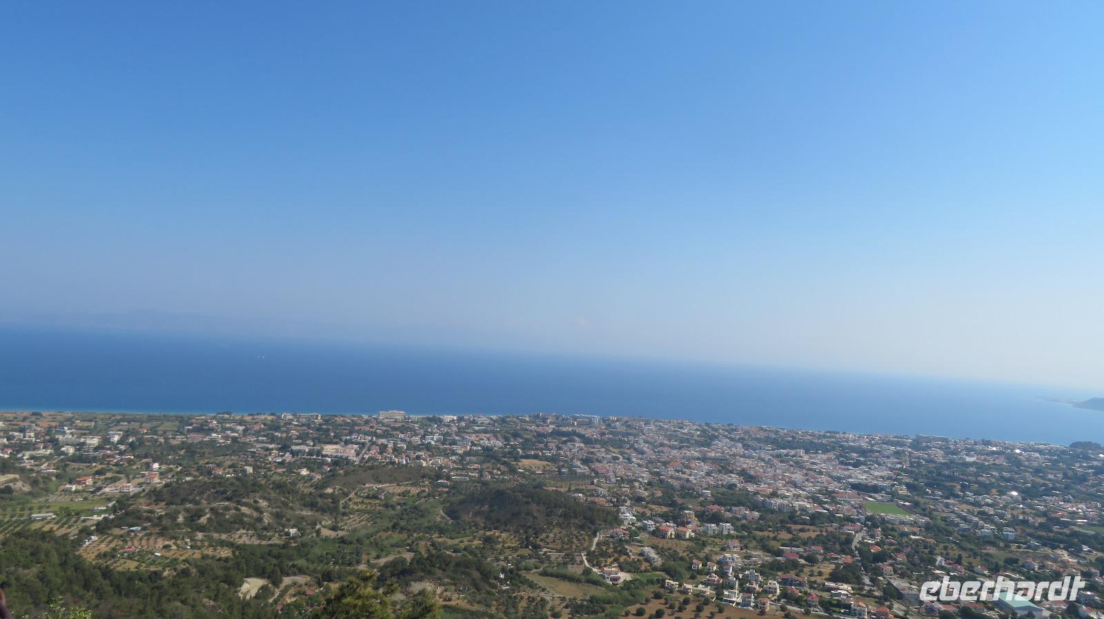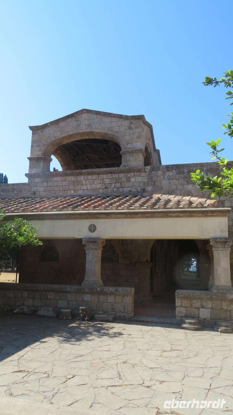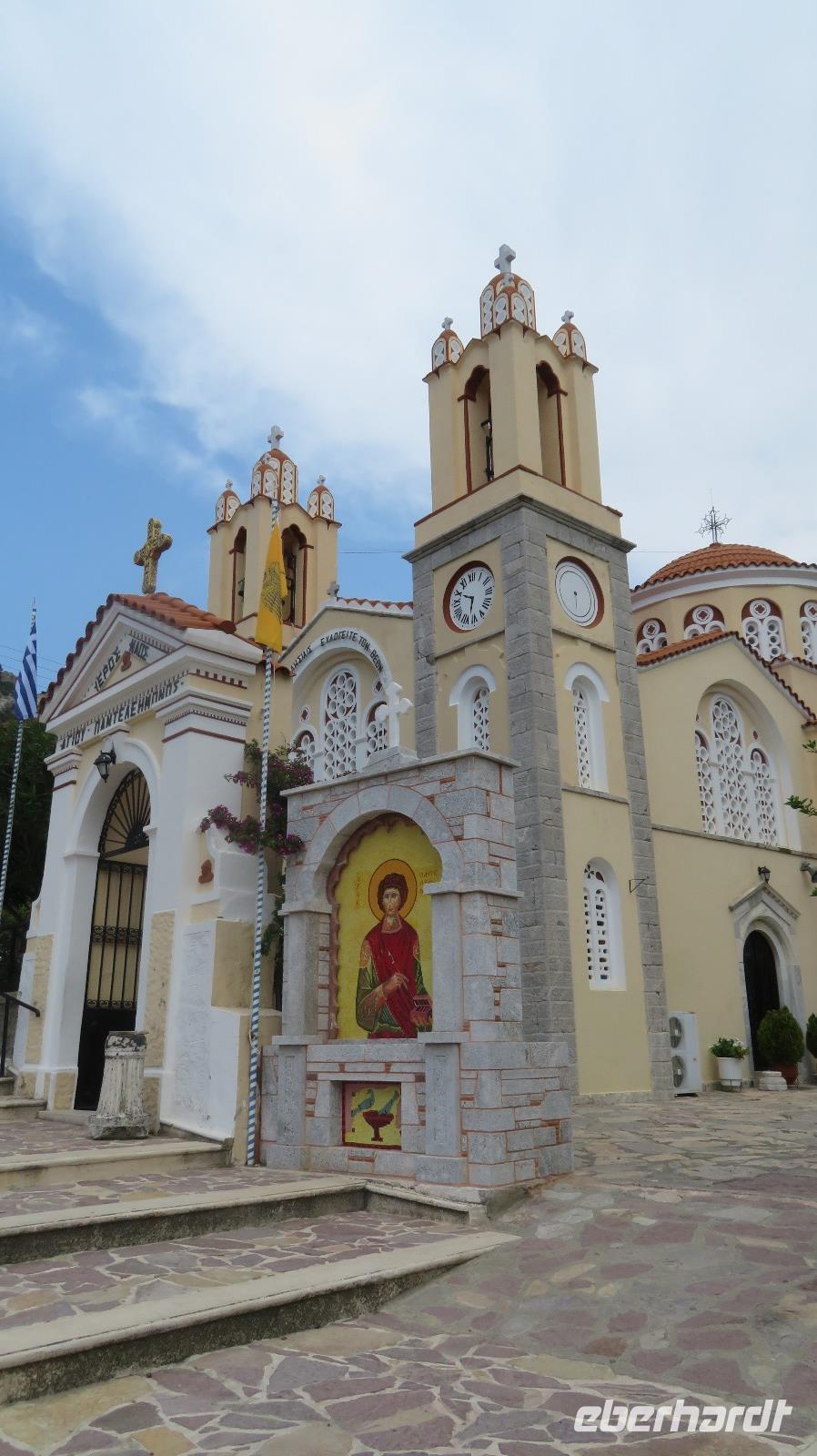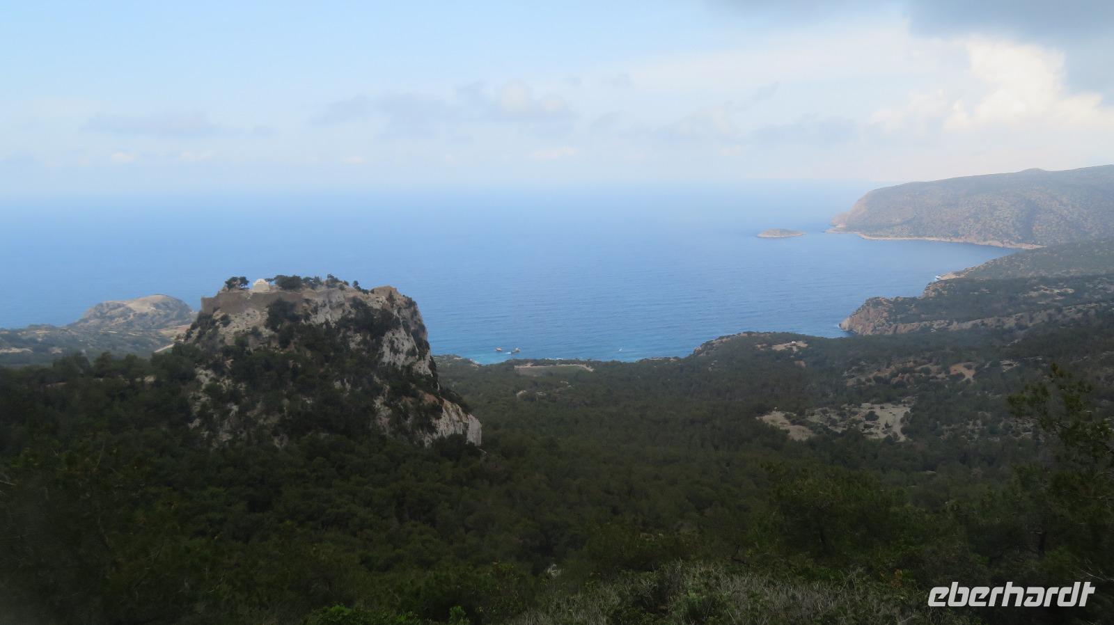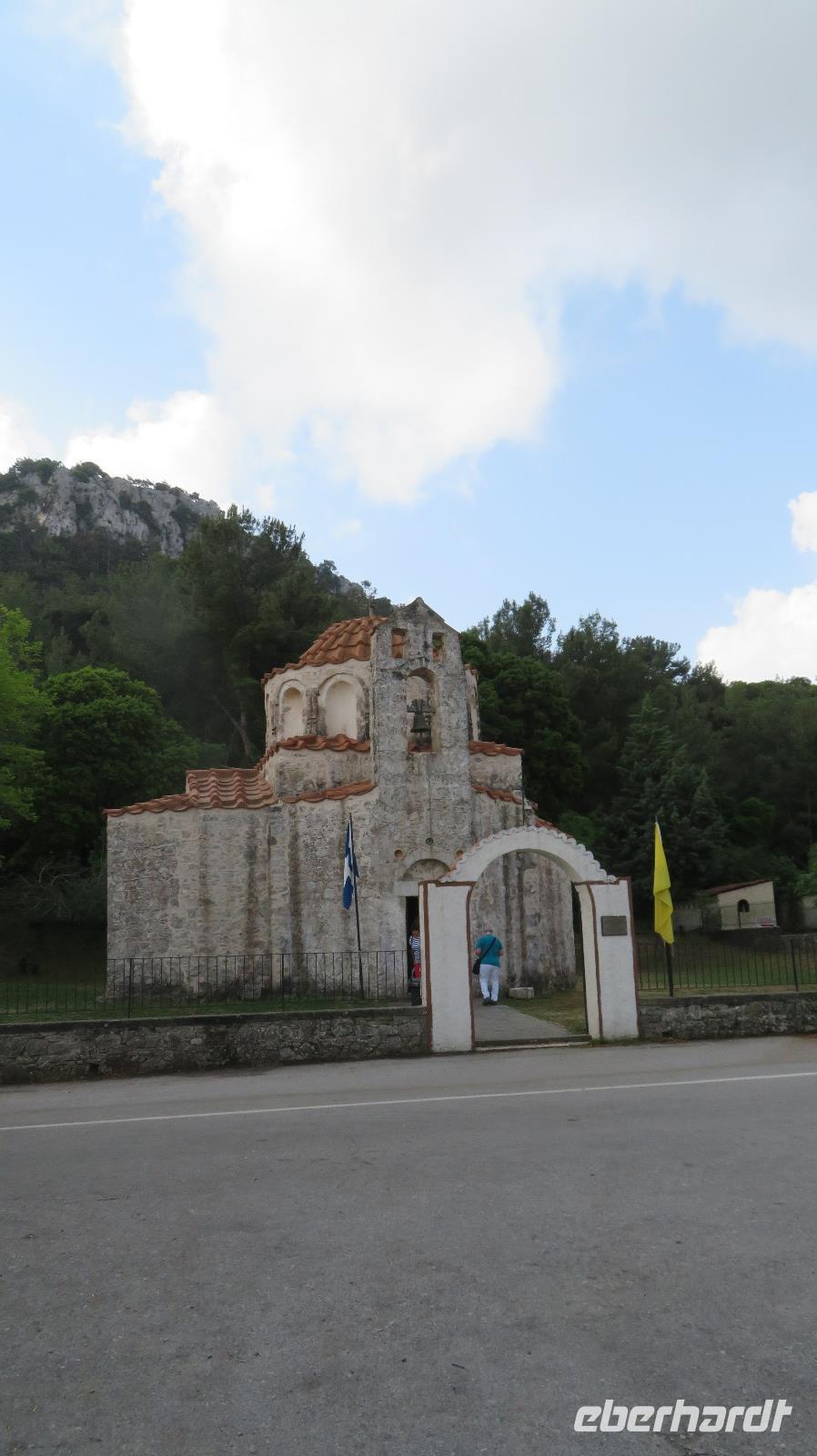 Pünktlich starteten wir wieder gemeinsam mit Manolis zur Westküste. Den ersten Halt machten wir an der kleinen weißen Kapelle - Agios Nikolaos Fountoukli. An einem schönen Hotel, das man sich eher in den Alpen vorstellen könnte, machten wir Kaffeepause. Wir konnten einen Blick auf das Kastell Monolothos werfen, leider kann man es nicht mehr besichtigen. Die alte Johanniterfestung aus dem 15. Jh. liegt auf einem Felsen und wir hatten einen tollen Blick auch auf das Meer. In Siana besichtigten wir die schöne Kirche. Interessant ist die Kirchturmuhr, die nur aufgemalt ist.