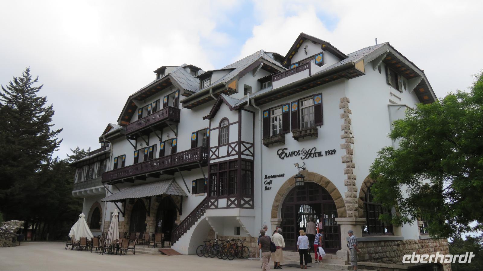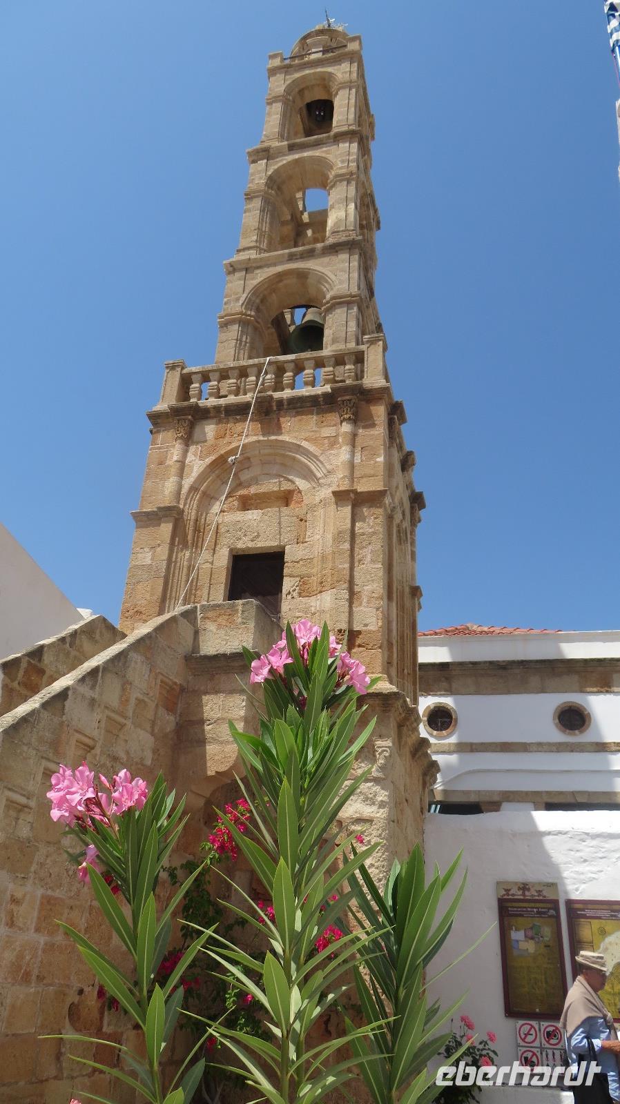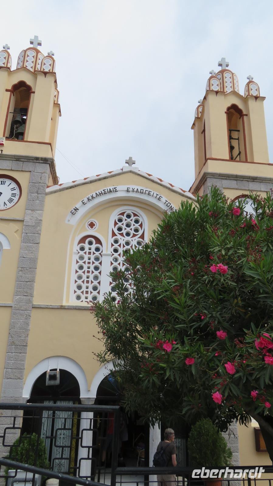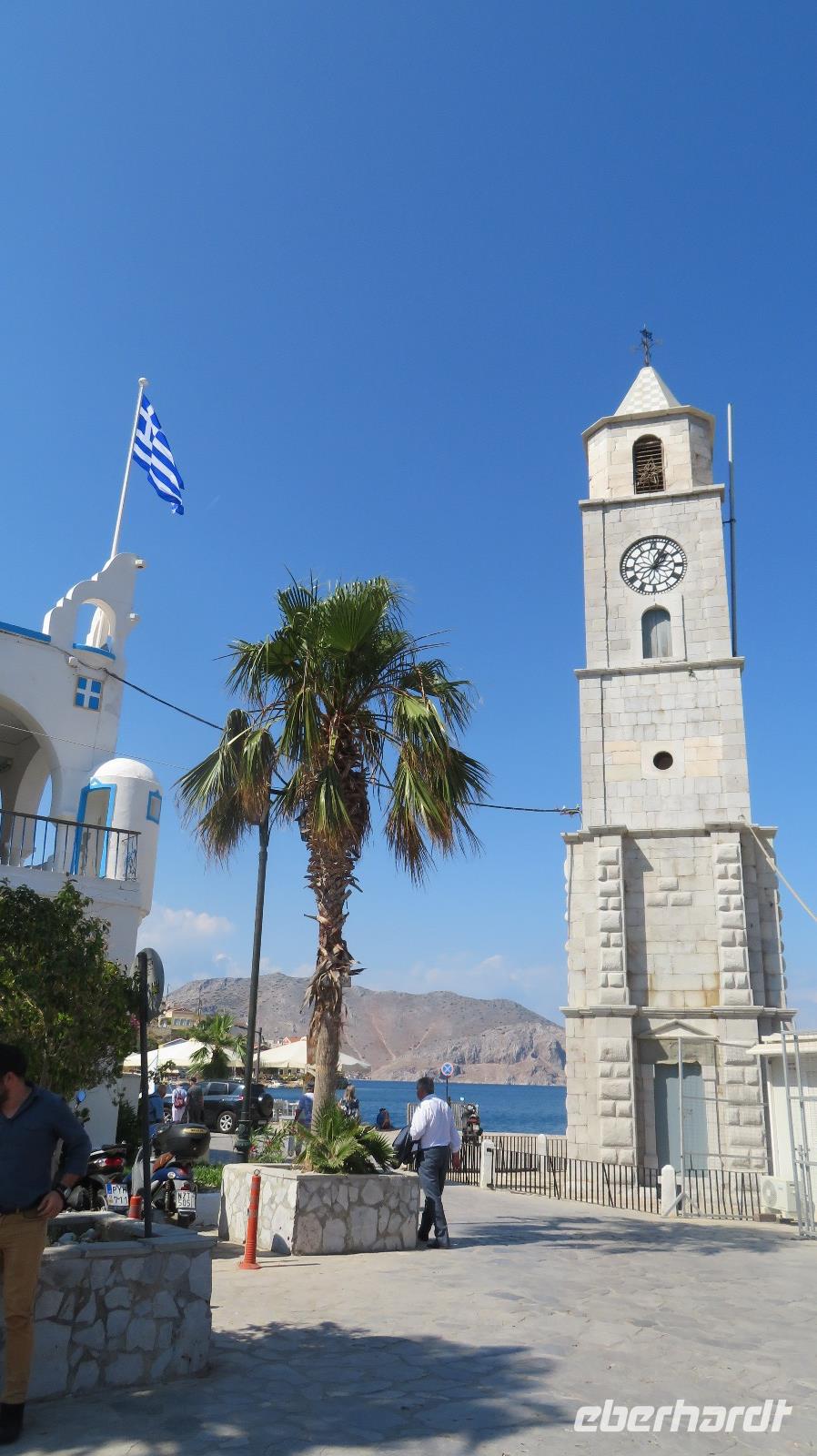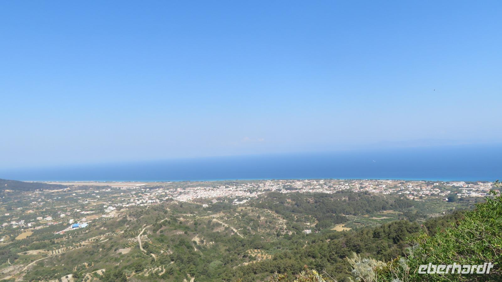 Pünktlich starteten wir wieder gemeinsam mit Manolis zur Westküste. Den ersten Halt machten wir an der kleinen weißen Kapelle - Agios Nikolaos Fountoukli. An einem schönen Hotel, das man sich eher in den Alpen vorstellen könnte, machten wir Kaffeepause. Wir konnten einen Blick auf das Kastell Monolothos werfen, leider kann man es nicht mehr besichtigen. Die alte Johanniterfestung aus dem 15. Jh. liegt auf einem Felsen und wir hatten einen tollen Blick auch auf das Meer. In Siana besichtigten wir die schöne Kirche. Interessant ist die Kirchturmuhr, die nur aufgemalt ist.