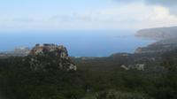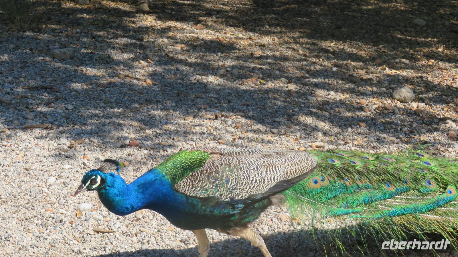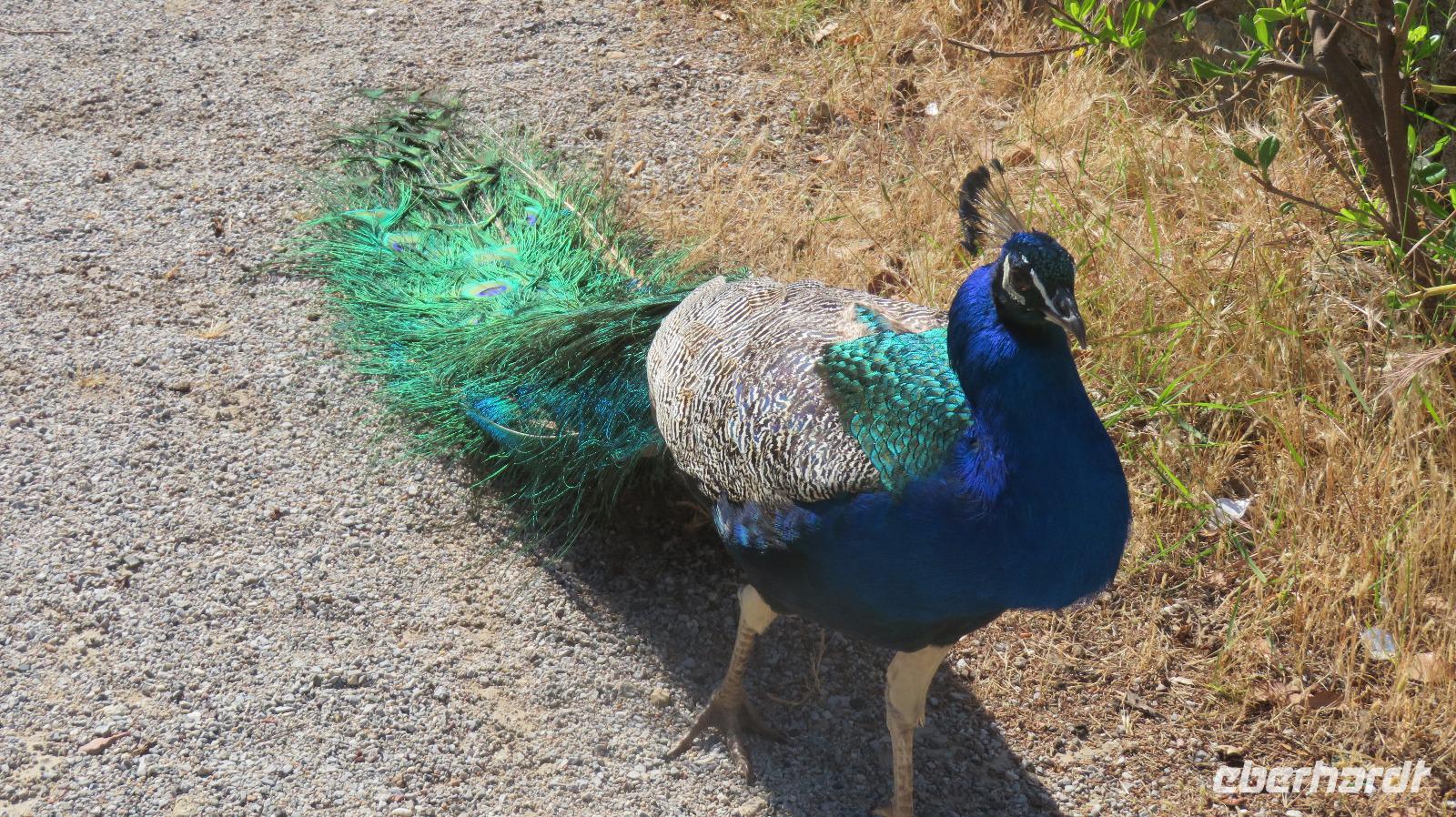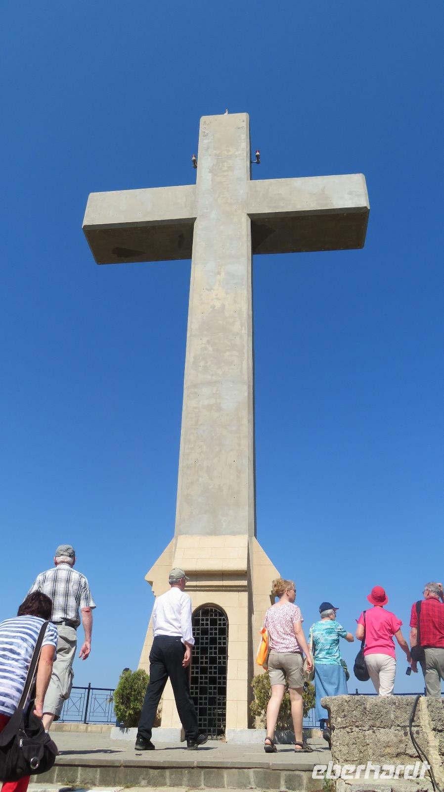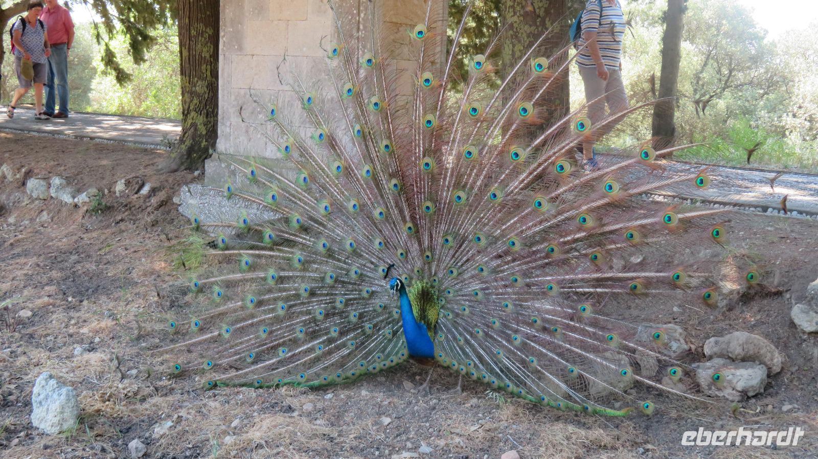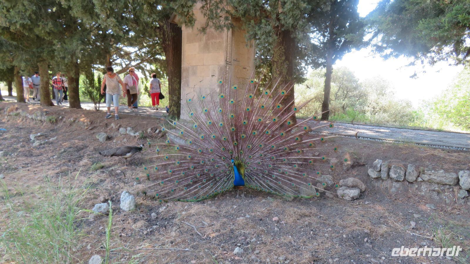 Schon von weitem kann man das große Kreuz sehen, das oben am Berg ist. Hoch oben auf dem Filerimos Berg angekommen staunen wir aber zuerst über die vielen Pfaue, die überall auf der Anlage sind. Wir schauen uns die Ruine der Festungsanlage und das Kloster an auch die Rest des Athene Tempels und die Kirche.